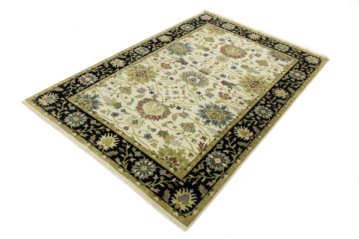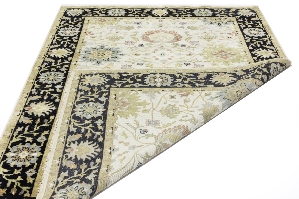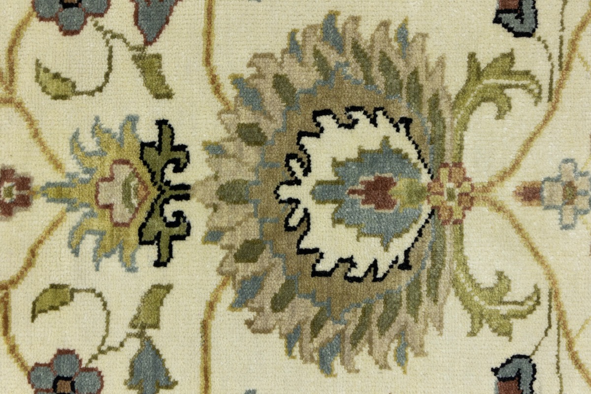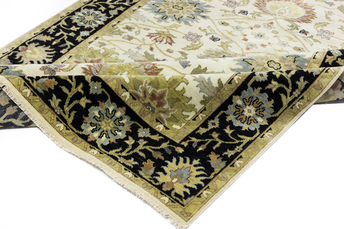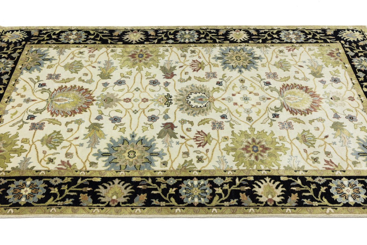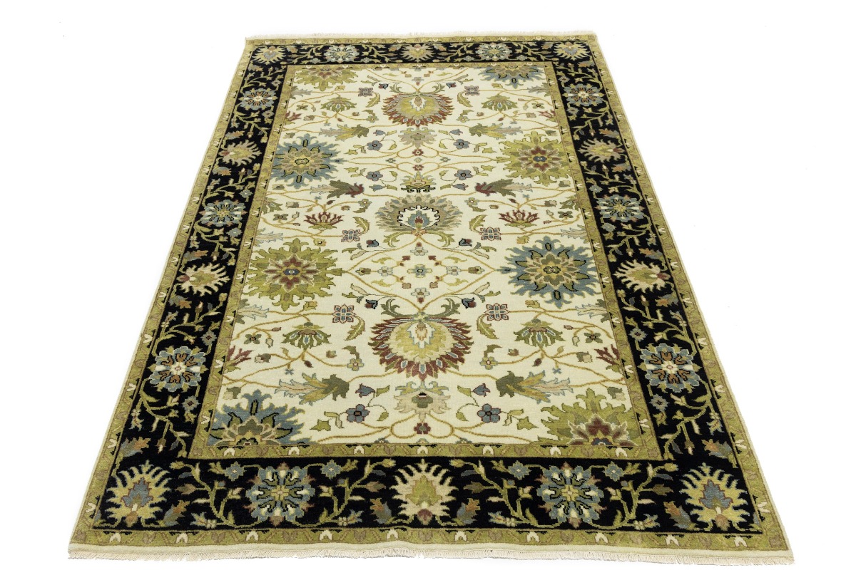 This genuine 6X9 cream new Oriental rug was made by the hands of gifted weavers inspired by a variety of spectacular artistic designs, to recreate the aged look of the original piece with a richness of color and ornately patterned background field. What set this vintage style Oriental area rug from the others are the material and dye used (wool pile and cotton foundation), knot count, ancient designs, fantastic grades, and its regional historical connection: it has deep roots, from the story of the people who produced it to the meaning of the symbols and colors displayed across its canvas that have been praised for centuries. This Indian home décor carpet will be completely cozy and inviting that never will go out of style! Also, this Oriental rug would be among your most valuable treasures, it is a great investment that accrues value over time, and it will last for generations because was woven with high-quality, all-natural wool. Environmentally friendly, opulent yet affordable; this rug will give you a thorough amount of character to help define your living space with elegance and warmth that will capture the eyes and attention of your audience (homeowners, designers, decorators, family and friends). OT-8693