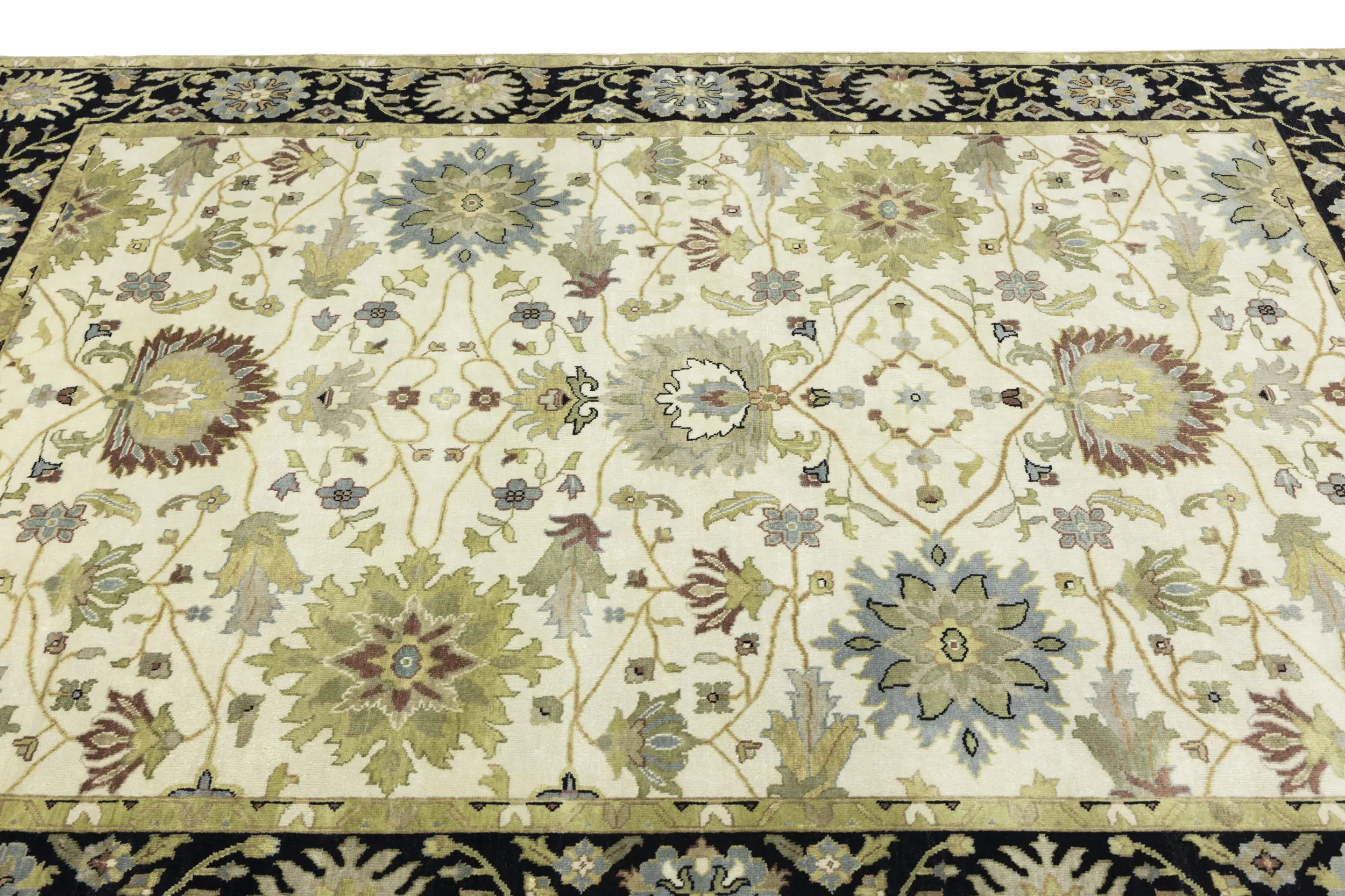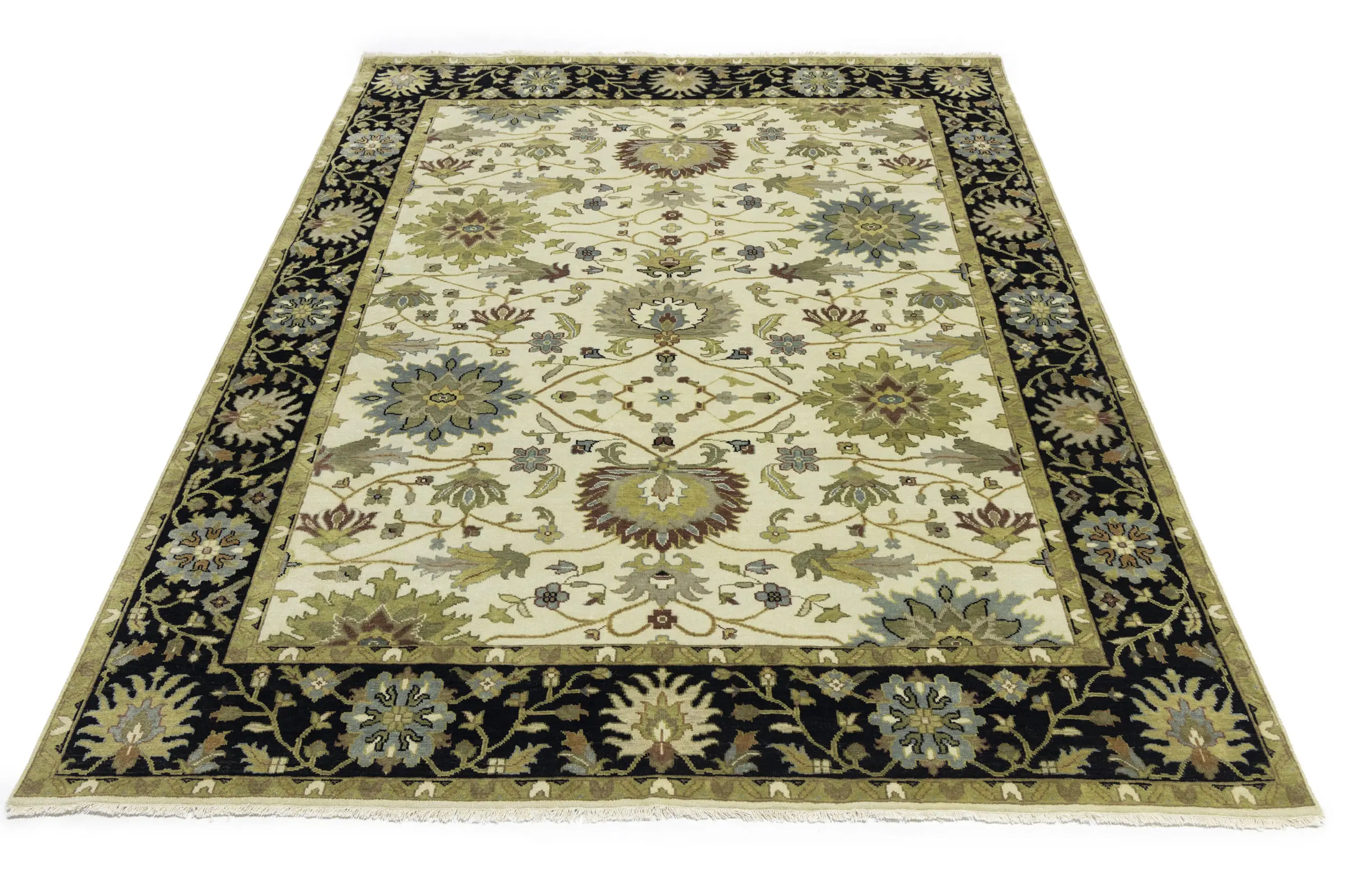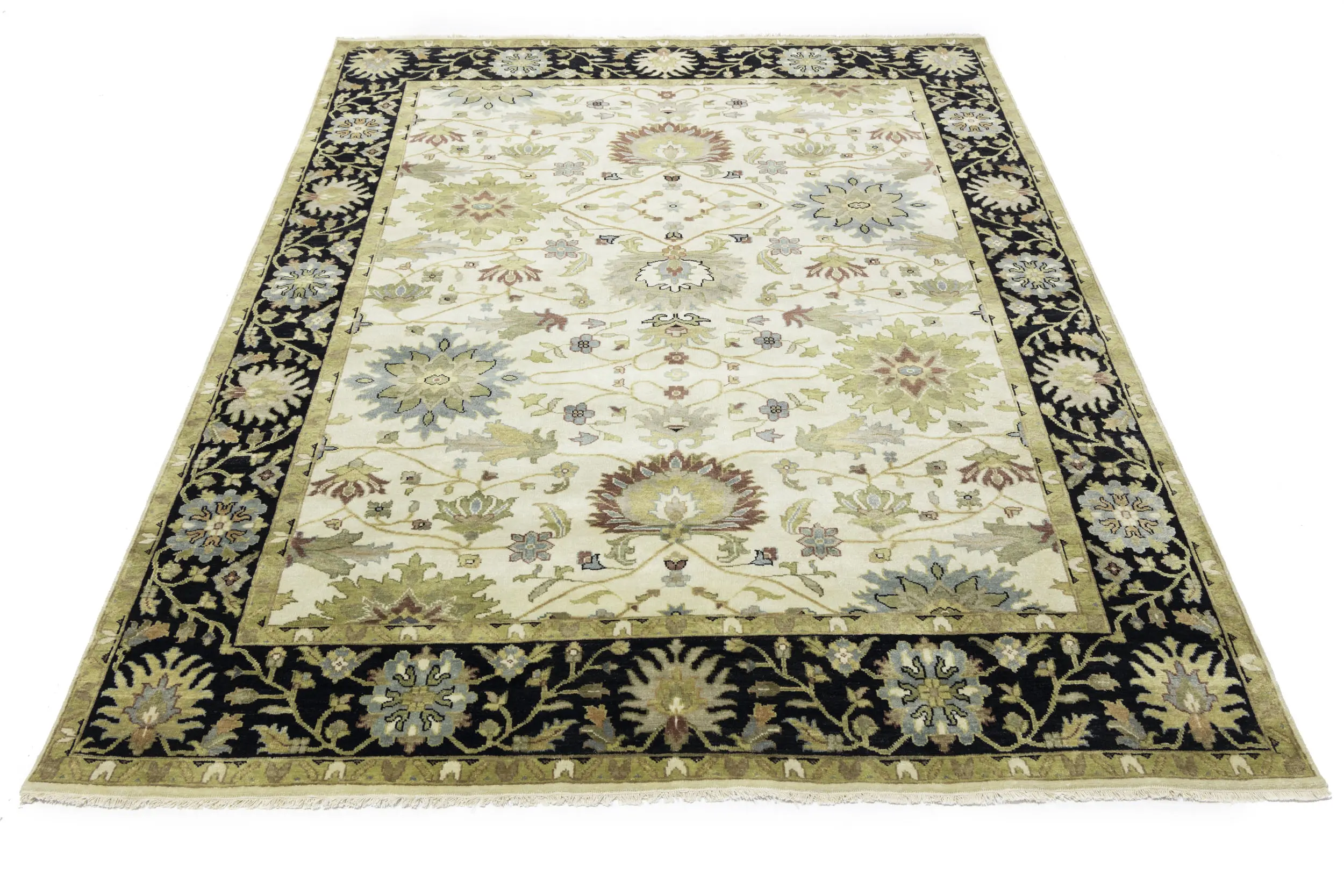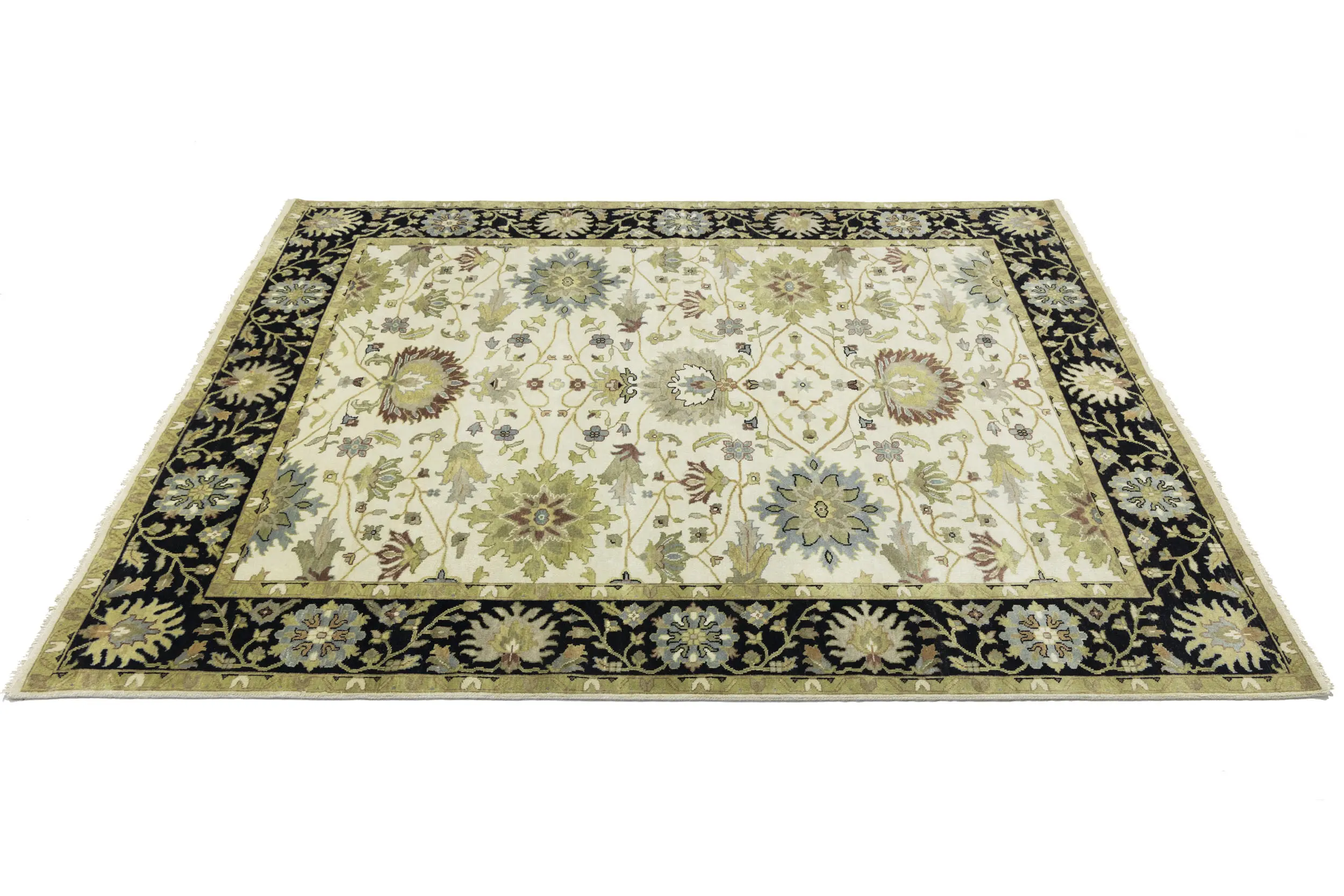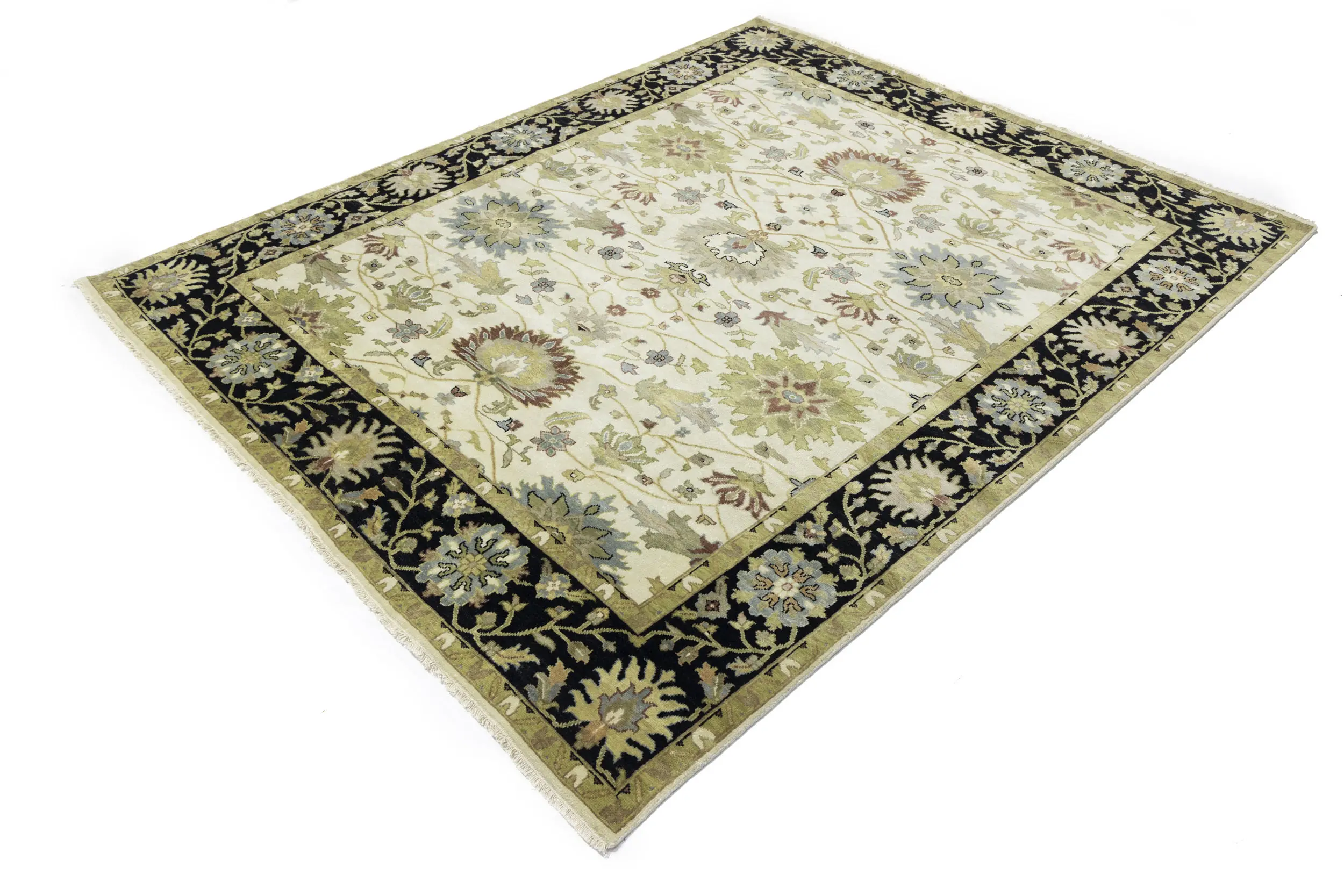 This genuine 8X10 cream new Oriental rug was made by the hands of gifted weavers inspired by a variety of spectacular artistic designs, to recreate the aged look of the original piece with a richness of color and ornately patterned background field. What set this vintage style Oriental area rug from the others are the material and dye used (wool pile and cotton foundation), knot count, ancient designs, fantastic grades, and its regional historical connection: it has deep roots, from the story of the people who produced it to the meaning of the symbols and colors displayed across its canvas that have been praised for centuries. This Indian home décor carpet will be completely cozy and inviting that never will go out of style! Also, this Oriental rug would be among your most valuable treasures, it is a great investment that accrues value over time, and it will last for generations because was woven with high-quality, all-natural wool. Environmentally friendly, opulent yet affordable; this rug will give you a thorough amount of character to help define your living space with elegance and warmth that will capture the eyes and attention of your audience (homeowners, designers, decorators, family and friends). OT-9048
