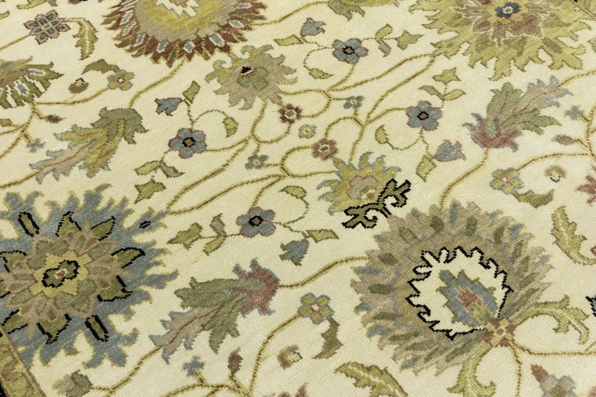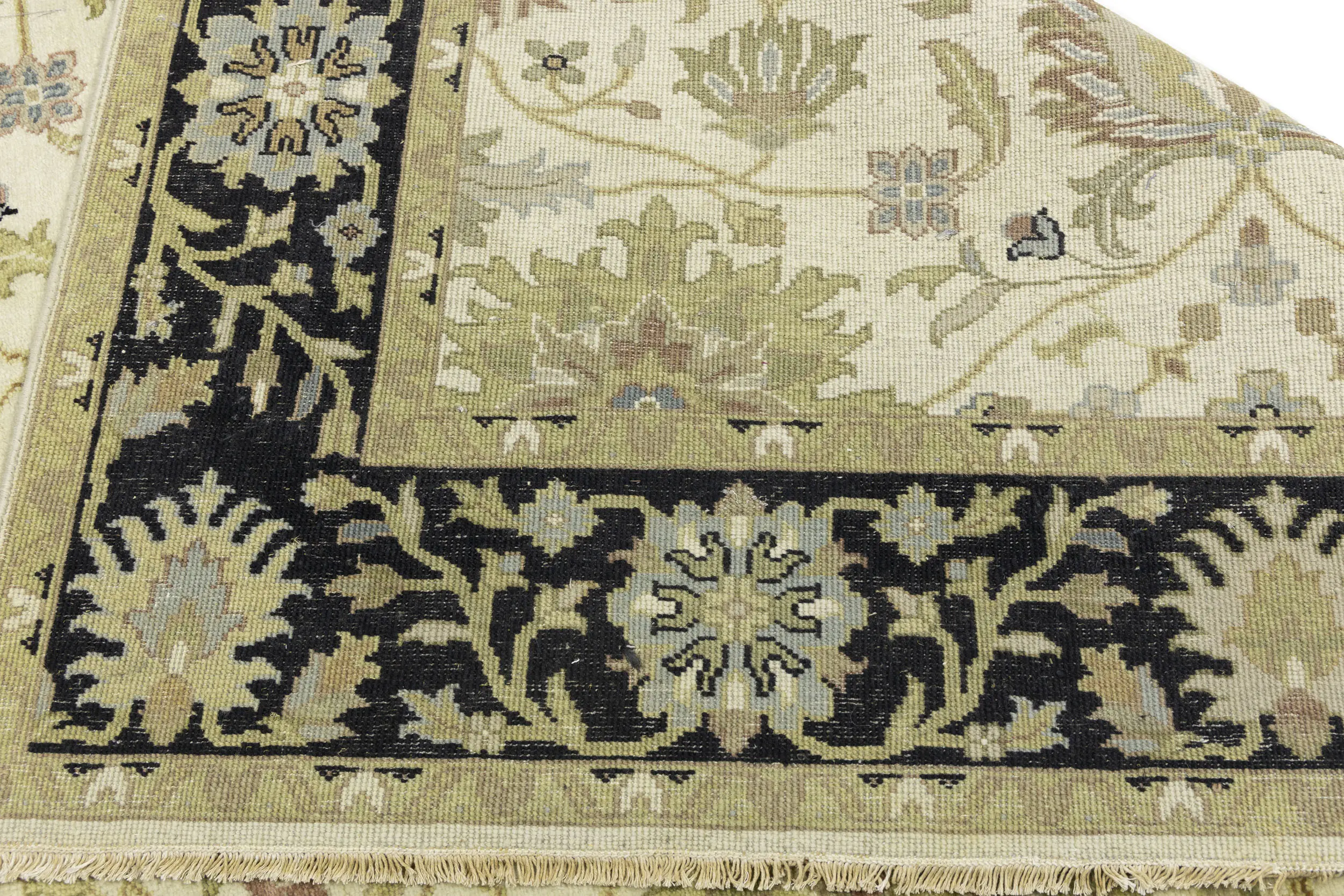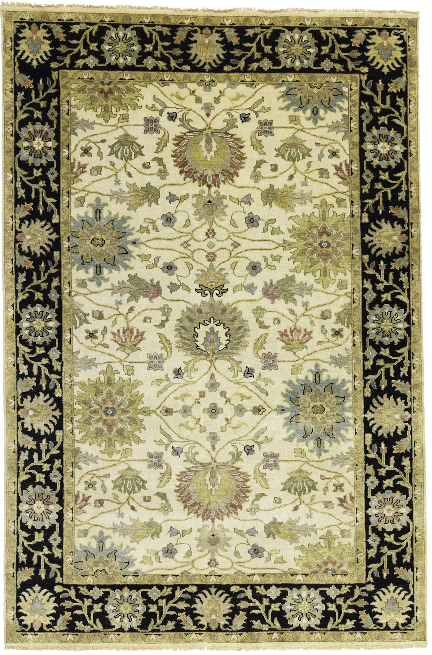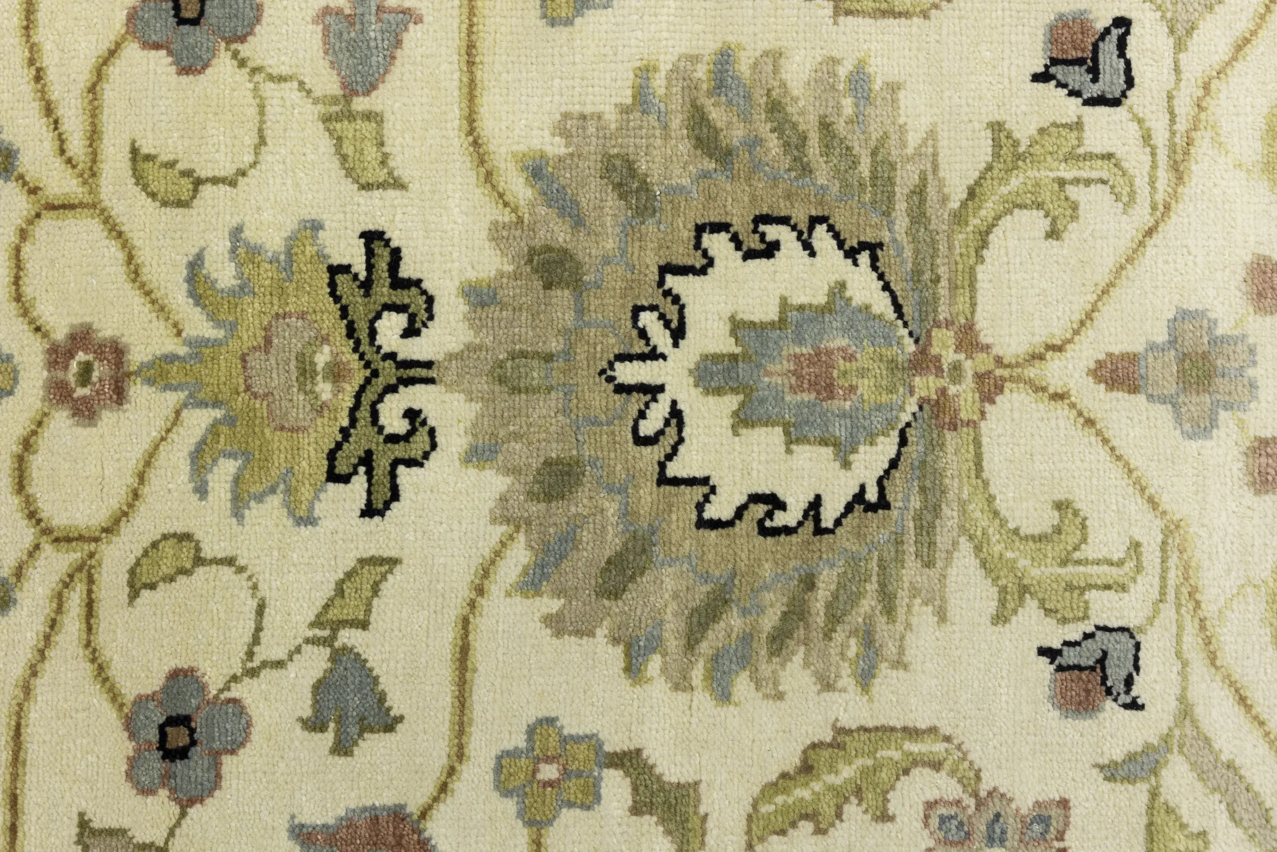 This authentic 6X9 cream new Oriental rug was masterly knotted by the hands of weavers inspired by a variety of wonderful artistic designs, to recreate the aged look of the original piece with a richness of color and intricate patterned background field. What set this vintage style Oriental area rug from the others are the material and dye used (wool pile and cotton foundation), knot count, antique designs, fantastic grades, and its regional historical connection: it has deep roots, from the story of the people who produced it to the meaning of the symbols and colors displayed across its canvas that have been praised for centuries. This Indian home décor carpet will be completely cozy and inviting that never will go out of style! Also, this Oriental rug would be among your most valuable treasures, it is a great investment that accrues value over time, and it will last for generations because was woven with high-quality, all-natural wool. Environmentally friendly, opulent yet affordable; this rug will give you a thorough amount of character to help define your living space with luxury and warmth that will capture the eyes and attention of your audience (homeowners, designers, decorators, family and friends). OT-11513