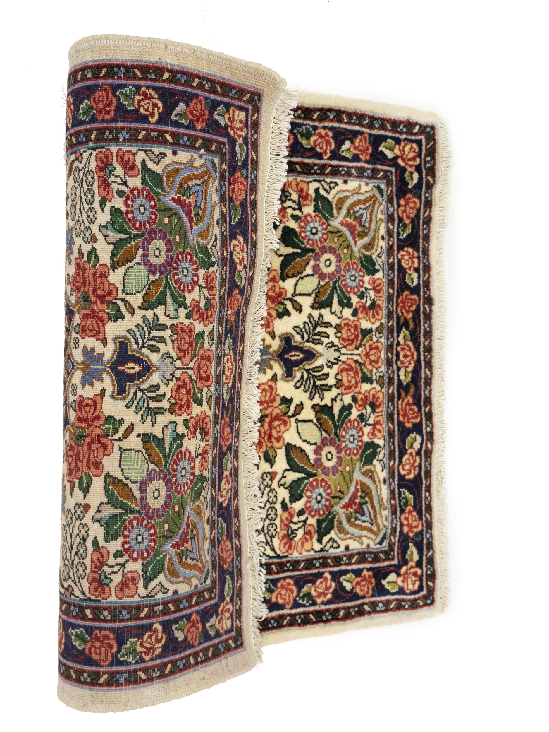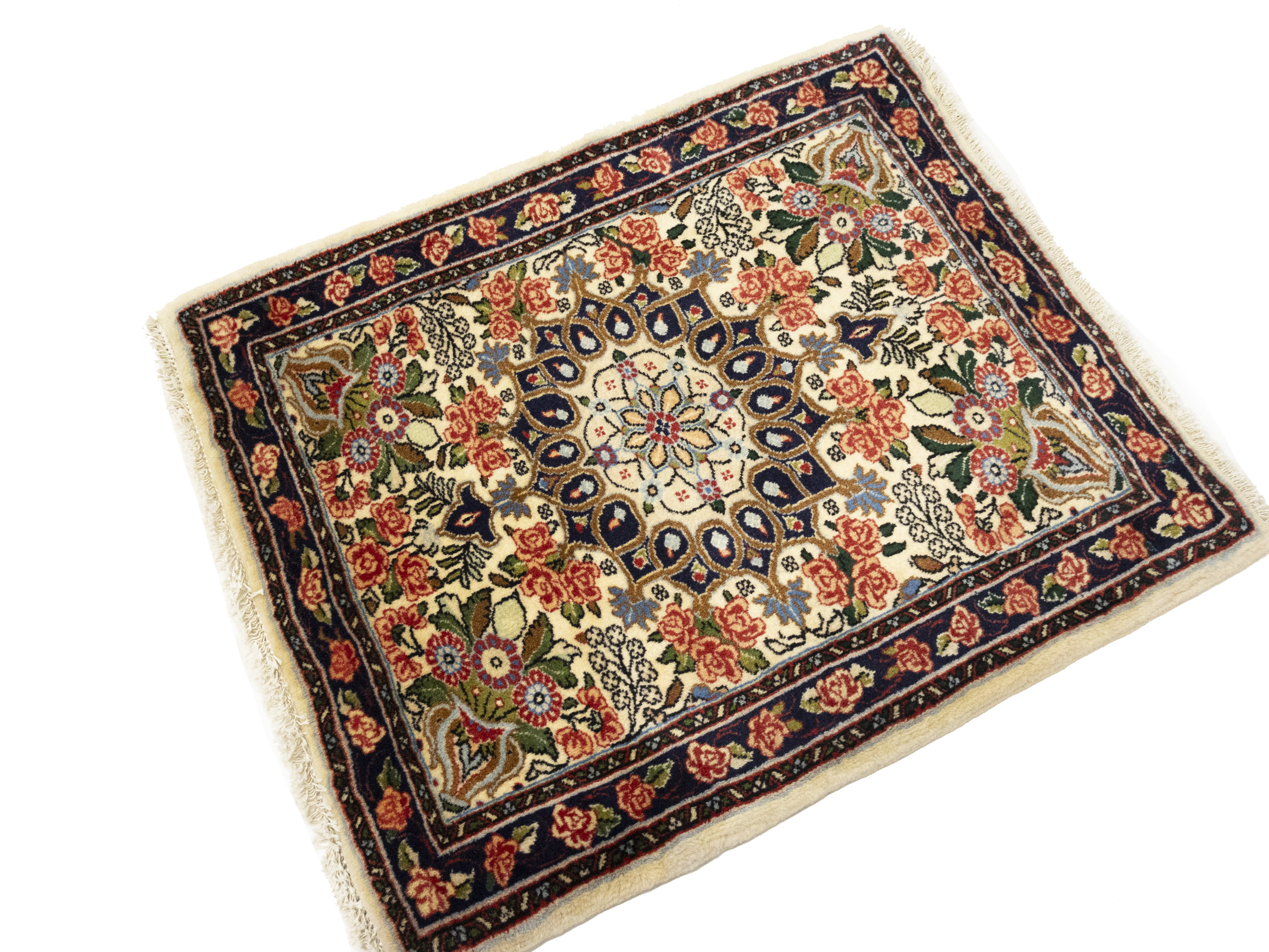 Handmade 2'3X2'7 cream oriental rug made with vegetable dyes (fine wool pile and cotton foundation), exceptional knot count, and appealing ancient designs. This Oriental rug never will go out of style and would be among your most valuable treasures.