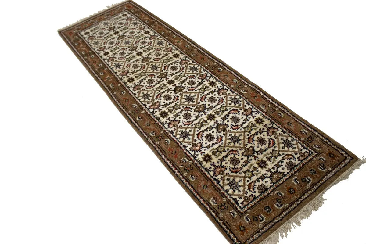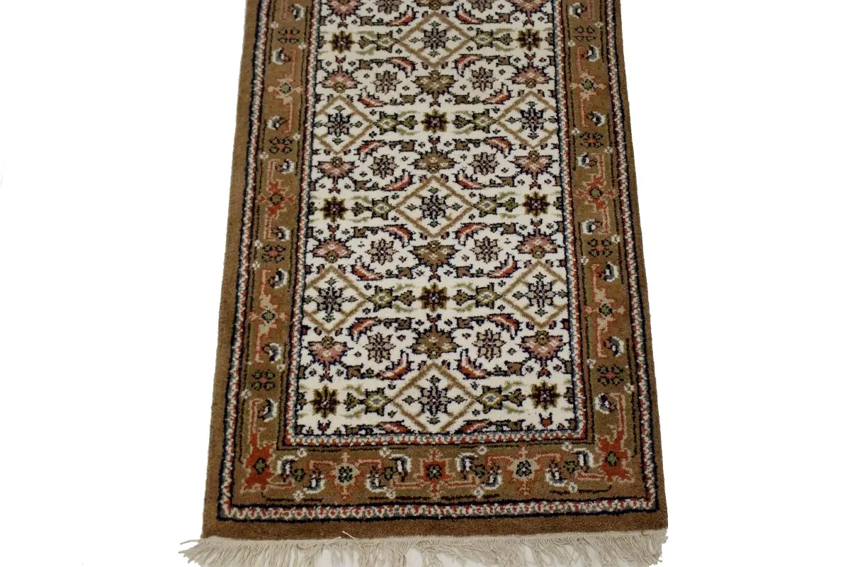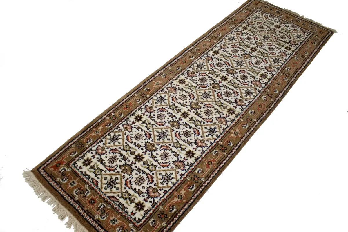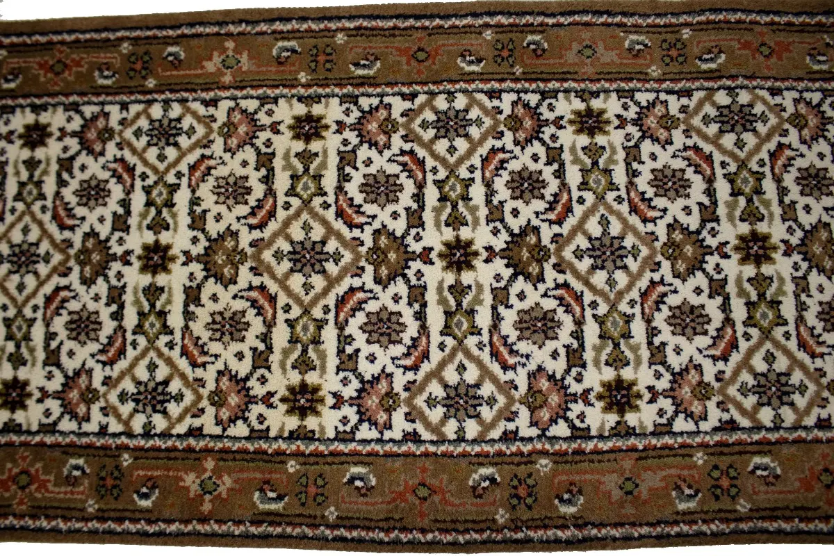 Handmade 3X8 cream oriental runner made with vegetable dyes (fine wool pile and cotton foundation), superior knot count, and alluring ancient designs. This Oriental runner never will go out of style and would be among your most valuable treasures.