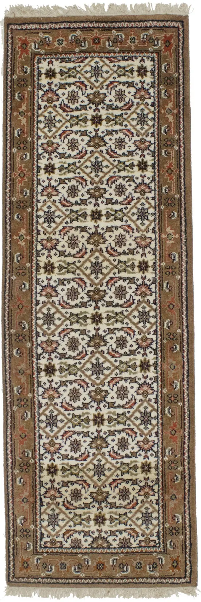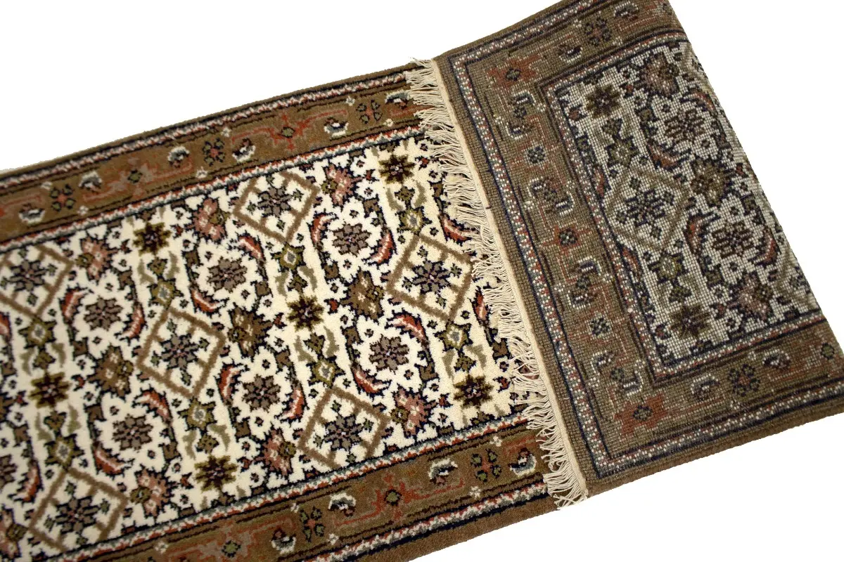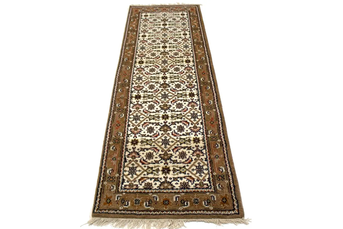 Handmade 3X8 cream oriental runner made with vegetable dyes (fine wool pile and cotton foundation), superior knot count, and alluring ancient designs. This Oriental runner never will go out of style and would be among your most valuable treasures.