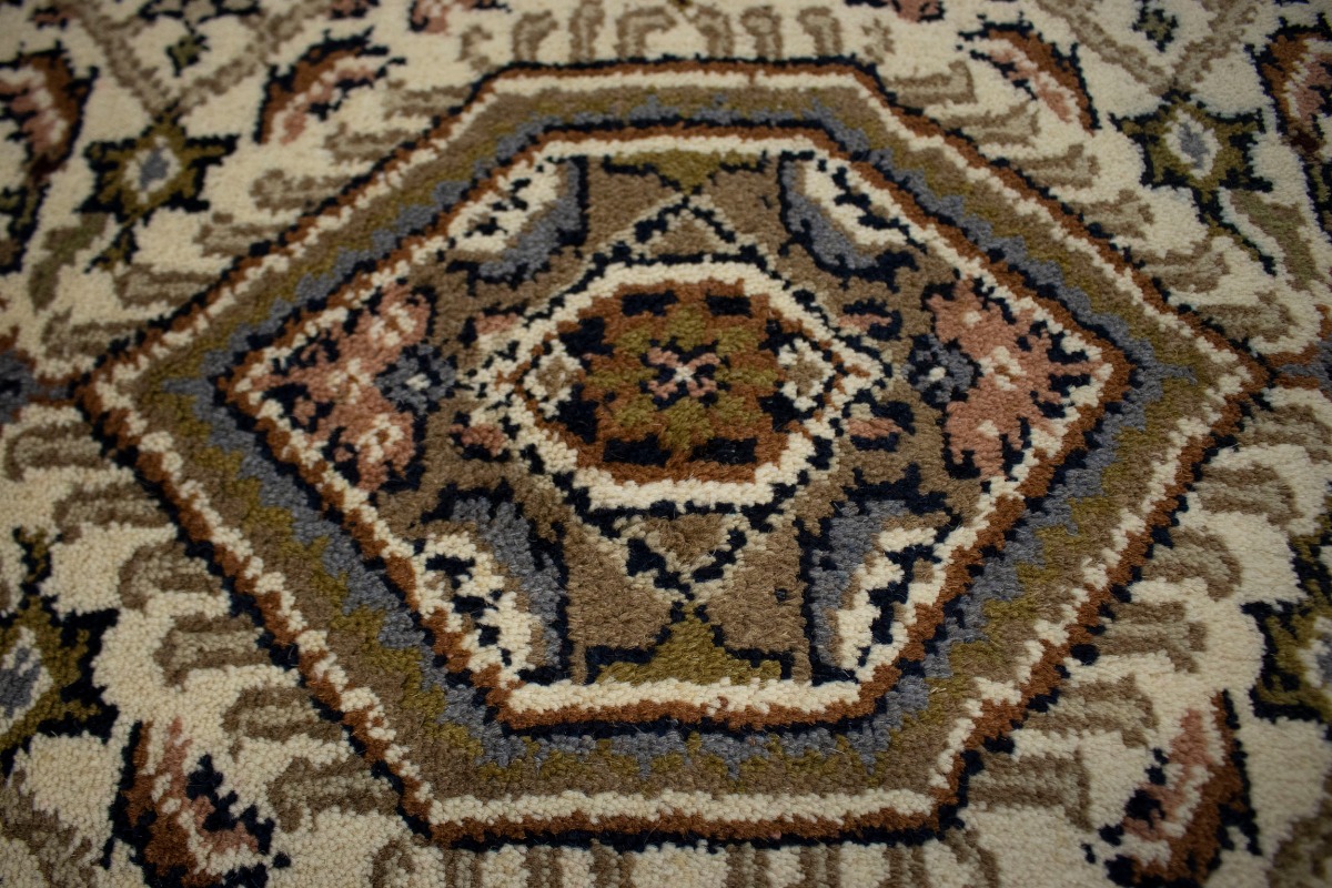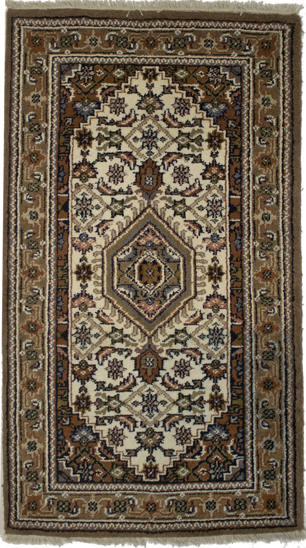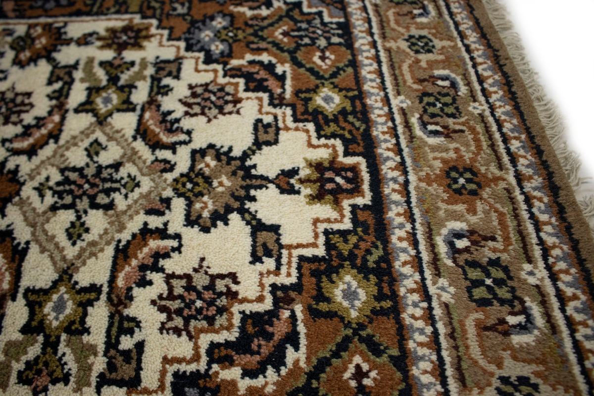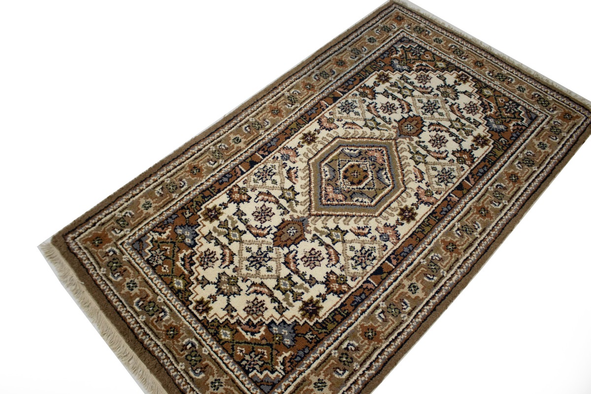 This genuine 3X5 cream new Oriental rug was made by the hands of gifted weavers inspired by a variety of spectacular artistic designs, to recreate the aged look of the original piece with a richness of color and ornately patterned background field. What set this vintage style Oriental area rug from the others are the material and dye used (wool pile and cotton foundation), knot count, ancient designs, fantastic grades, and its regional historical connection: it has deep roots, from the story of the people who produced it to the meaning of the symbols and colors displayed across its canvas that have been praised for centuries. This Indian home décor carpet will be completely cozy and inviting that never will go out of style! Also, this Oriental rug would be among your most valuable treasures, it is a great investment that accrues value over time, and it will last for generations because was woven with high-quality, all-natural wool. Environmentally friendly, opulent yet affordable; this rug will give you a thorough amount of character to help define your living space with elegance and warmth that will capture the eyes and attention of your audience (homeowners, designers, decorators, family and friends). OT-4548
