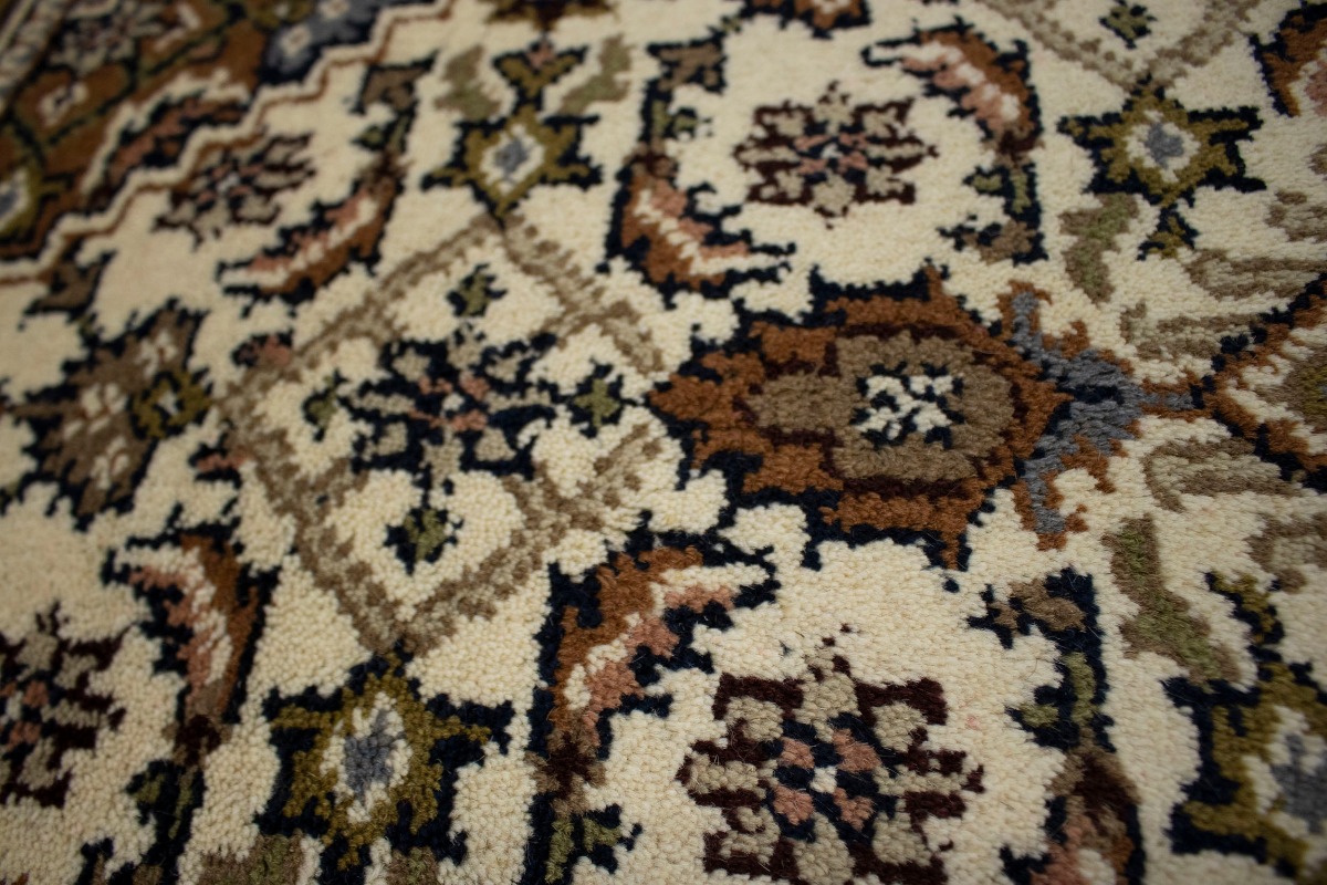 Handmade 3X5 cream oriental rug made with vegetable dyes (fine wool pile and cotton foundation), exceptional knot count, and appealing ancient designs. This Oriental rug never will go out of style and would be among your most valuable treasures.