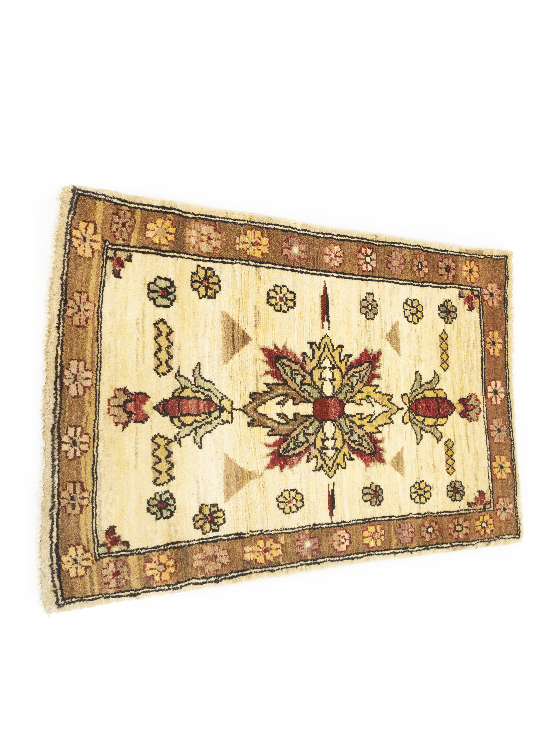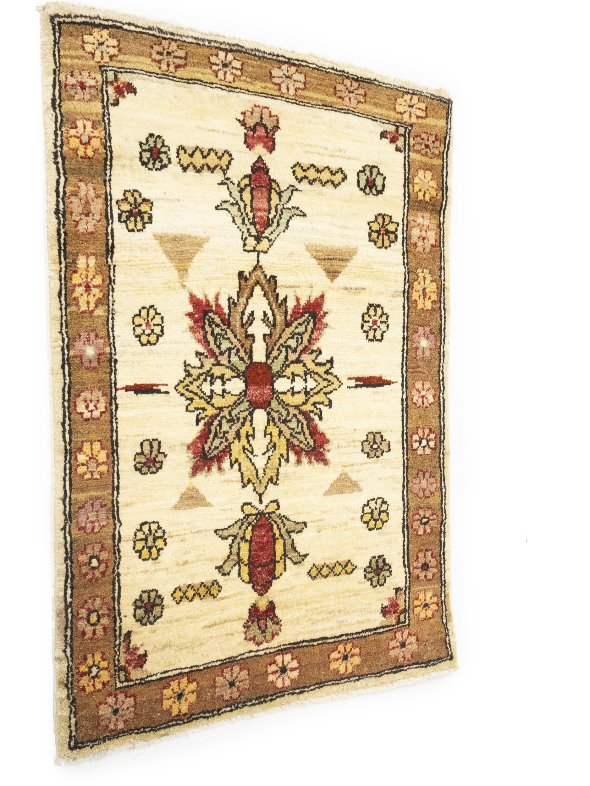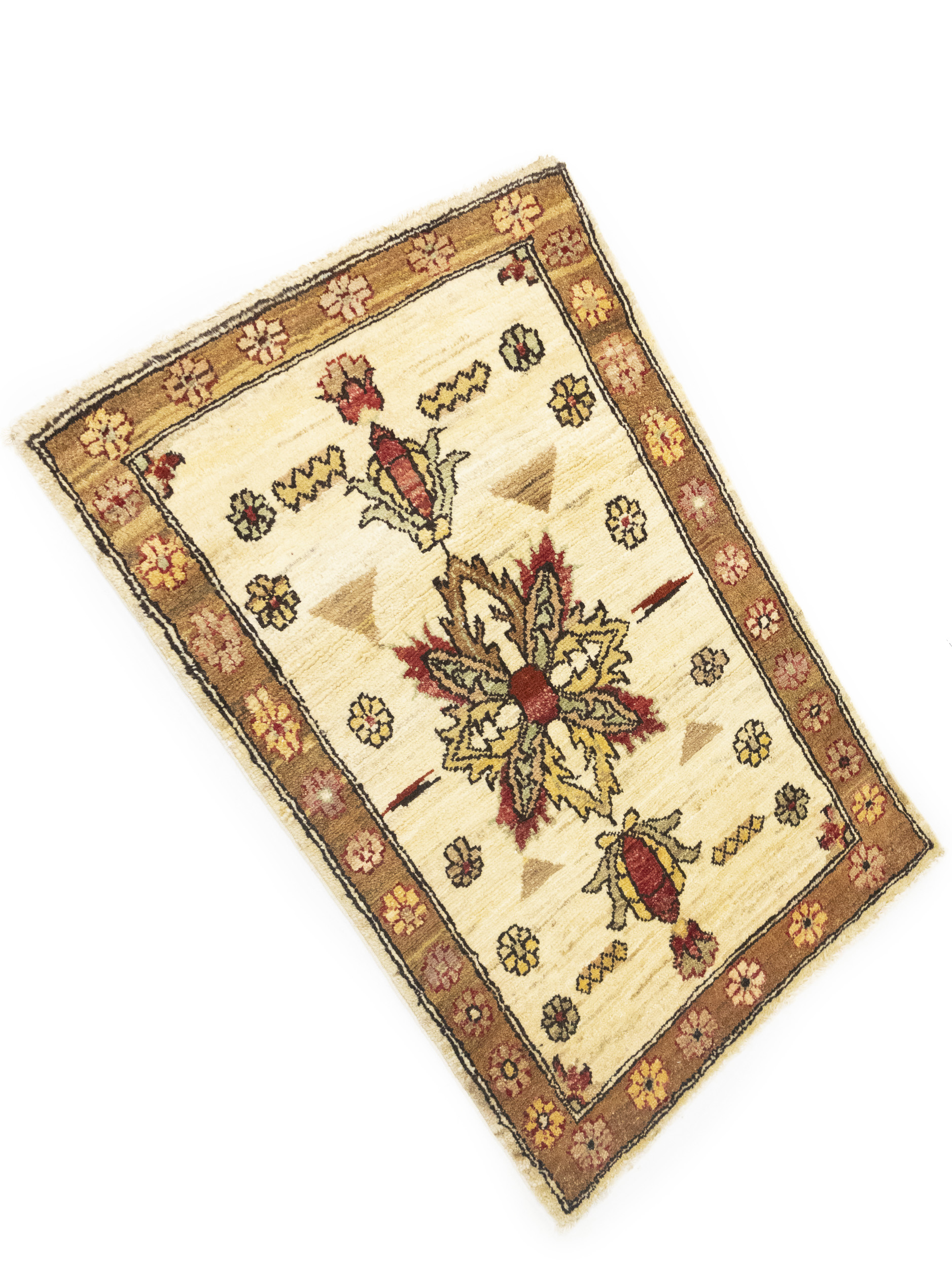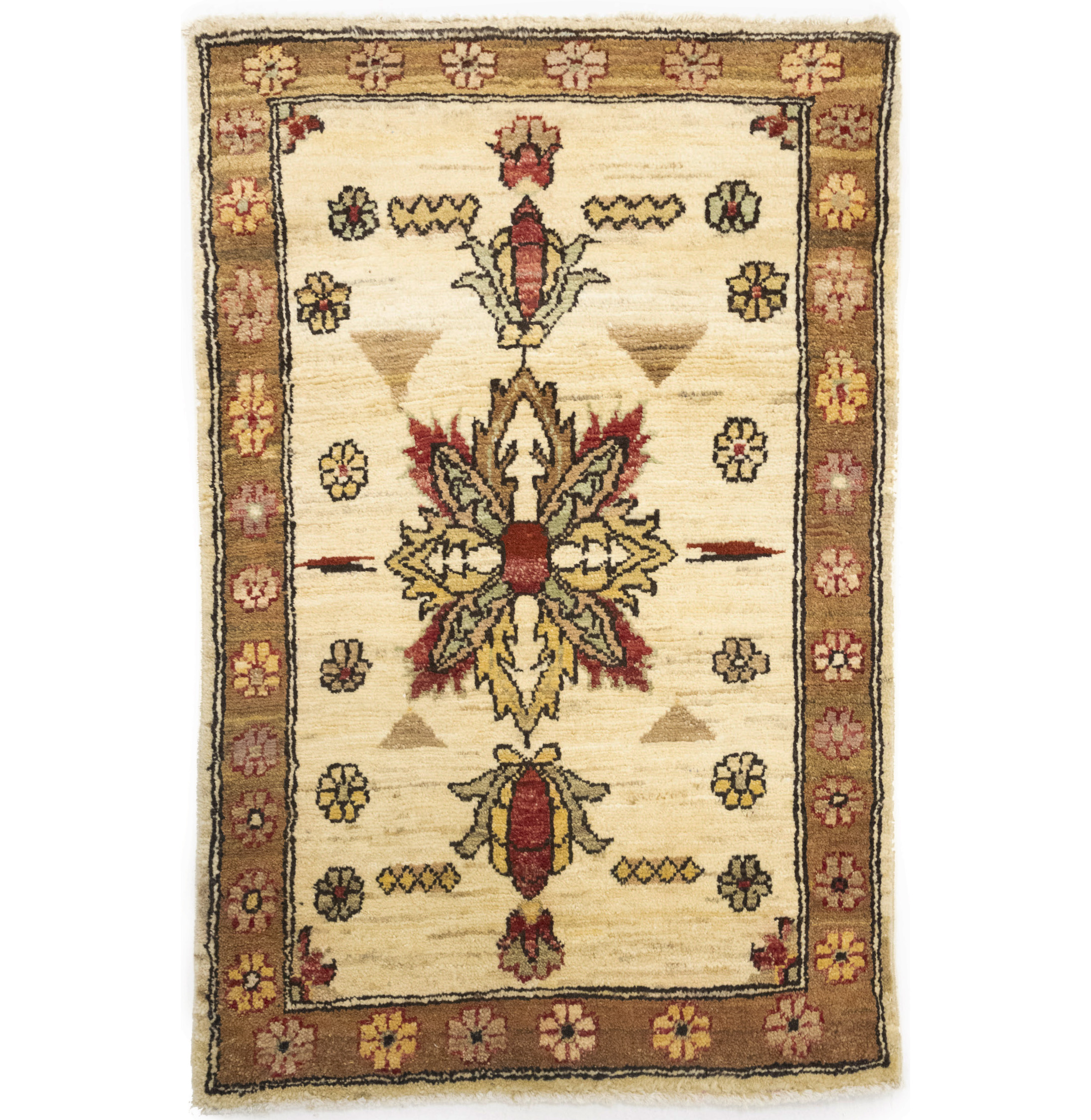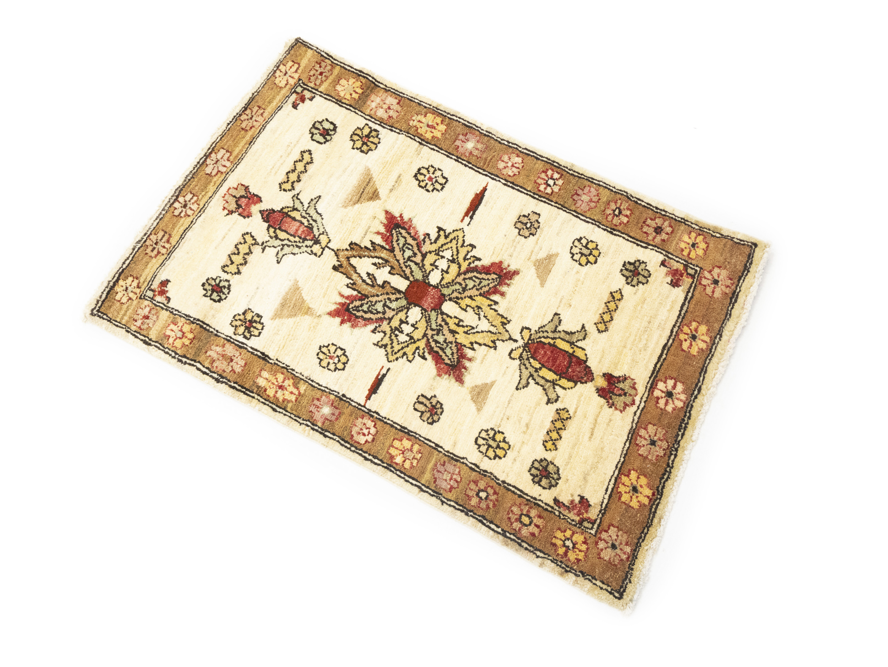 Handmade 2x3 cream oriental Cream rug made with vegetable dyes (fine wool pile and cotton foundation), superior knot count, and appealing ancient designs. This Oriental rug never will go out of style and would be among your most valuable treasures.
