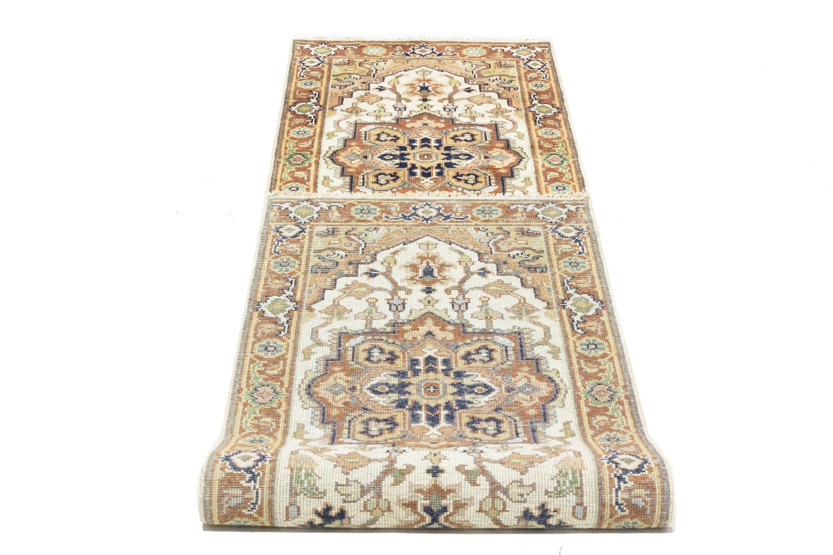 Cream Geometric 3X10 Heriz Serapi Oriental Runner Rug