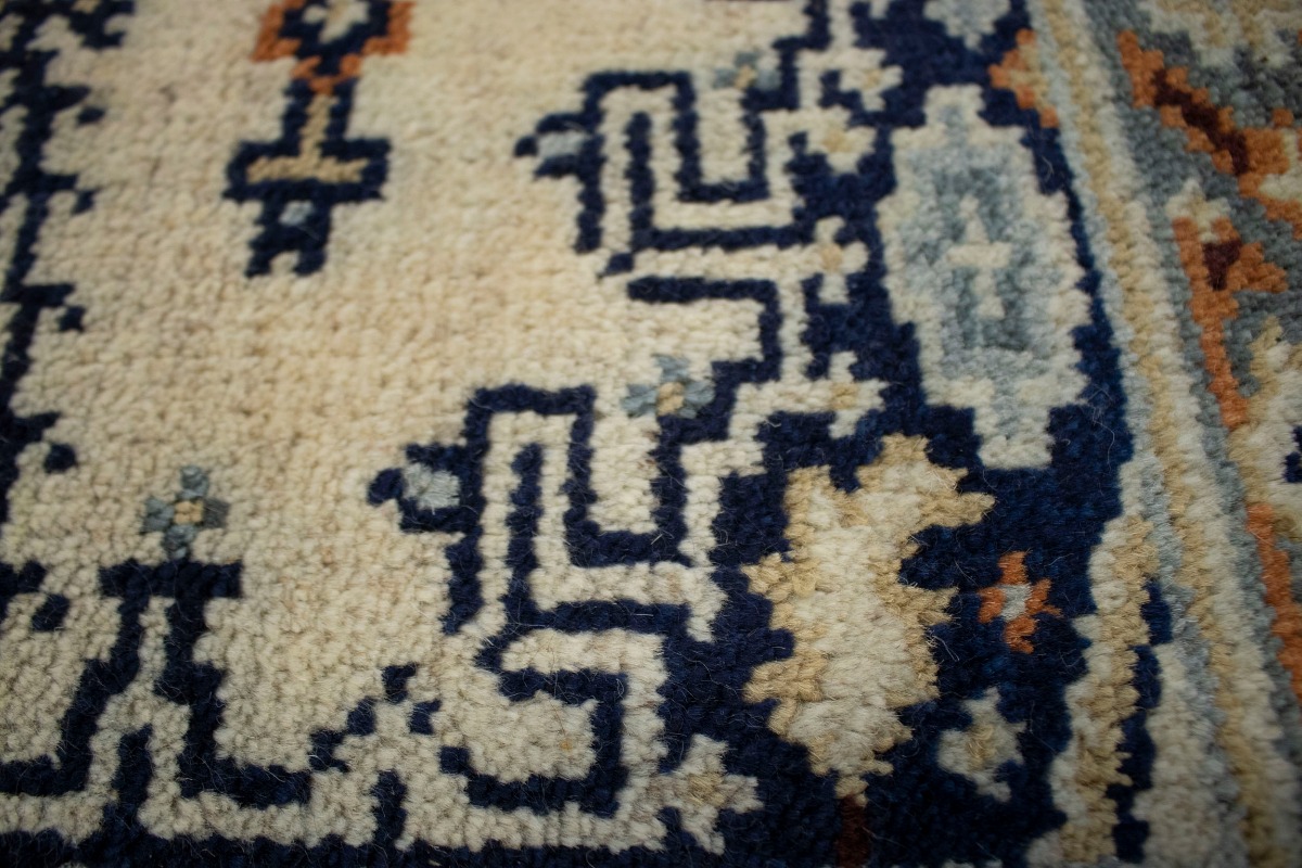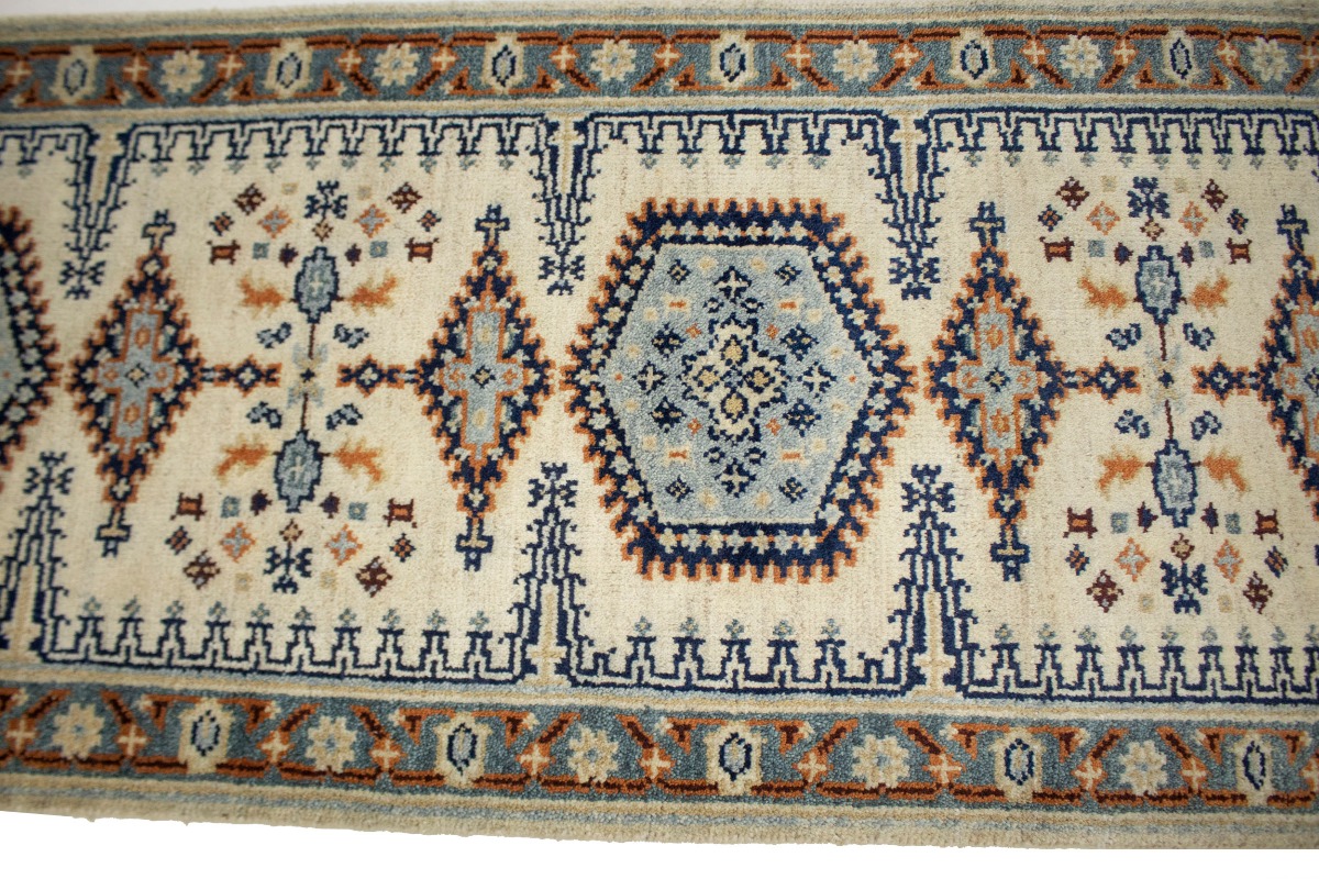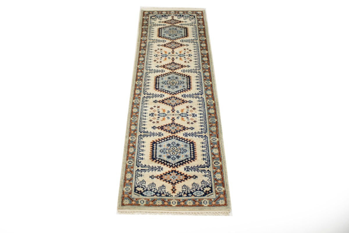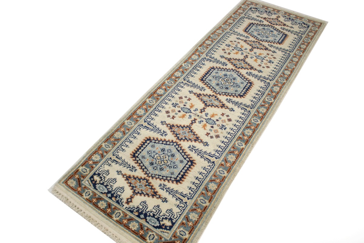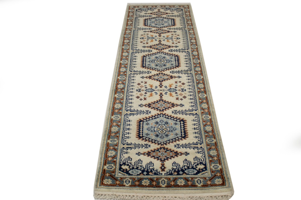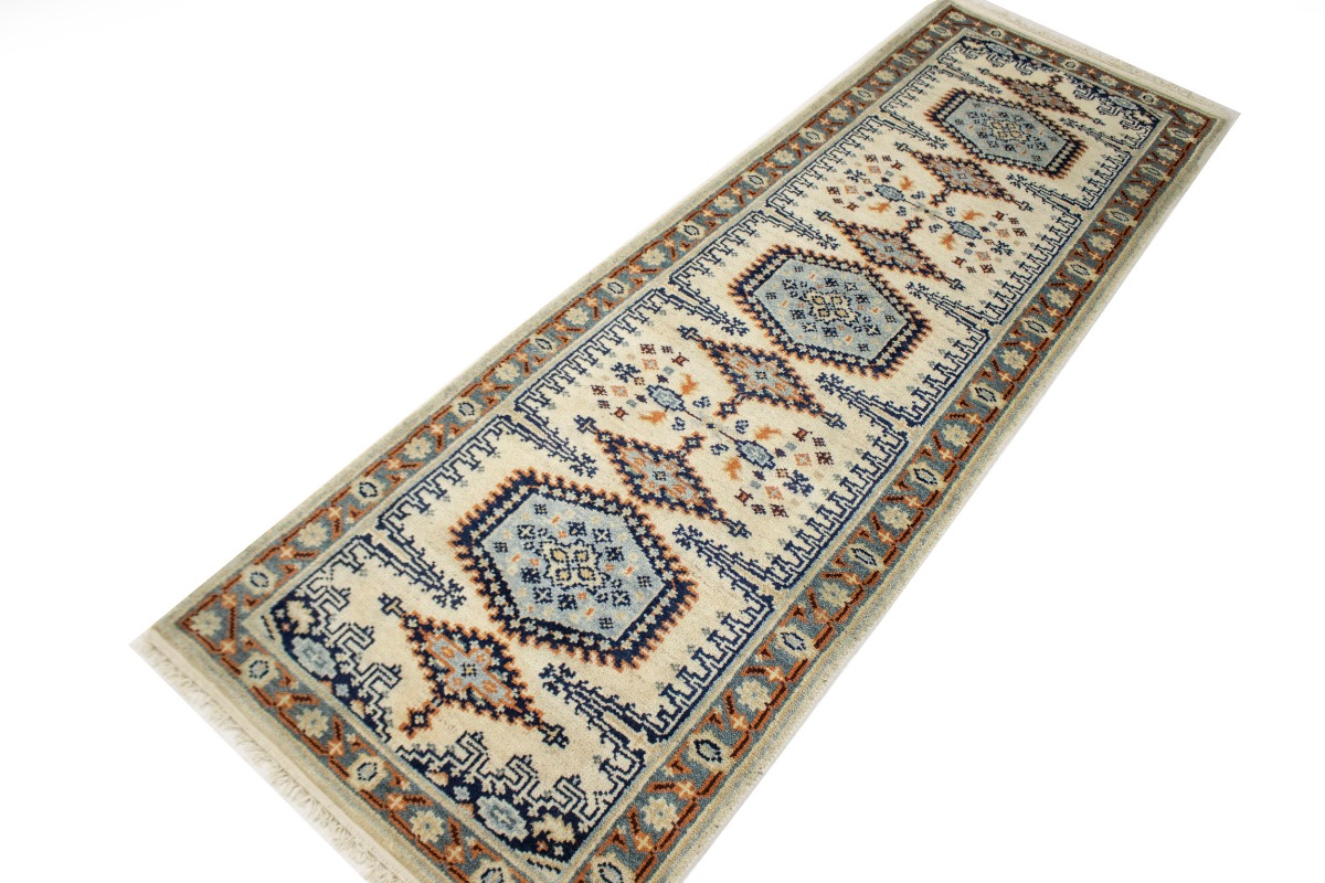 Hand Knotted 3X8 cream oriental runner made with vegetable dyes (fine wool pile and cotton foundation), exceptional knot count, and appealing ancient designs. This Oriental runner never will go out of style and would be among your most valuable treasures.