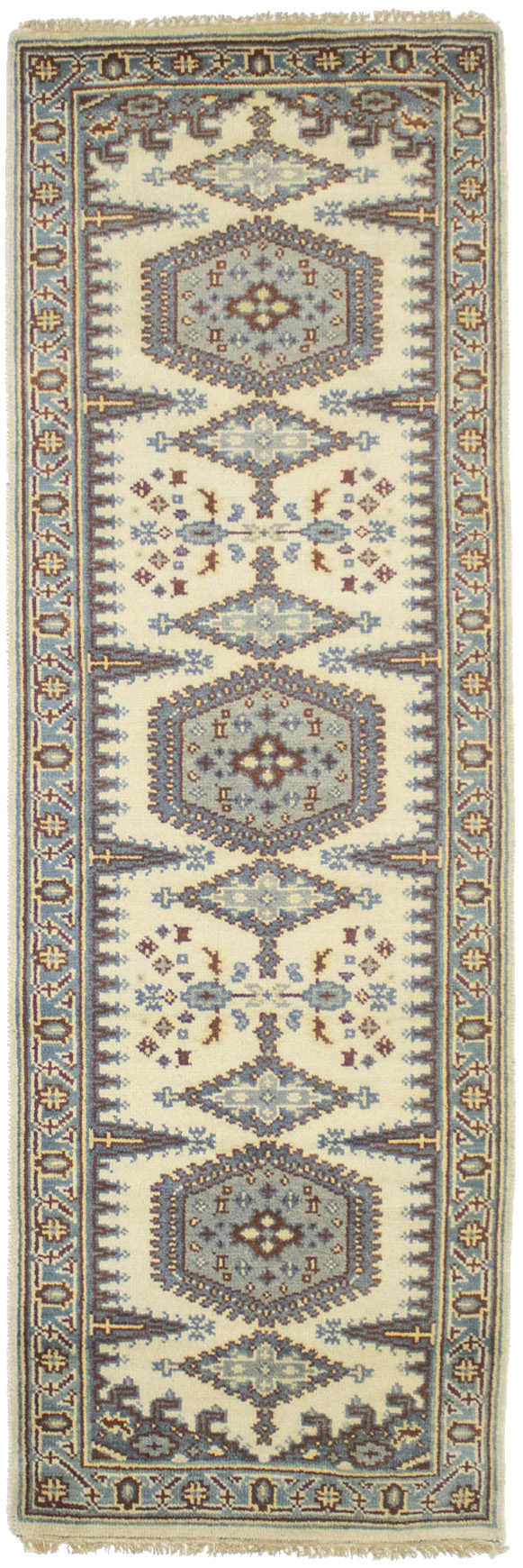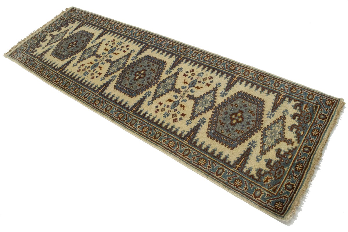 Hand Knotted 3X8 cream Oriental runner made with vegetable dyes (fine wool pile and cotton foundation), exceptional knot count, and appealing ancient designs. This Oriental runner never will go out of style and would be among your most valuable treasures.