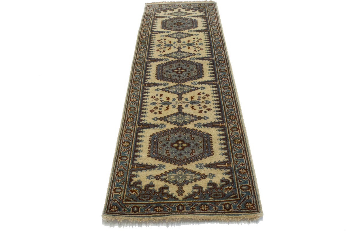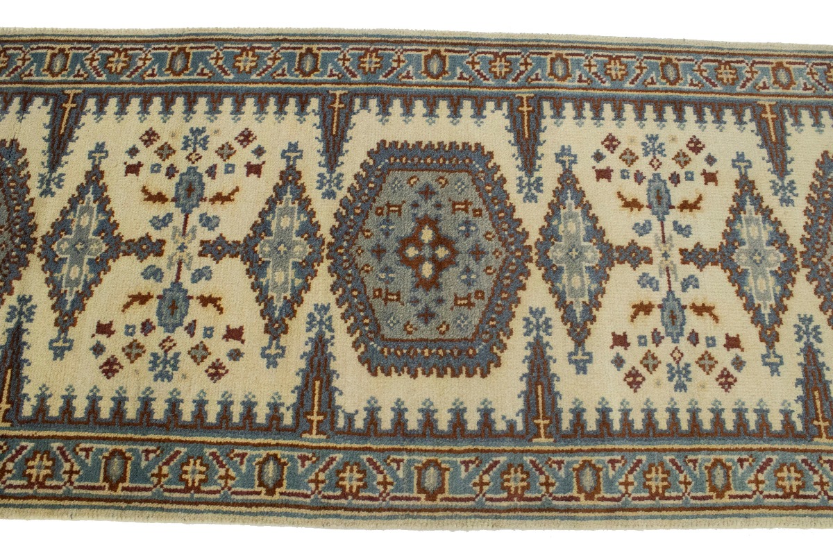 This original 3X8 cream new Oriental runner was finely knotted by the hands of weavers influenced by a variety of amazing artistic designs, to recreate the aged look of the exceptional piece with a richness of color and embellished background field. What set this vintage style Oriental area runner from the others are the material and dye used (wool pile and cotton foundation), knot count, antique designs, fantastic grades, and its regional historical connection: it has deep roots, from the story of the people who produced it to the meaning of the symbols and colors displayed across its canvas that have been praised for centuries. This Indian home décor carpet will be completely cozy and inviting that never will go out of style! Also, this Oriental rug would be among your most valuable treasures, it is a great investment that increase in value over time, and it will last a lifetime because was woven with high-quality, all-natural wool. Eco-friendly, opulent yet affordable; this runner will give you an extra pop of character to help define your home environment with luxury and warmth that will capture the eyes and attention of your audience (homeowners, designers, decorators, family and friends). OT-6130