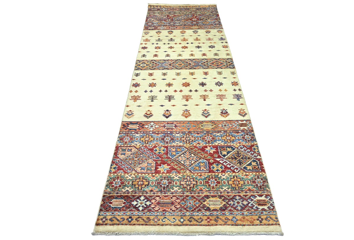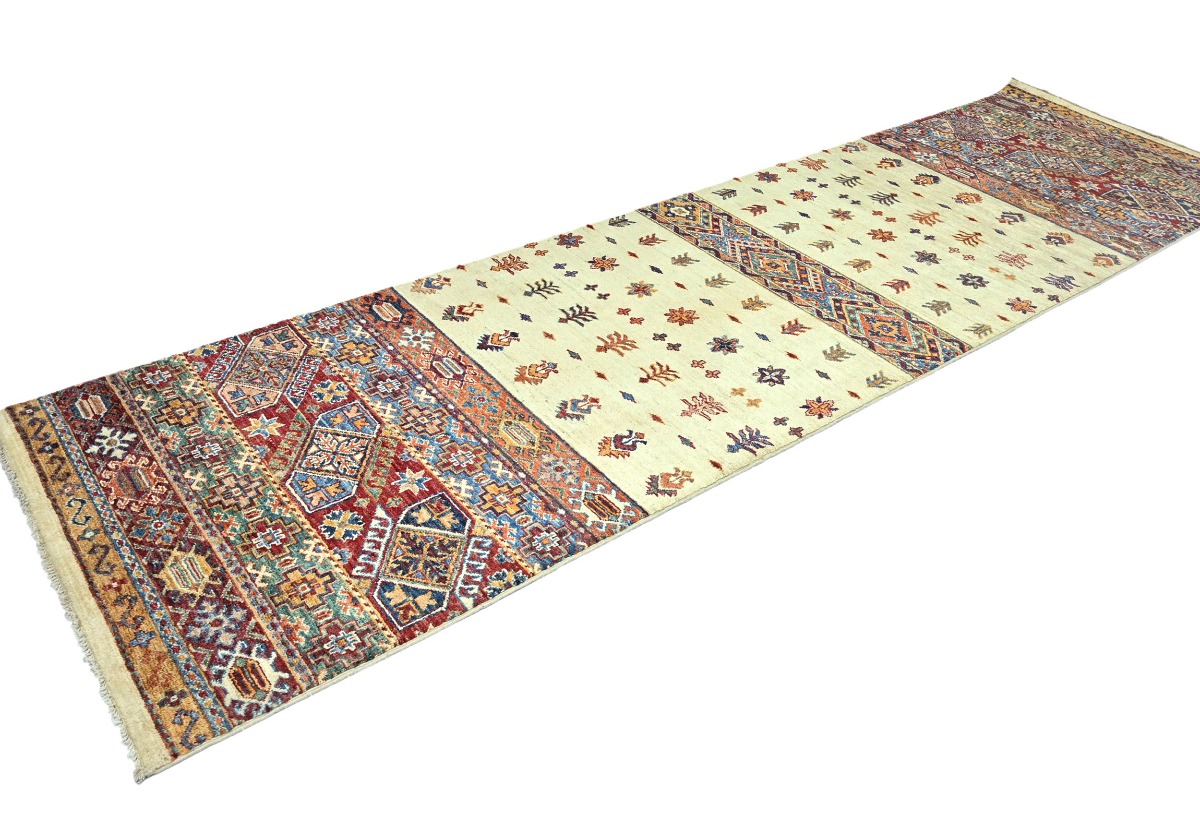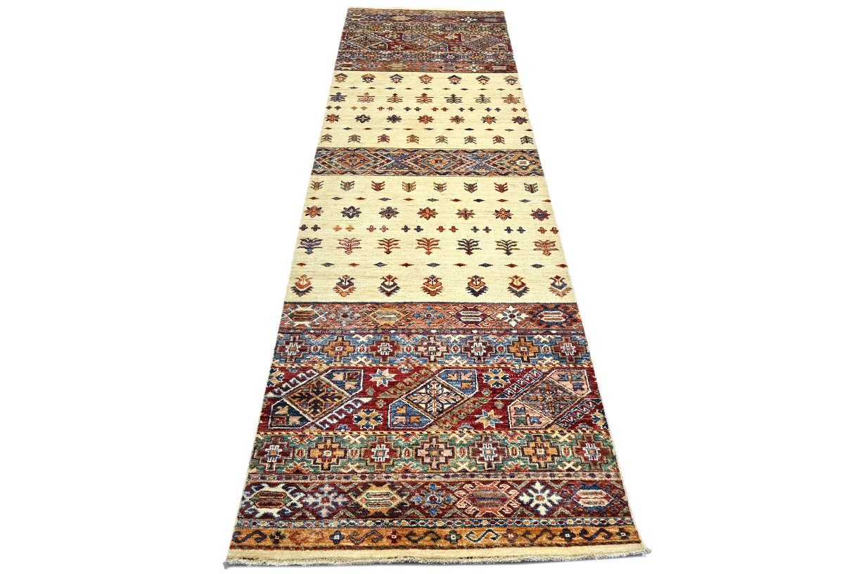 This original 3X10 cream new Oriental runner was finely knotted by the hands of weavers influenced by a variety of amazing artistic designs, to recreate the aged look of the exceptional piece with a richness of color and embellished background field. What set this vintage style Oriental area runner from the others are the material and dye used (wool pile and cotton foundation), knot count, antique designs, fantastic grades, and its regional historical connection: it has deep roots, from the story of the people who produced it to the meaning of the symbols and colors displayed across its canvas that have been praised for centuries. This Indian home décor carpet will be completely cozy and inviting that never will go out of style! Also, this Oriental rug would be among your most valuable treasures, it is a great investment that increase in value over time, and it will last a lifetime because was woven with high-quality, all-natural wool. Eco-friendly, opulent yet affordable; this runner will give you an extra pop of character to help define your home environment with luxury and warmth that will capture the eyes and attention of your audience (homeowners, designers, decorators, family and friends). RT-5485