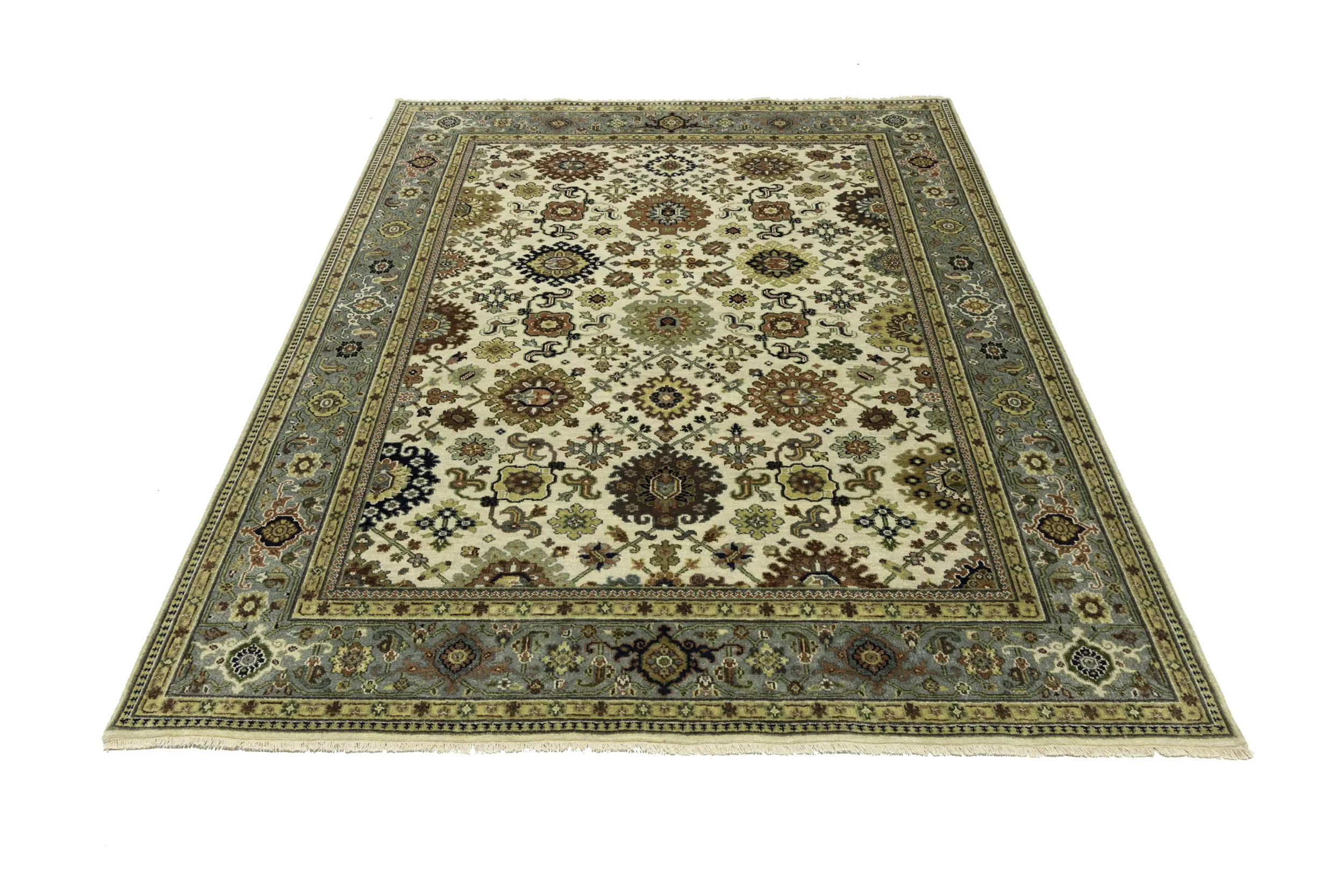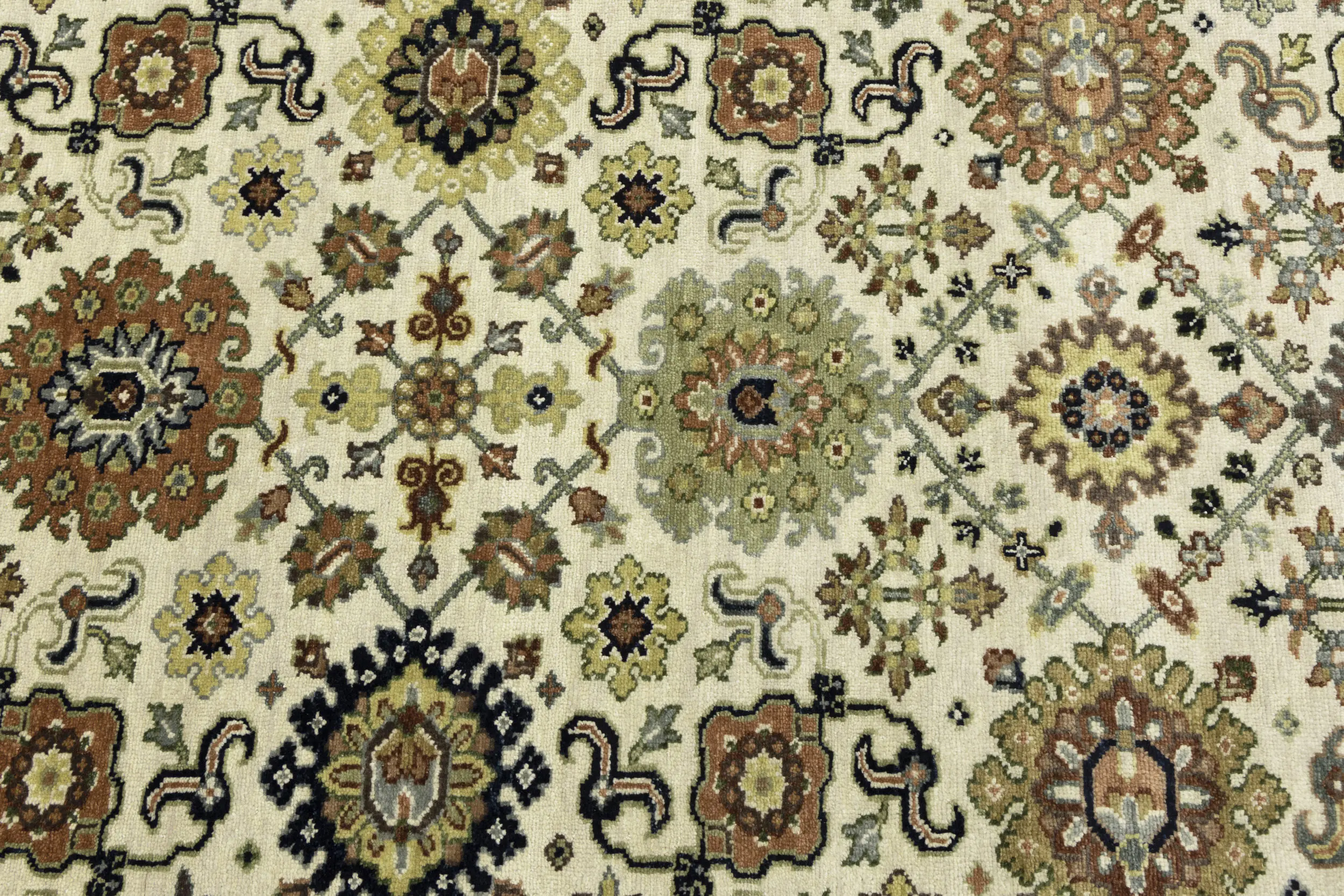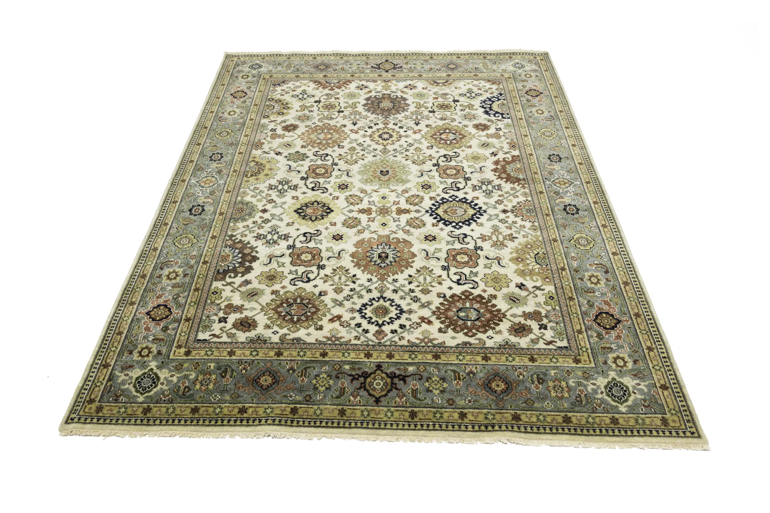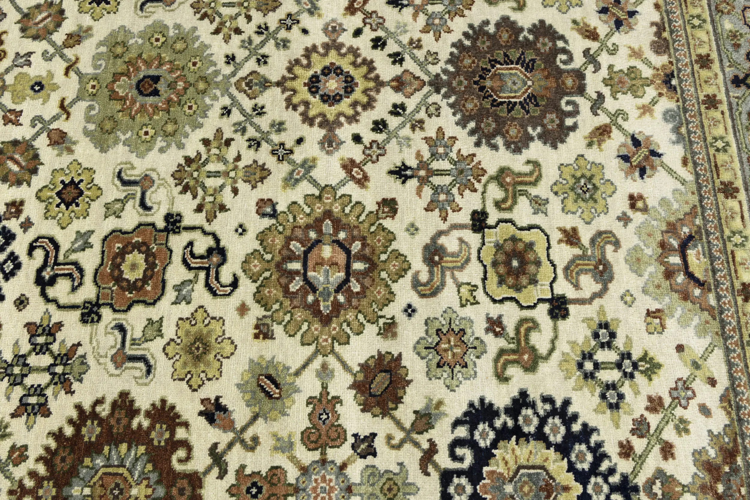 This genuine 8X10 cream new Oriental rug was made by the hands of gifted weavers inspired by a variety of spectacular artistic designs, to recreate the aged look of the original piece with a richness of color and ornately patterned background field. What set this vintage style Oriental area rug from the others are the material and dye used (wool pile and cotton foundation), knot count, ancient designs, fantastic grades, and its regional historical connection: it has deep roots, from the story of the people who produced it to the meaning of the symbols and colors displayed across its canvas that have been praised for centuries. This Indian home décor carpet will be completely cozy and inviting that never will go out of style! Also, this Oriental rug would be among your most valuable treasures, it is a great investment that accrues value over time, and it will last for generations because was woven with high-quality, all-natural wool. Environmentally friendly, opulent yet affordable; this rug will give you a thorough amount of character to help define your living space with elegance and warmth that will capture the eyes and attention of your audience (homeowners, designers, decorators, family and friends).