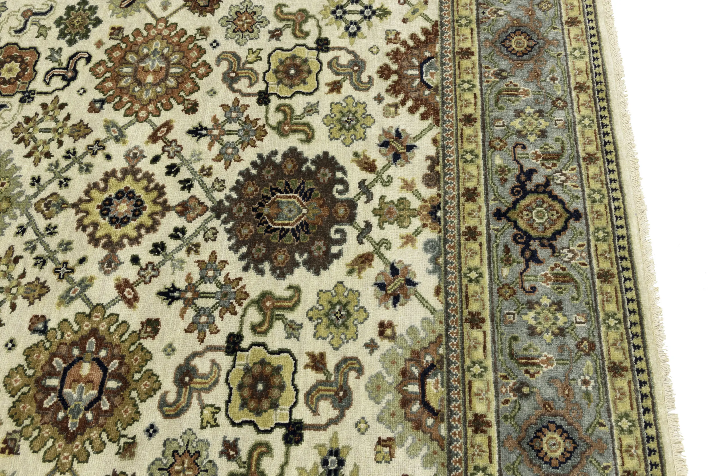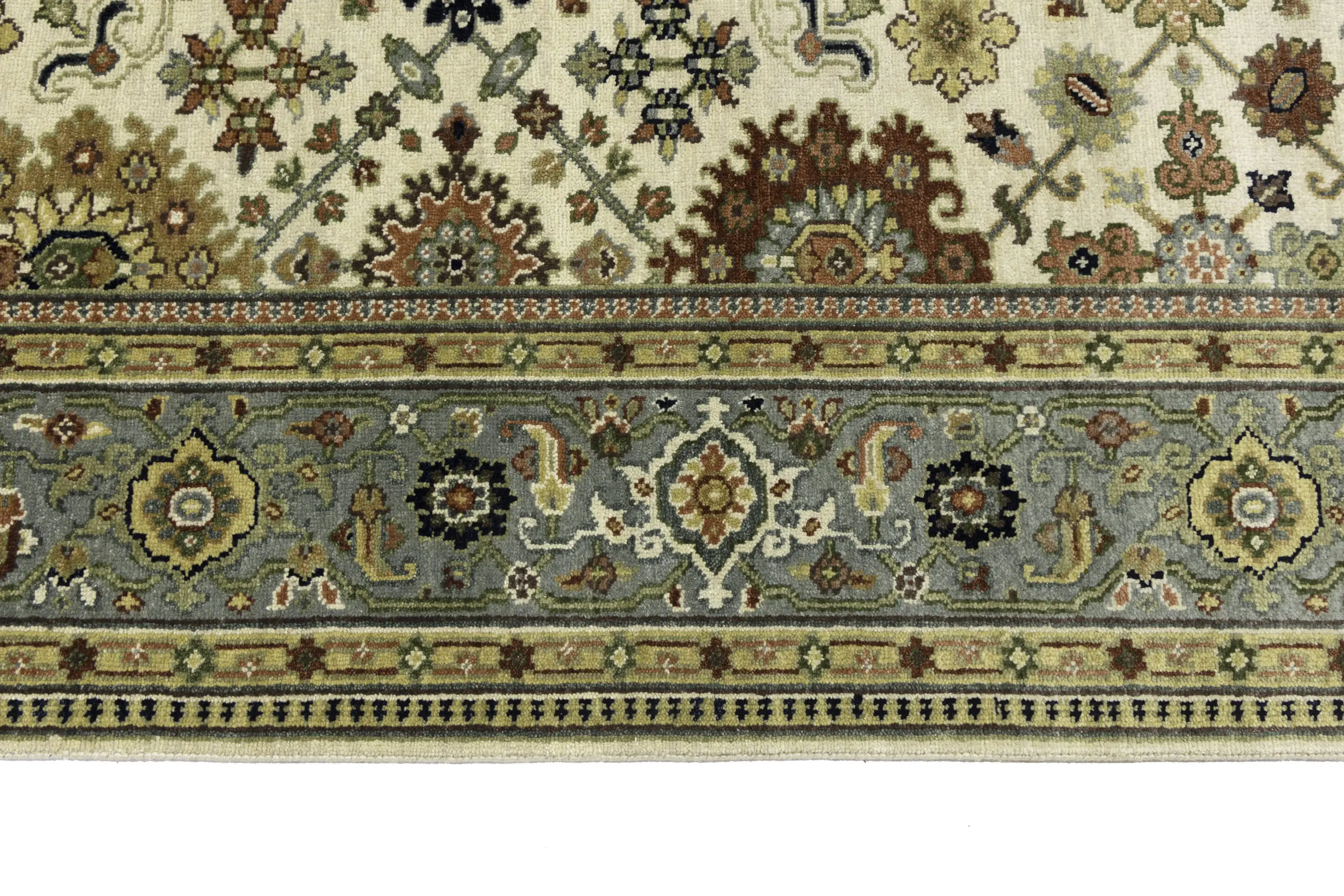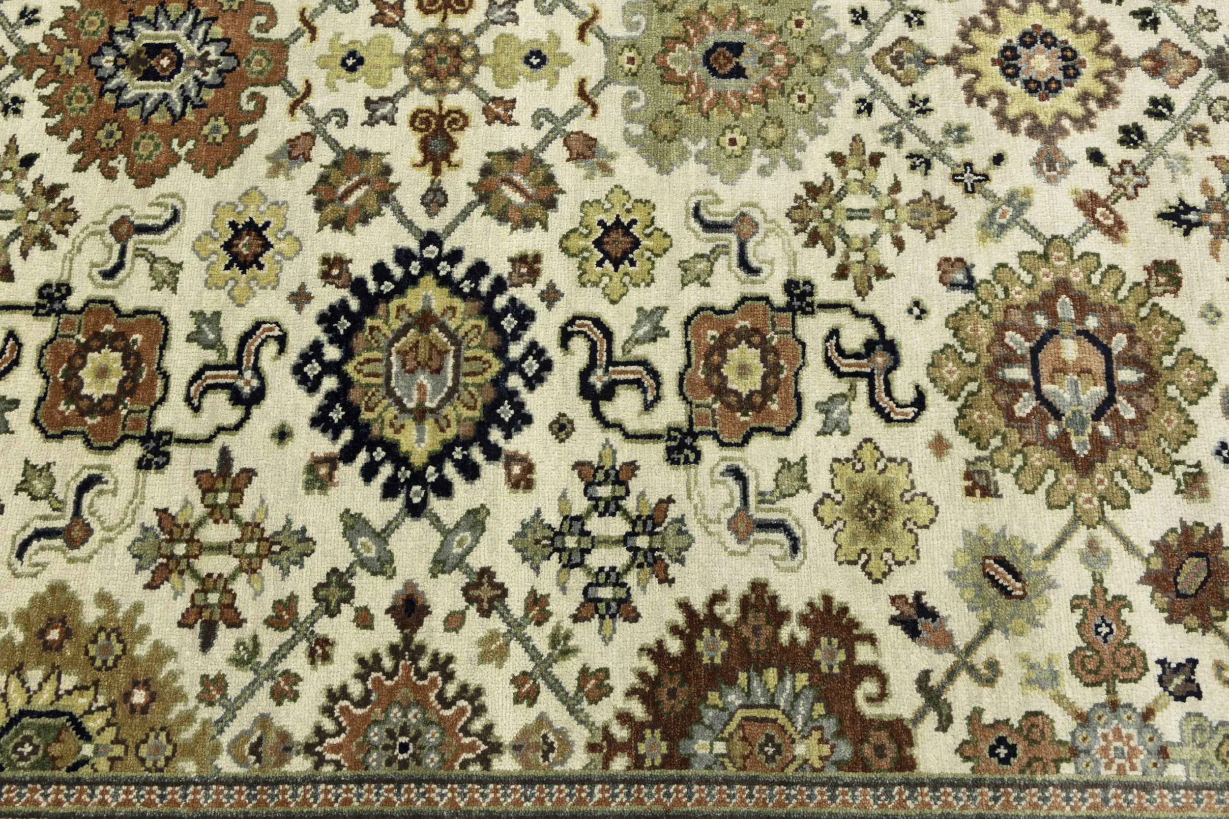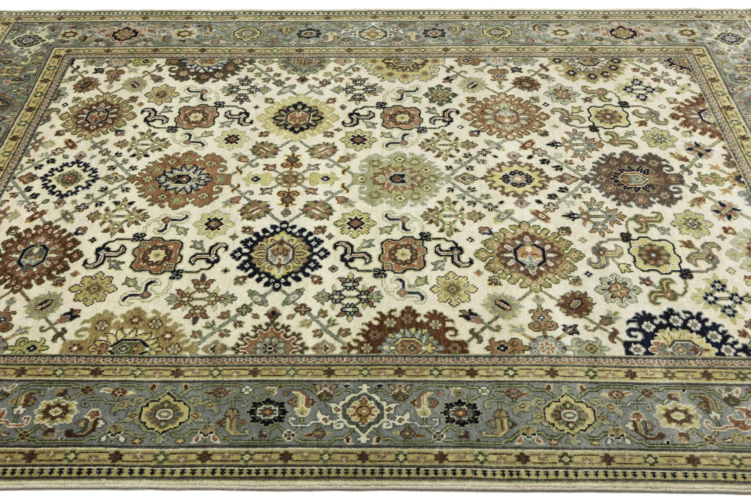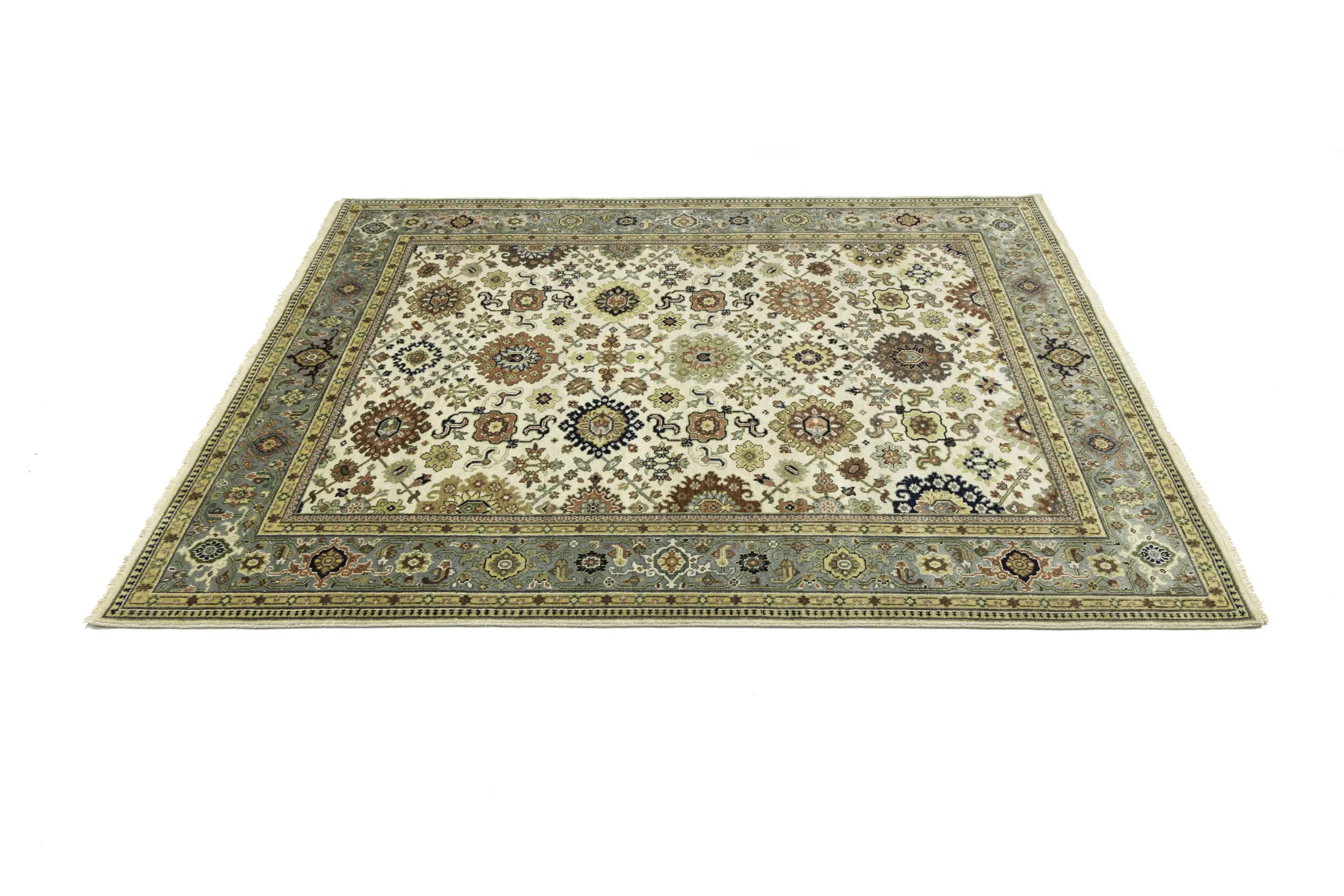 This genuine 8X10 cream new Oriental rug was made by the hands of gifted weavers inspired by a variety of spectacular artistic designs, to recreate the aged look of the original piece with a richness of color and ornately patterned background field. What set this vintage style Oriental area rug from the others are the material and dye used (wool pile and cotton foundation), knot count, ancient designs, fantastic grades, and its regional historical connection: it has deep roots, from the story of the people who produced it to the meaning of the symbols and colors displayed across its canvas that have been praised for centuries. This Indian home décor carpet will be completely cozy and inviting that never will go out of style! Also, this Oriental rug would be among your most valuable treasures, it is a great investment that accrues value over time, and it will last for generations because was woven with high-quality, all-natural wool. Environmentally friendly, opulent yet affordable; this rug will give you a thorough amount of character to help define your living space with elegance and warmth that will capture the eyes and attention of your audience (homeowners, designers, decorators, family and friends).