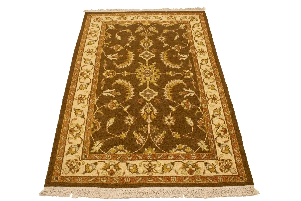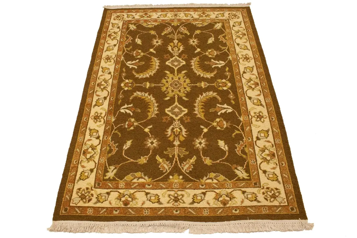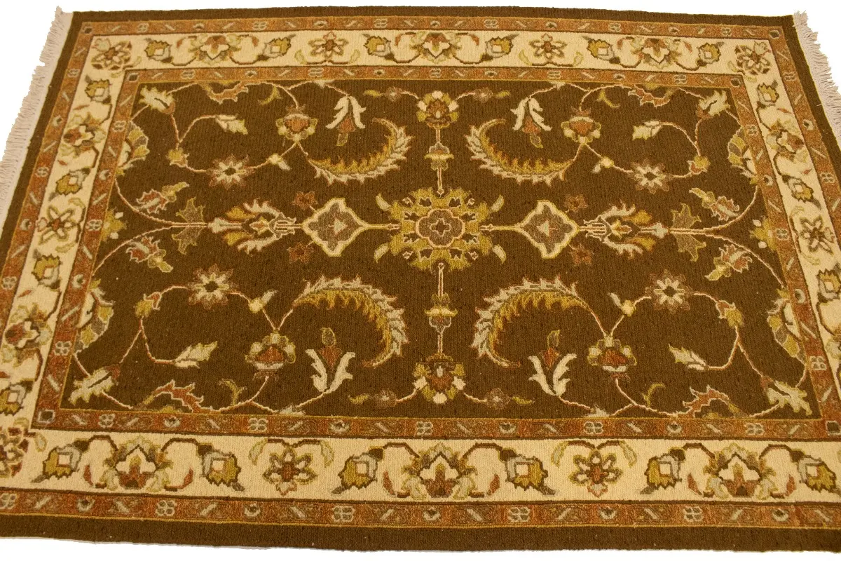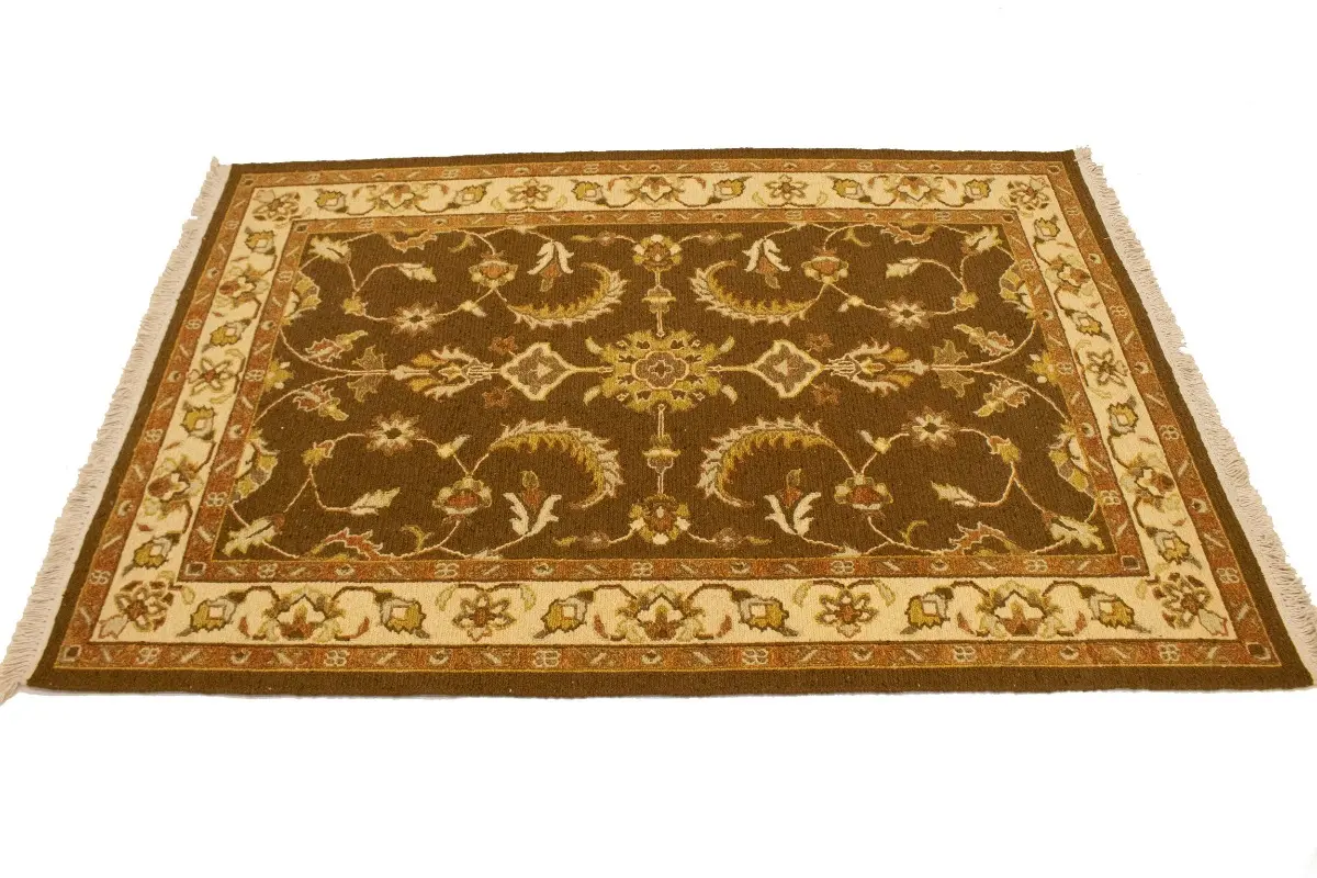 Handmade 4X6 brown Oriental rug made with vegetable dyes (fine wool pile and cotton foundation), exceptional knot count, and appealing ancient designs. This Oriental rug never will go out of style and would be among your most valuable treasures.