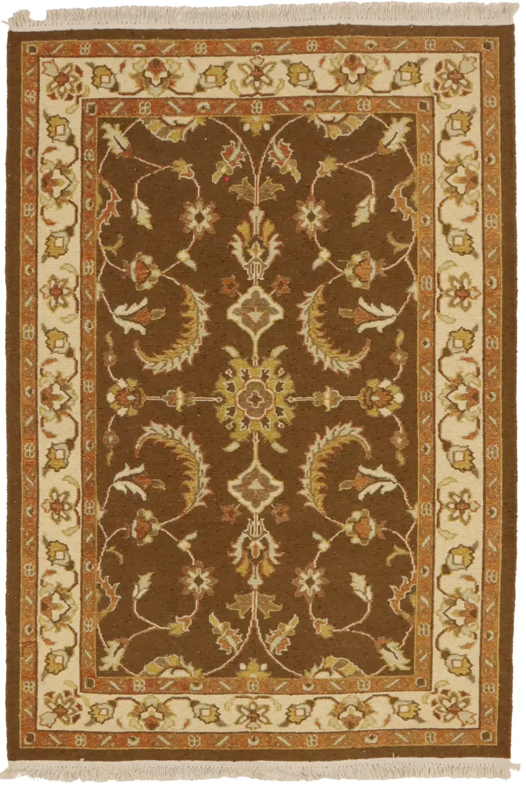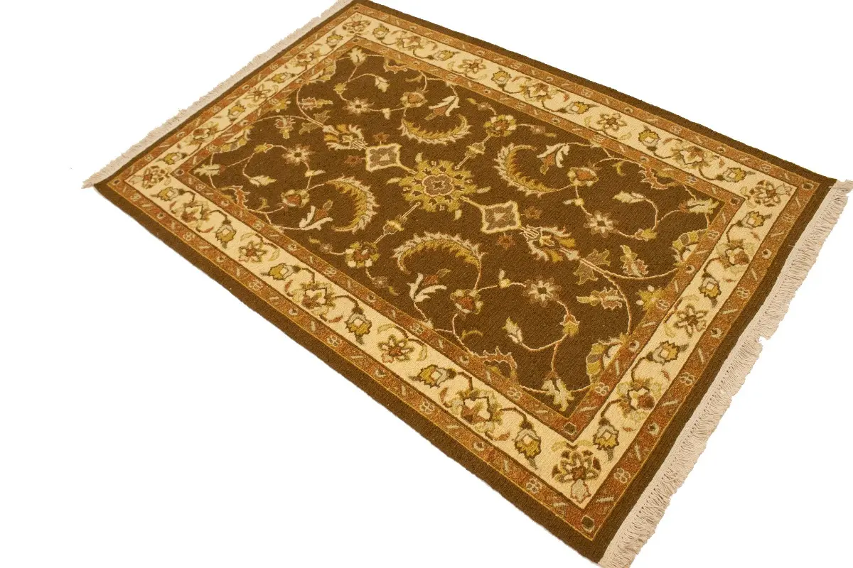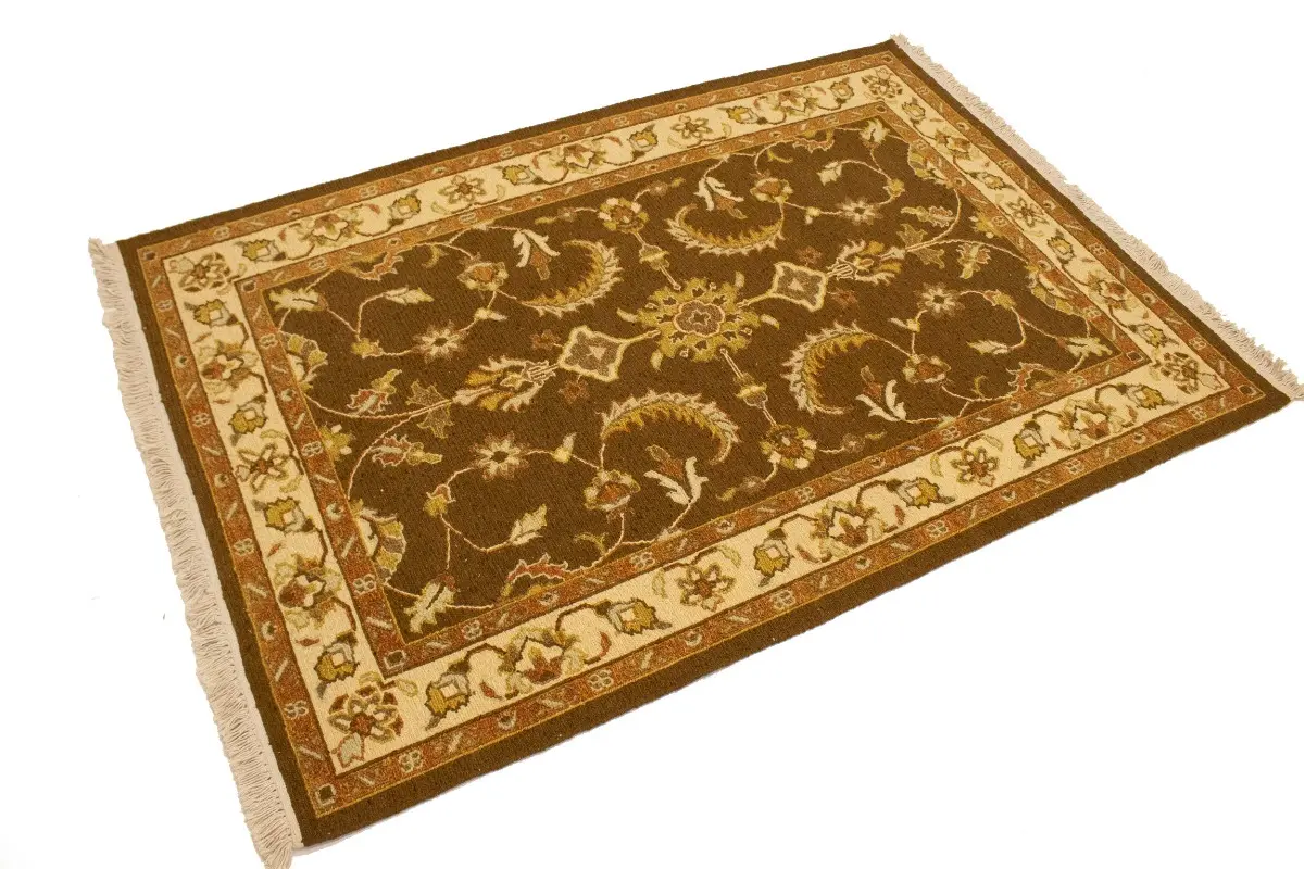 Handmade 4X6 brown Oriental rug made with vegetable dyes (fine wool pile and cotton foundation), exceptional knot count, and appealing ancient designs. This Oriental rug never will go out of style and would be among your most valuable treasures.
