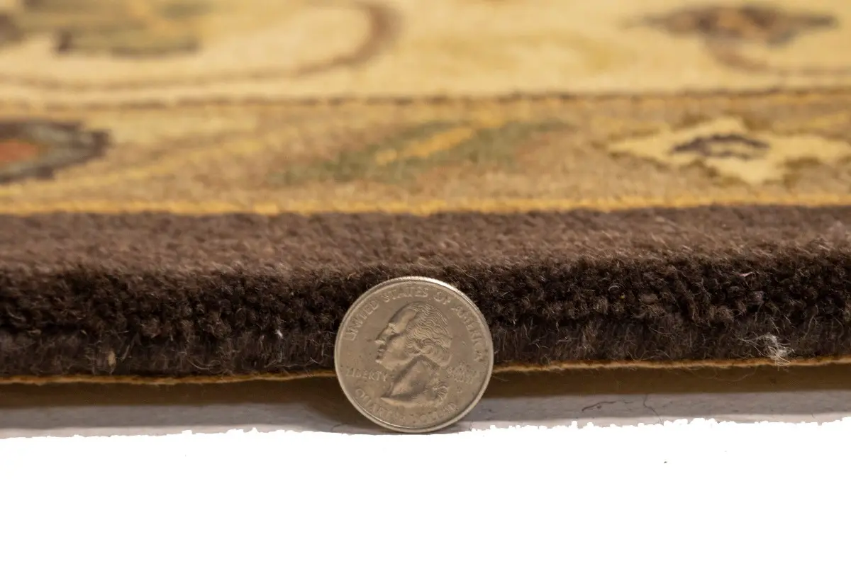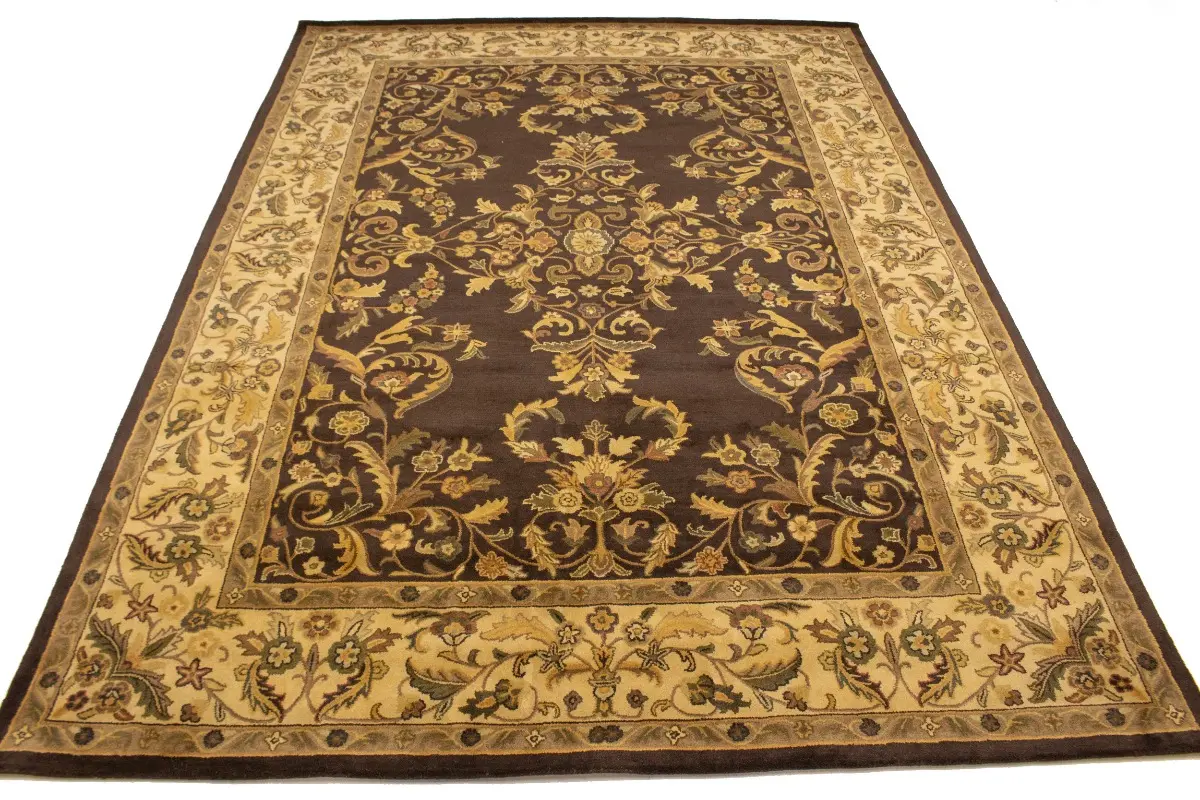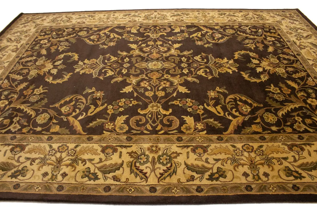 This genuine 9'5X13 dark brown new Oriental rug was made by the hands of gifted weavers inspired by a variety of spectacular artistic designs, to recreate the aged look of the original piece with a richness of color and ornately patterned background field. What set this vintage style Oriental area rug from the others are the material and dye used (wool pile and cotton foundation), knot count, ancient designs, fantastic grades, and its regional historical connection: it has deep roots, from the story of the people who produced it to the meaning of the symbols and colors displayed across its canvas that have been praised for centuries. This Indian home décor carpet will be completely cozy and inviting that never will go out of style! Also, this Oriental rug would be among your most valuable treasures, it is a great investment that accrues value over time, and it will last for generations because was woven with high-quality, all-natural wool. Environmentally friendly, opulent yet affordable; this rug will give you a thorough amount of character to help define your living space with elegance and warmth that will capture the eyes and attention of your audience (homeowners, designers, decorators, family and friends). OT-6790