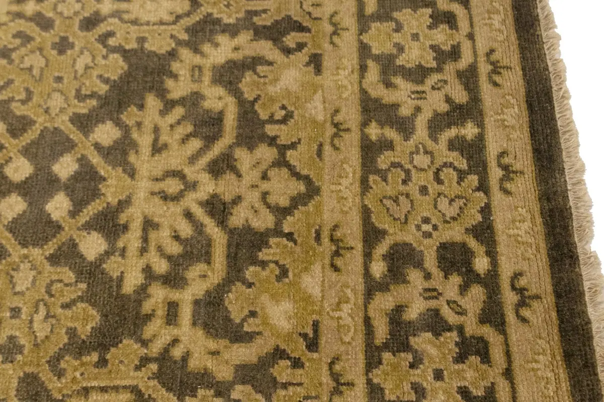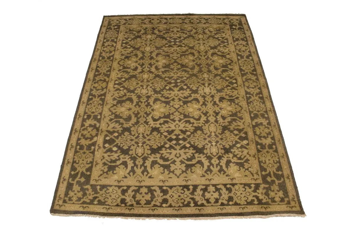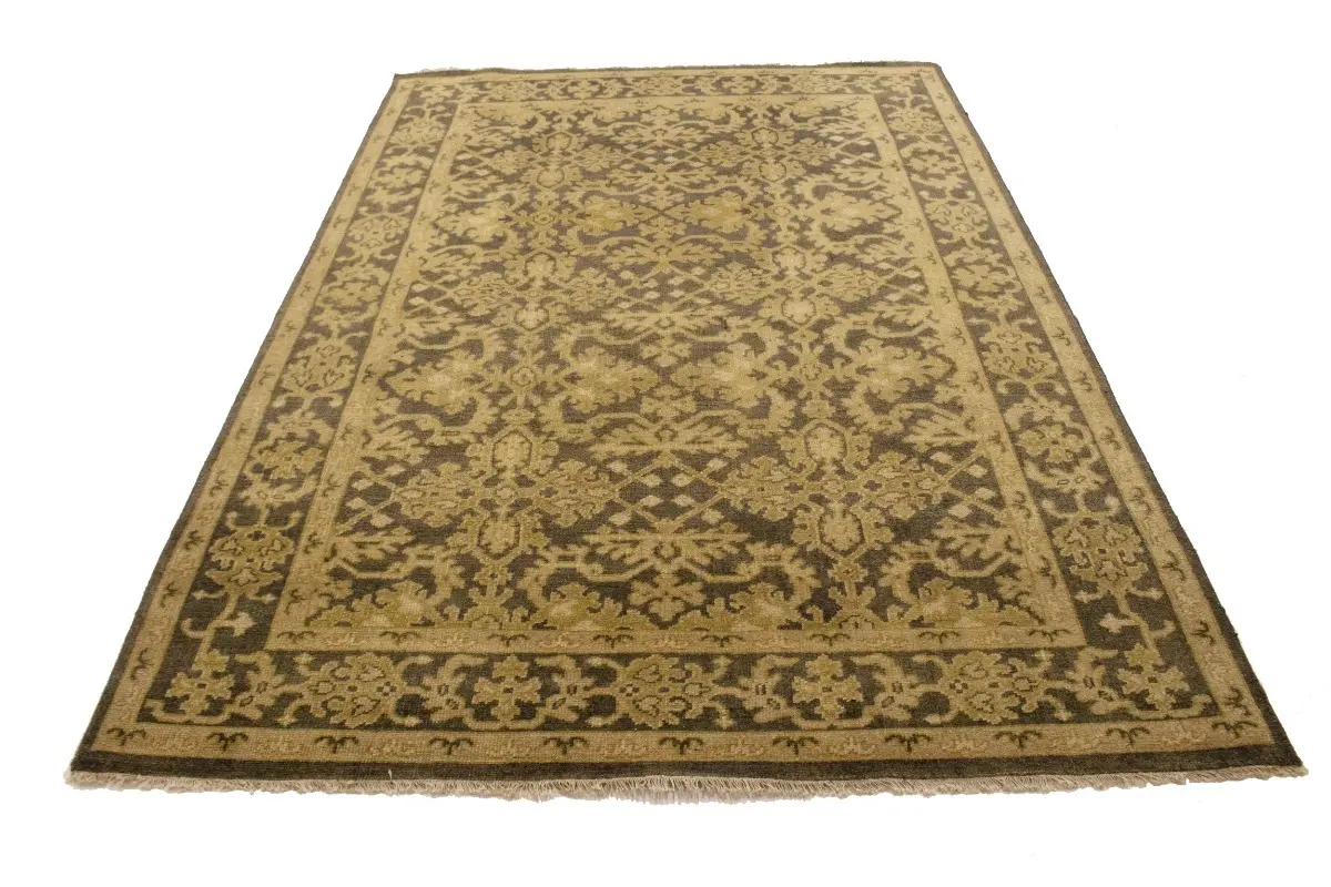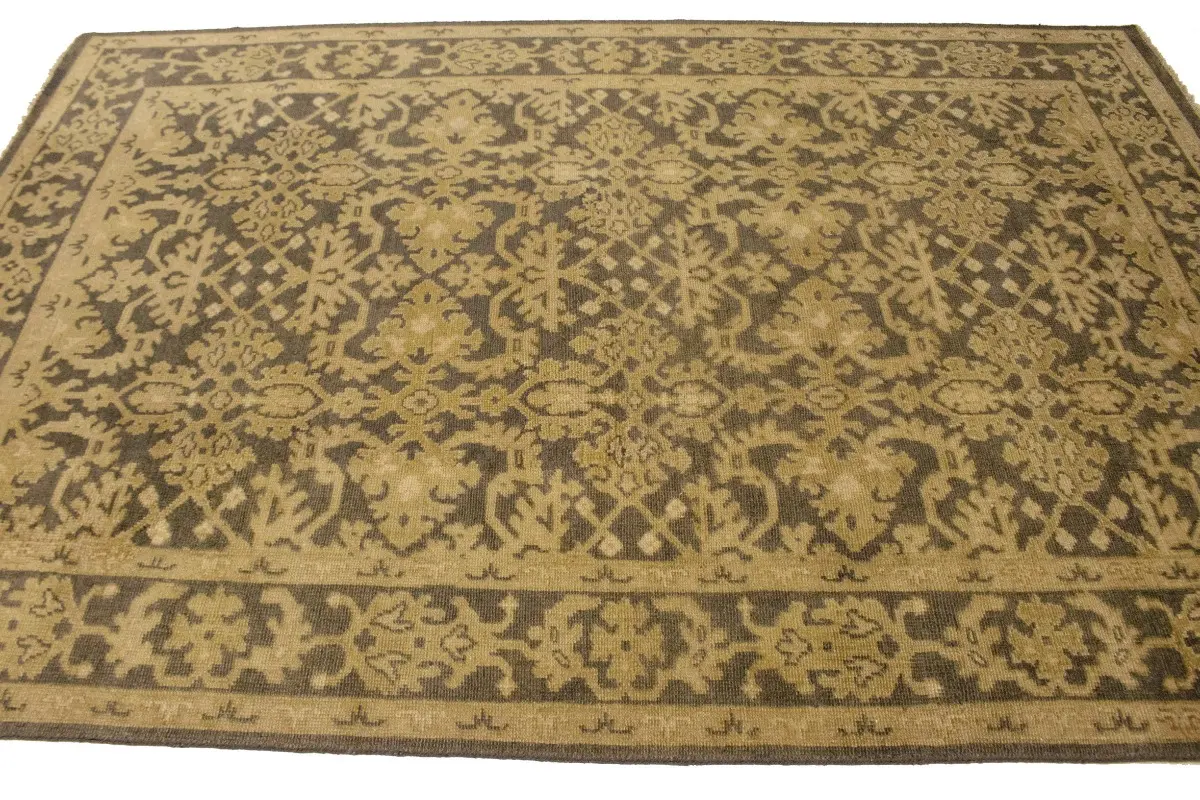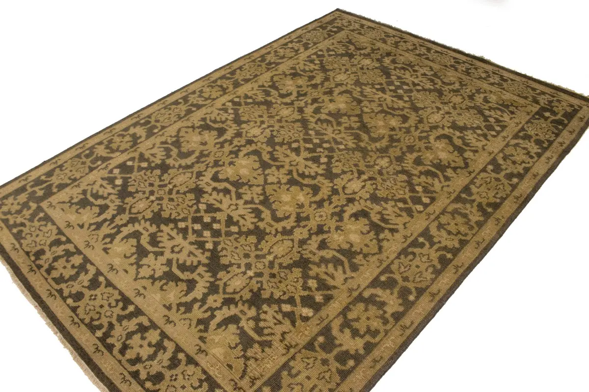 This authentic 6X9 brown new Oriental rug was masterly knotted by the hands of weavers inspired by a variety of wonderful artistic designs, to recreate the aged look of the original piece with a richness of color and intricate patterned background field. What set this vintage style Oriental area rug from the others are the material and dye used (wool pile and cotton foundation), knot count, antique designs, fantastic grades, and its regional historical connection: it has deep roots, from the story of the people who produced it to the meaning of the symbols and colors displayed across its canvas that have been praised for centuries. This Indian home décor carpet will be completely cozy and inviting that never will go out of style! Also, this Oriental rug would be among your most valuable treasures, it is a great investment that accrues value over time, and it will last for generations because was woven with high-quality, all-natural wool. Environmentally friendly, opulent yet affordable; this rug will give you a thorough amount of character to help define your living space with luxury and warmth that will capture the eyes and attention of your audience (homeowners, designers, decorators, family and friends). OT-6817