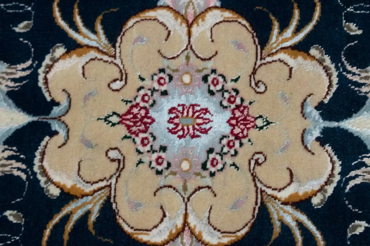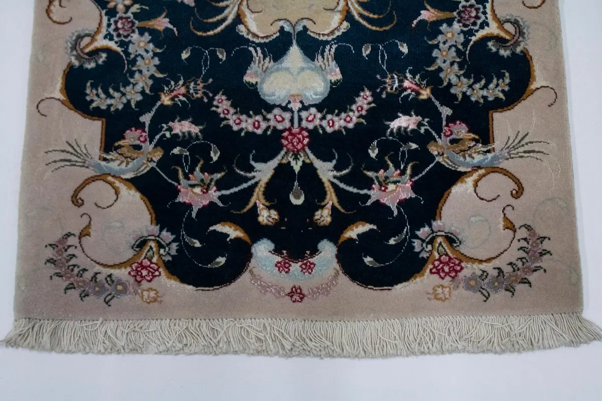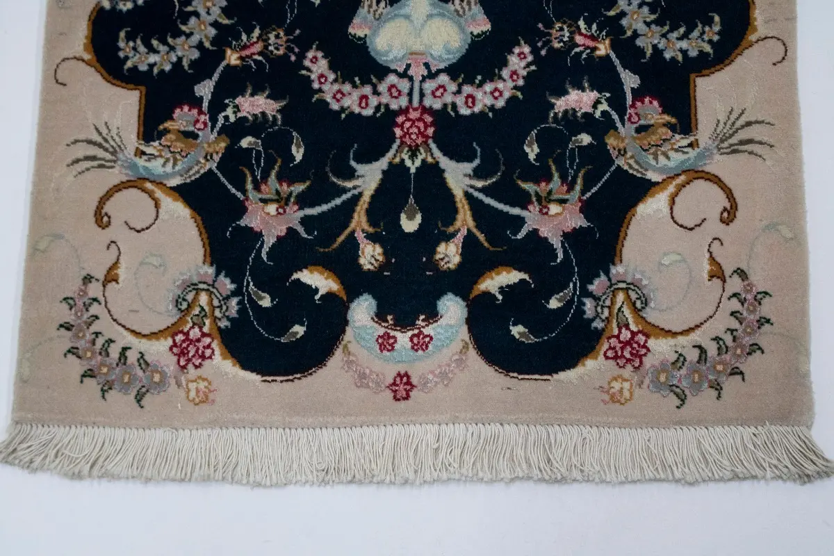 Handmade 2X3 dark navy Persian rug made with vegetable dyes (fine wool pile and cotton foundation), exceptional knot count, and appealing ancient designs. This Oriental rug never will go out of style and would be among your most valuable treasures.