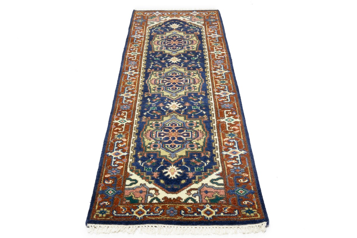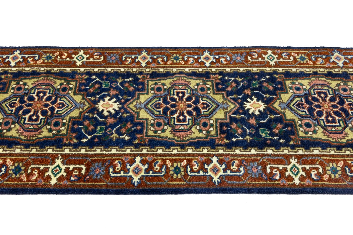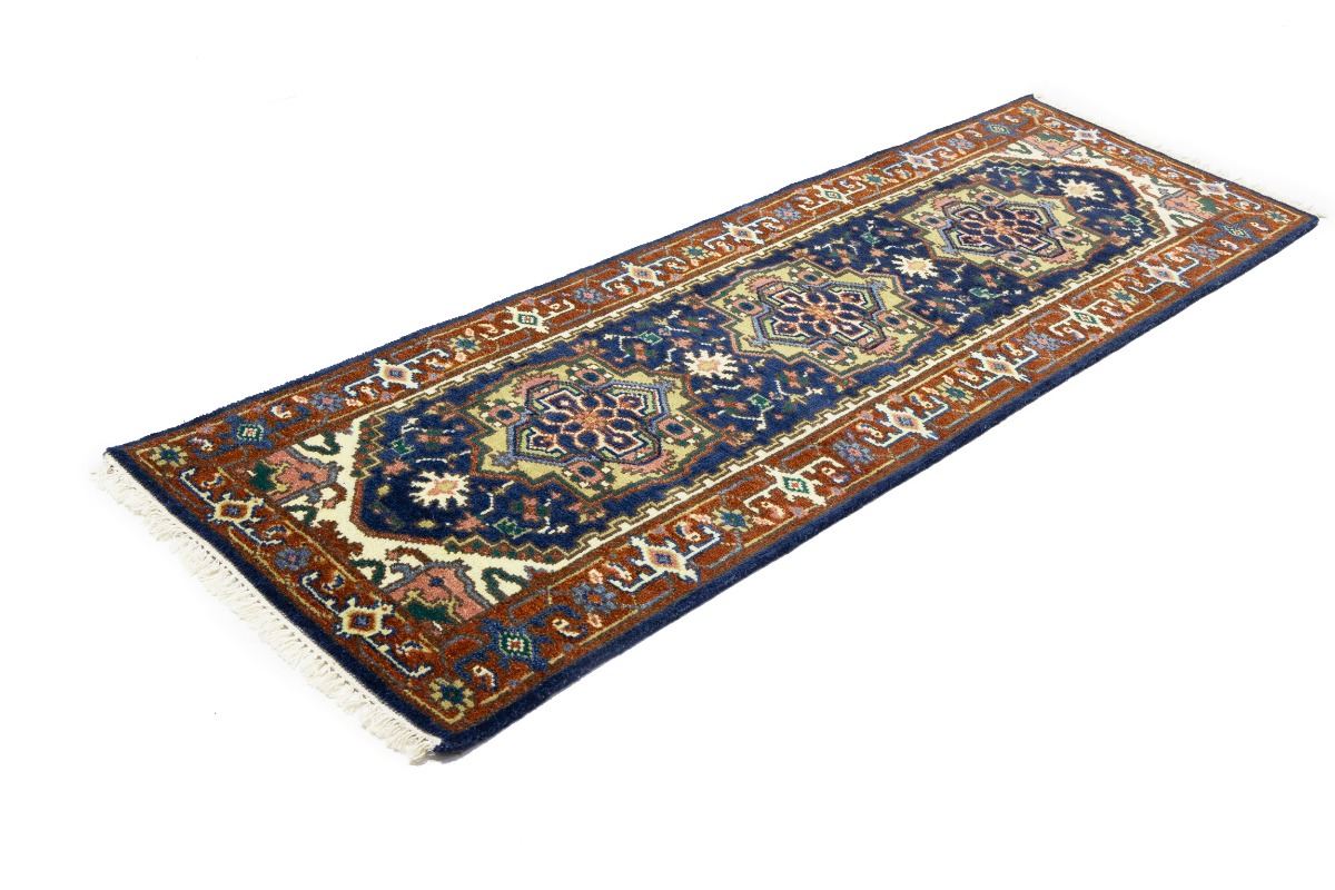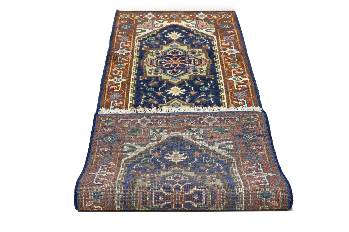 This authentic 3X8 blue new Oriental runner was crafted by the hands of skilled weavers enthused by a variety of lovely artistic designs, to recreate the aged look of the unique piece with a richness of color and beautifully elaborated background field. What set this vintage style Oriental area runner from the others are the material and dye used (wool pile and cotton foundation), knot count, ancient designs, fantastic grades, and its regional historical connection: it has deep roots, from the story of the people who produced it to the meaning of the symbols and colors displayed across its canvas that have been praised for centuries. This Indian home décor carpet will be completely cozy and inviting that never will go out of style! Also, this Oriental rug would be among your most valuable treasures, it is a great investment that increase in value over time, and it will last for generations because was woven with high-quality, all-natural wool. Environmentally friendly, opulent yet affordable; this runner will give you a thorough amount of character to help define your living space with sophistication and warmth that will capture the eyes and attention of your audience (homeowners, designers, decorators, family and friends). OT-8053