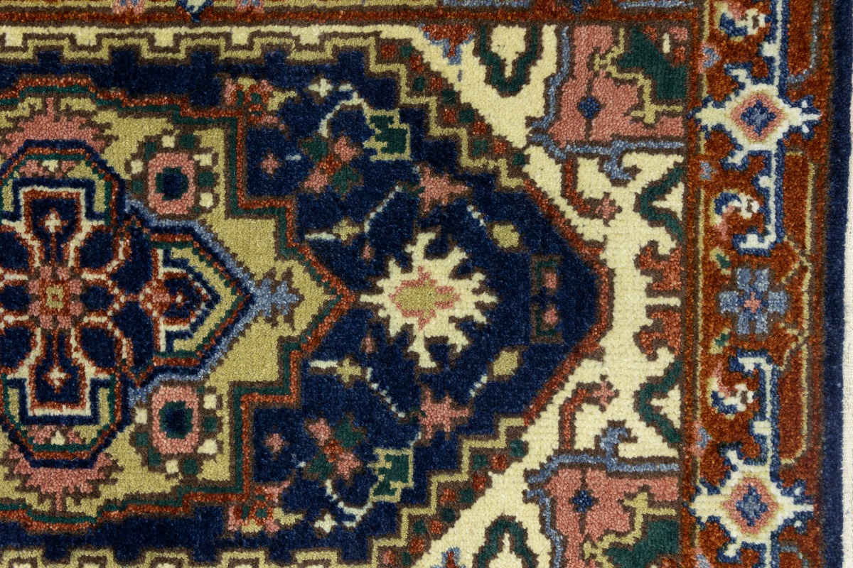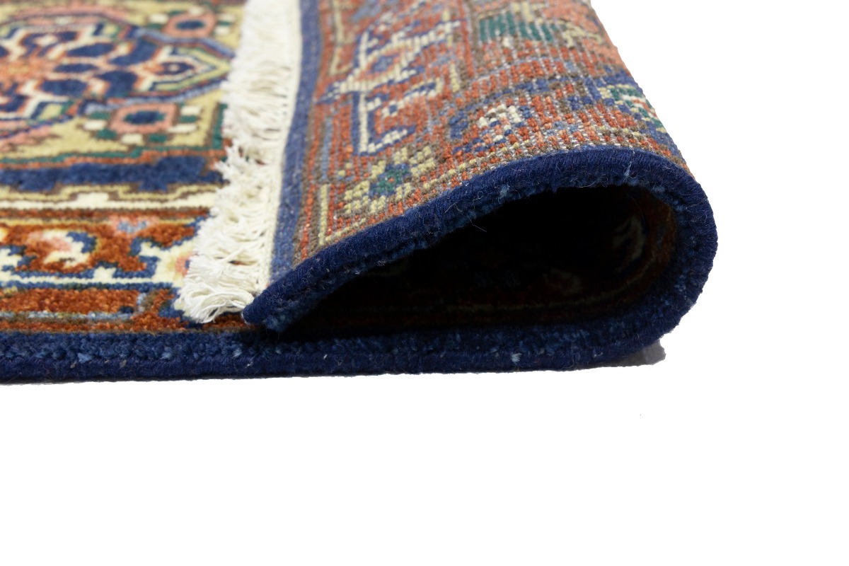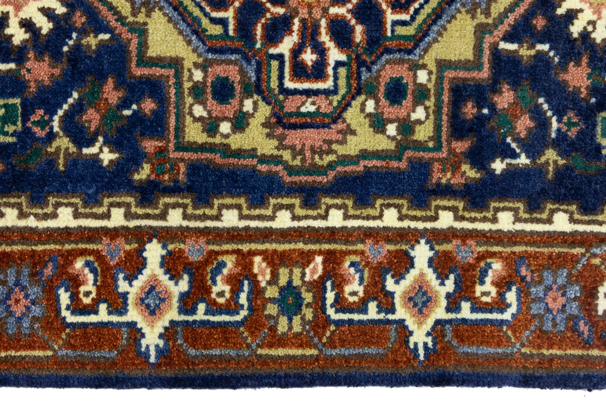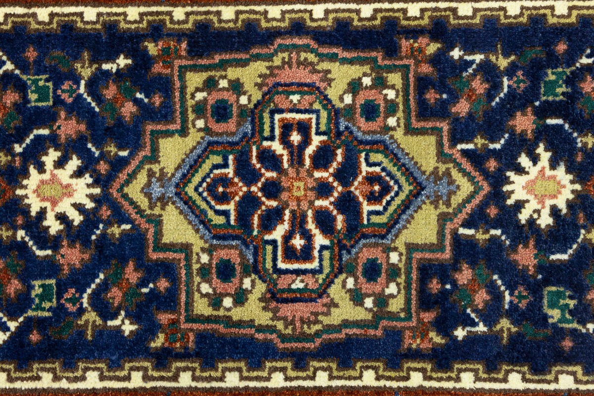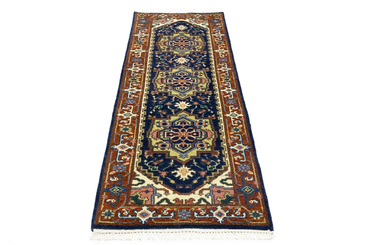 This authentic 3X8 blue new Oriental runner was crafted by the hands of skilled weavers enthused by a variety of lovely artistic designs, to recreate the aged look of the unique piece with a richness of color and beautifully elaborated background field. What set this vintage style Oriental area runner from the others are the material and dye used (wool pile and cotton foundation), knot count, ancient designs, fantastic grades, and its regional historical connection: it has deep roots, from the story of the people who produced it to the meaning of the symbols and colors displayed across its canvas that have been praised for centuries. This Indian home décor carpet will be completely cozy and inviting that never will go out of style! Also, this Oriental rug would be among your most valuable treasures, it is a great investment that increase in value over time, and it will last for generations because was woven with high-quality, all-natural wool. Environmentally friendly, opulent yet affordable; this runner will give you a thorough amount of character to help define your living space with sophistication and warmth that will capture the eyes and attention of your audience (homeowners, designers, decorators, family and friends). OT-8053