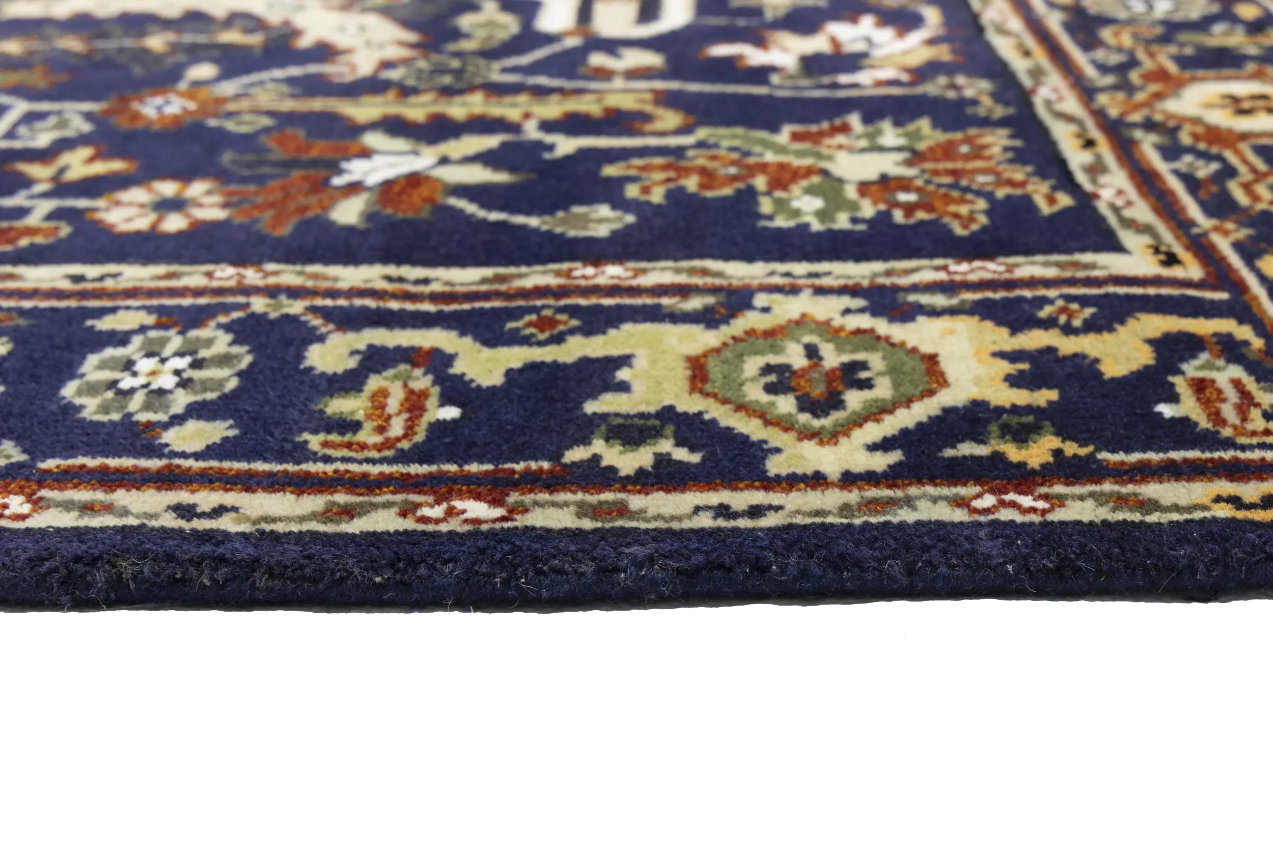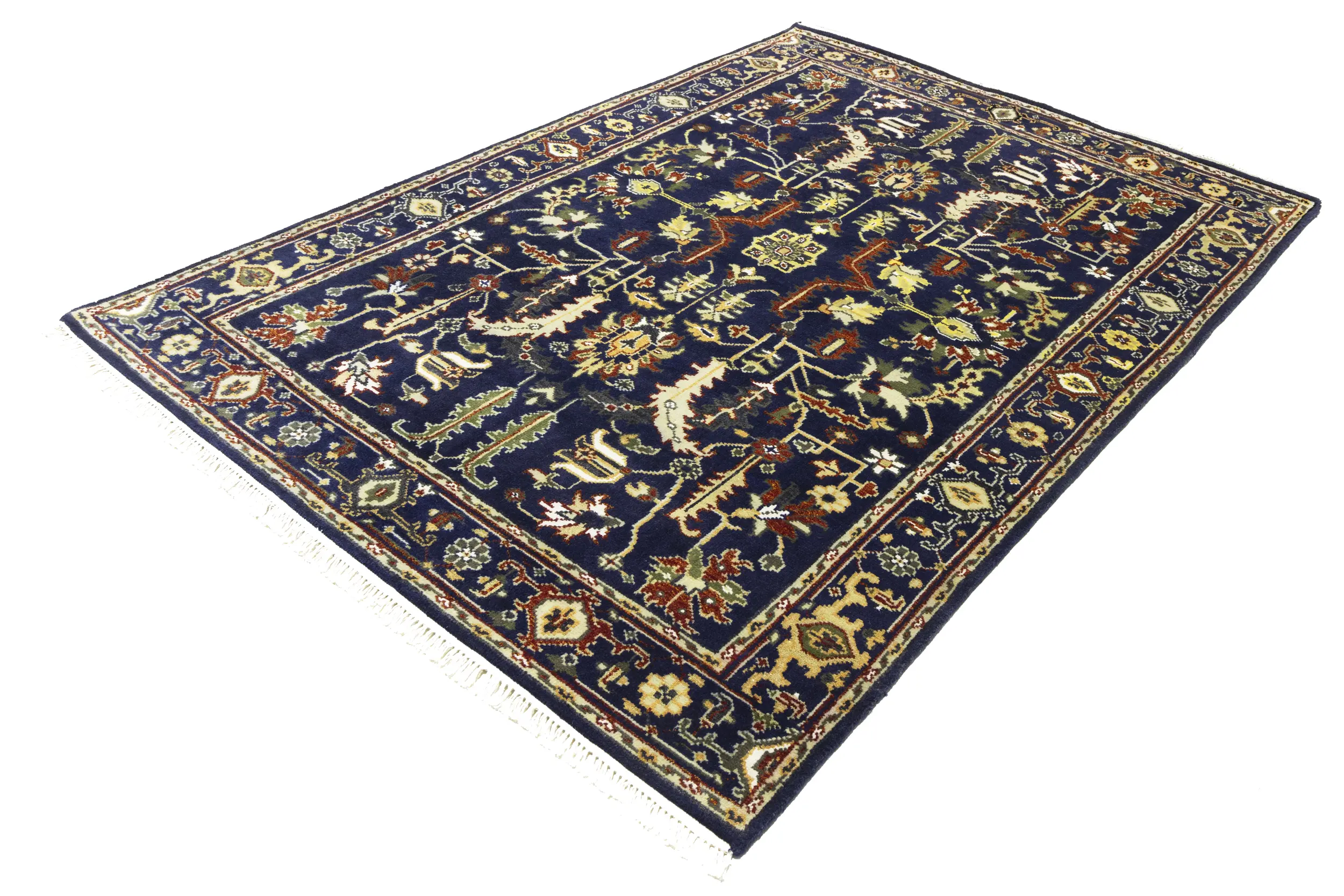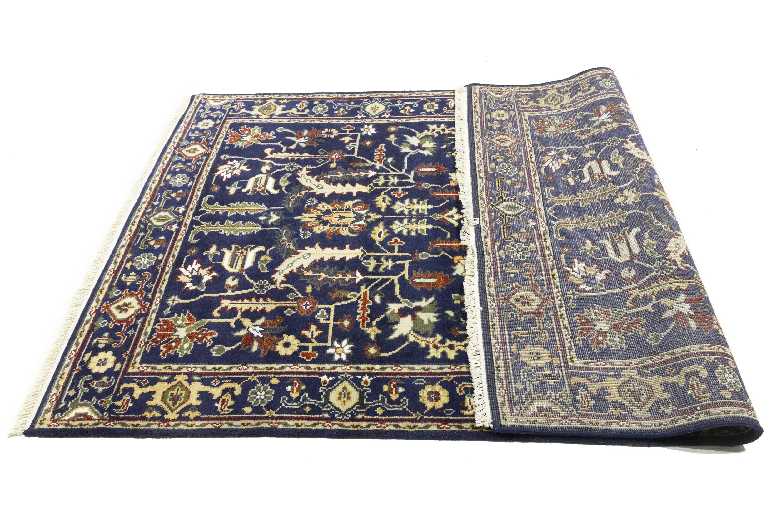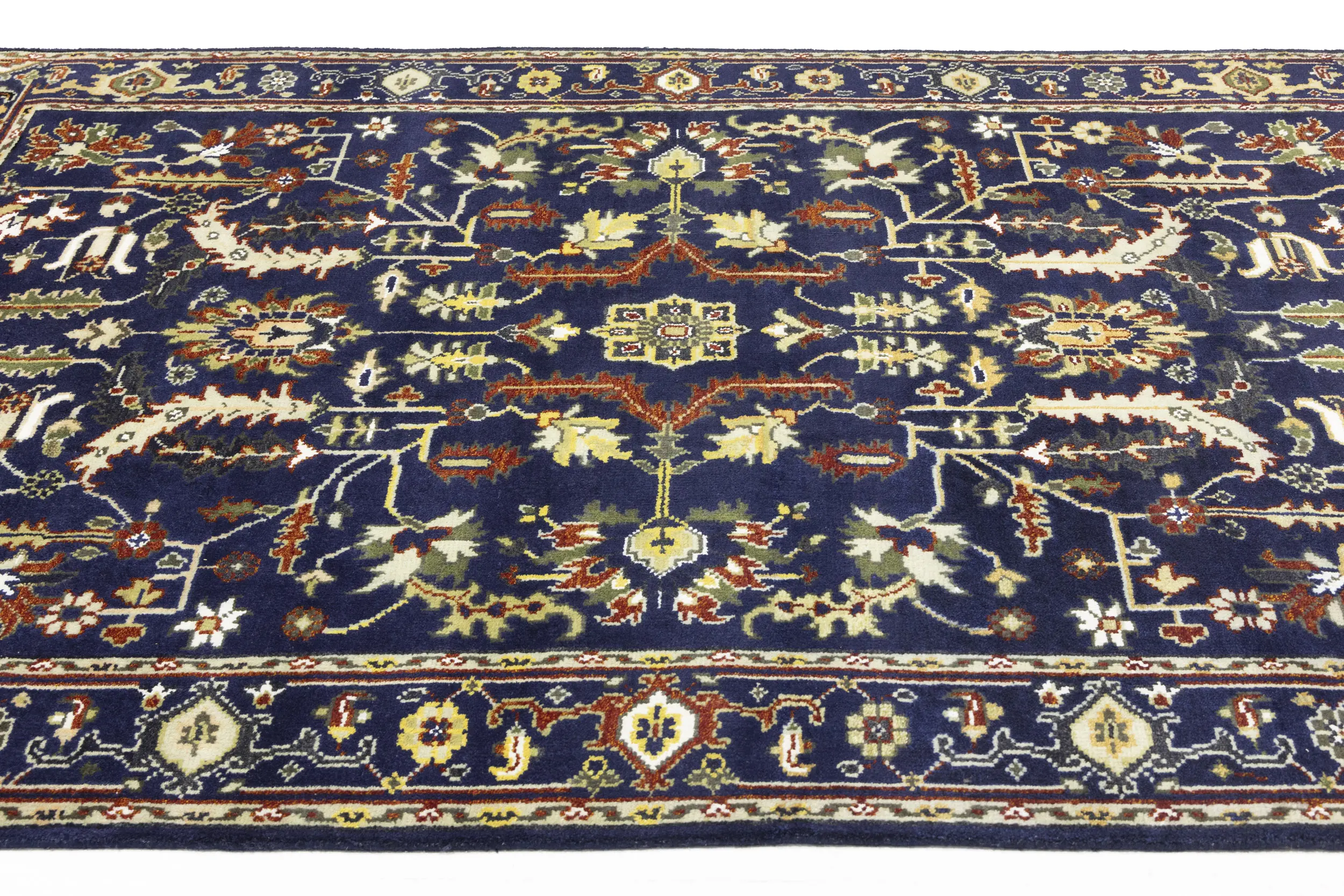 This genuine 6X9 blue new Oriental rug was made by the hands of gifted weavers inspired by a variety of spectacular artistic designs, to recreate the aged look of the original piece with a richness of color and ornately patterned background field. What set this vintage style Oriental area rug from the others are the material and dye used (wool pile and cotton foundation), knot count, ancient designs, fantastic grades, and its regional historical connection: it has deep roots, from the story of the people who produced it to the meaning of the symbols and colors displayed across its canvas that have been praised for centuries. This Indian home décor carpet will be completely cozy and inviting that never will go out of style! Also, this Oriental rug would be among your most valuable treasures, it is a great investment that accrues value over time, and it will last for generations because was woven with high-quality, all-natural wool. Environmentally friendly, opulent yet affordable; this rug will give you a thorough amount of character to help define your living space with elegance and warmth that will capture the eyes and attention of your audience (homeowners, designers, decorators, family and friends).