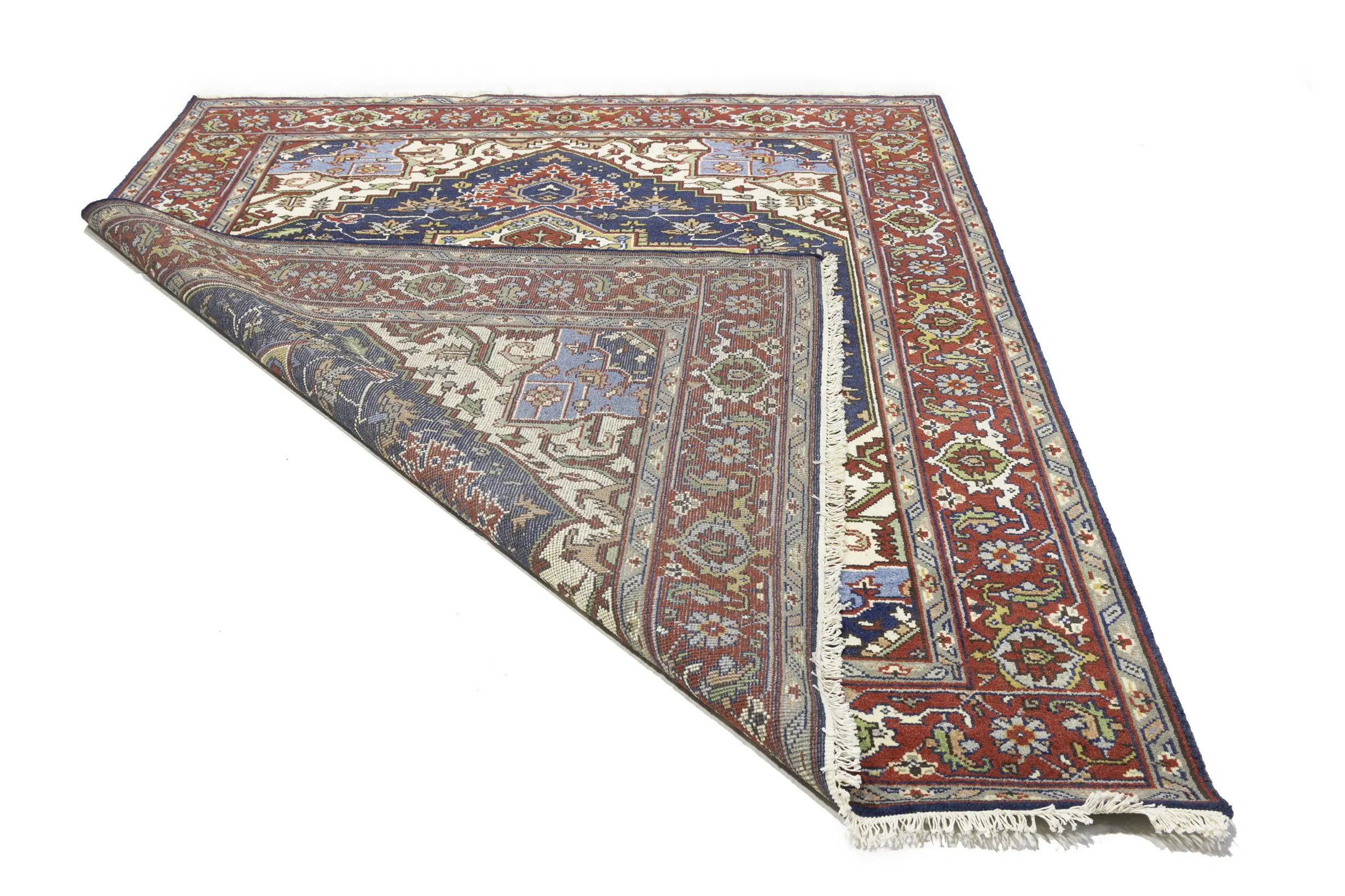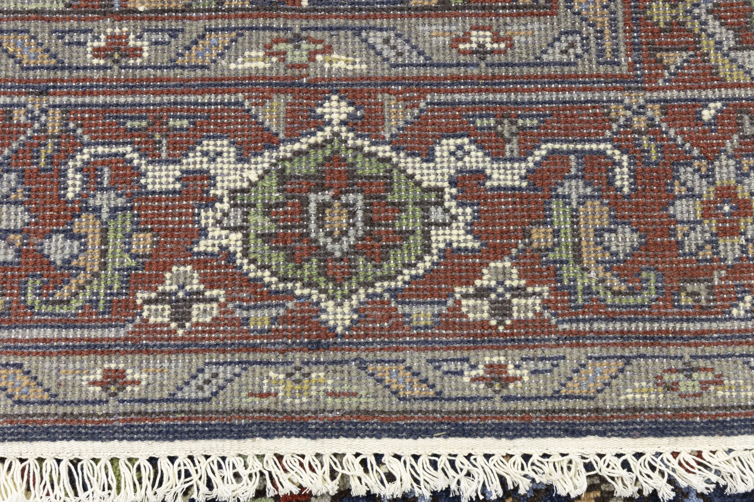 This original 8X10 blue new Oriental rug was finely knotted by the hands of weavers influenced by a variety of amazing artistic designs, to recreate the aged look of the exceptional piece with a richness of color and embellished background field. What set this vintage style Oriental area rug from the others are the material and dye used (wool pile and cotton foundation), knot count, antique designs, fantastic grades, and its regional historical connection: it has deep roots, from the story of the people who produced it to the meaning of the symbols and colors displayed across its canvas that have been praised for centuries. This Indian home décor carpet will be completely cozy and inviting that never will go out of style!