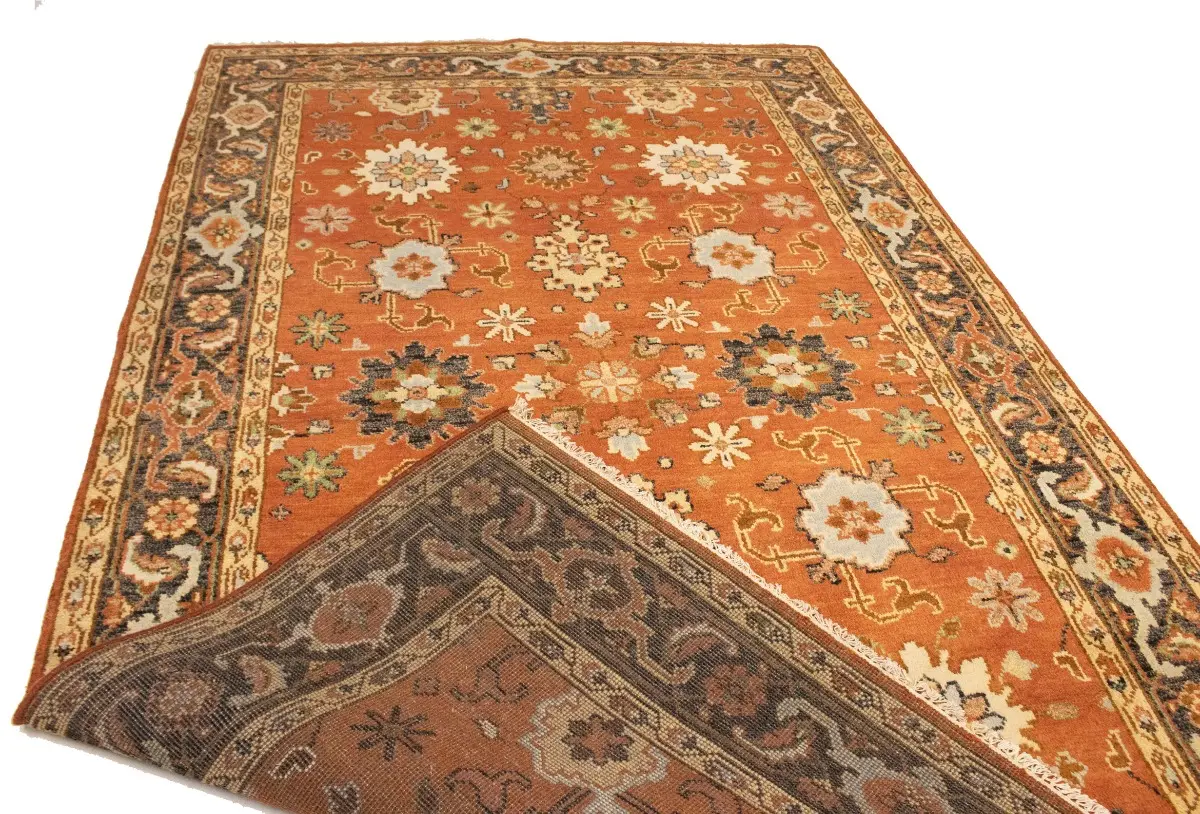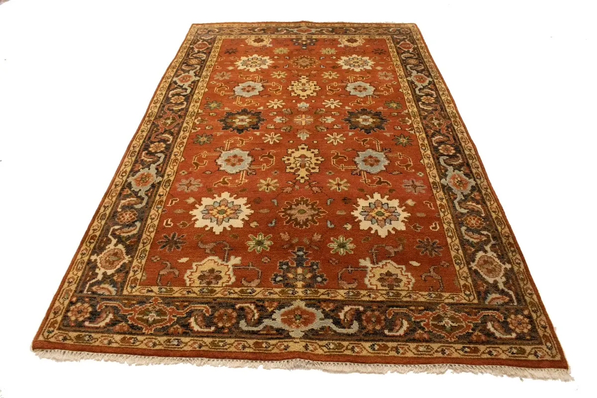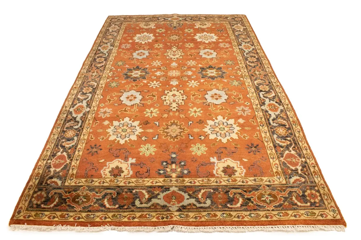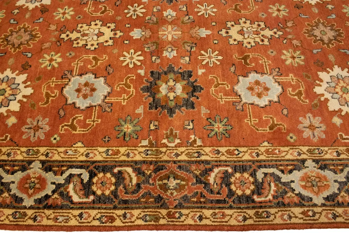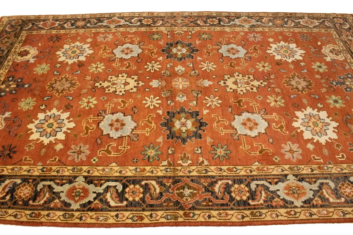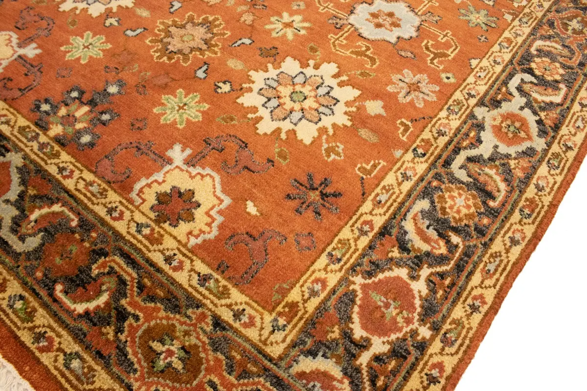 This original 6X10 orange new Oriental rug was finely knotted by the hands of weavers influenced by a variety of amazing artistic designs, to recreate the aged look of the exceptional piece with a richness of color and embellished background field. What set this vintage style Oriental area rug from the others are the material and dye used (wool pile and cotton foundation), knot count, antique designs, fantastic grades, and its regional historical connection: it has deep roots, from the story of the people who produced it to the meaning of the symbols and colors displayed across its canvas that have been praised for centuries. This Indian home décor carpet will be completely cozy and inviting that never will go out of style! Also, this Oriental rug would be among your most valuable treasures, it is a great investment that increase in value over time, and it will last a lifetime because was woven with high-quality, all-natural wool. Eco-friendly, opulent yet affordable; this rug will give you an extra pop of character to help define your home environment with luxury and warmth that will capture the eyes and attention of your audience (homeowners, designers, decorators, family and friends). OT-6022