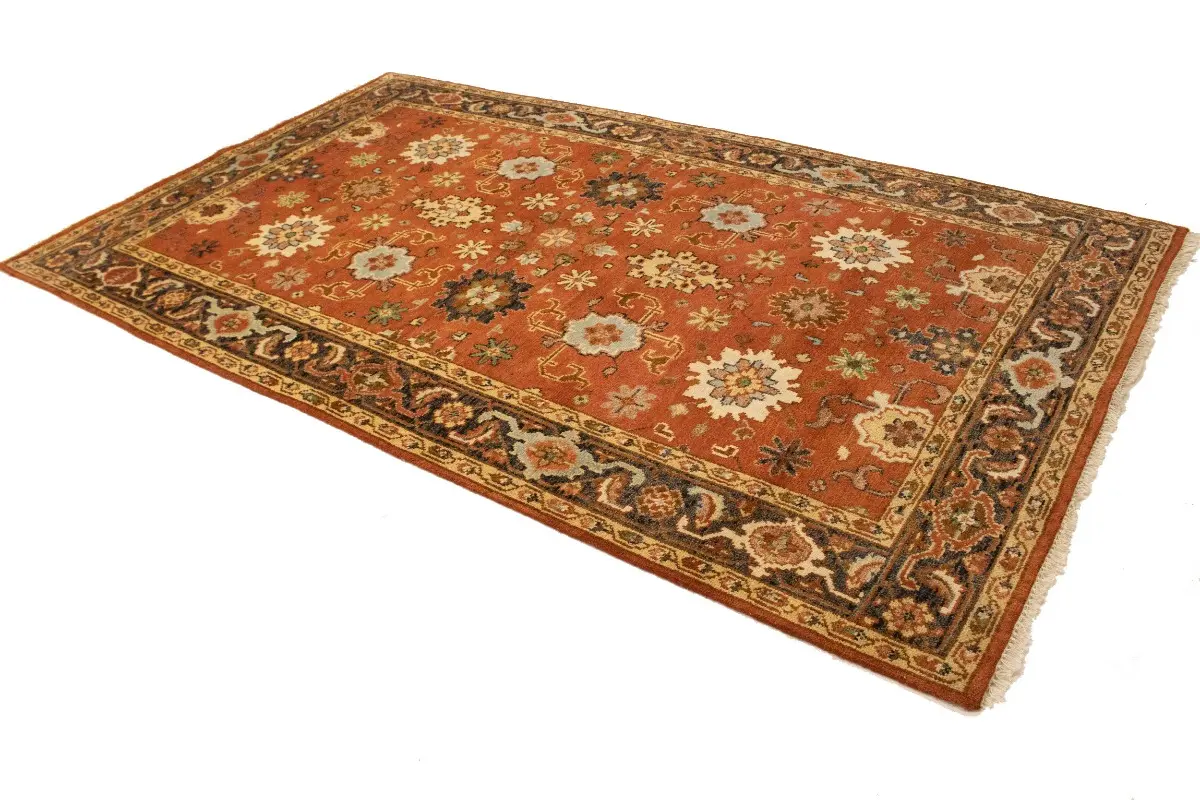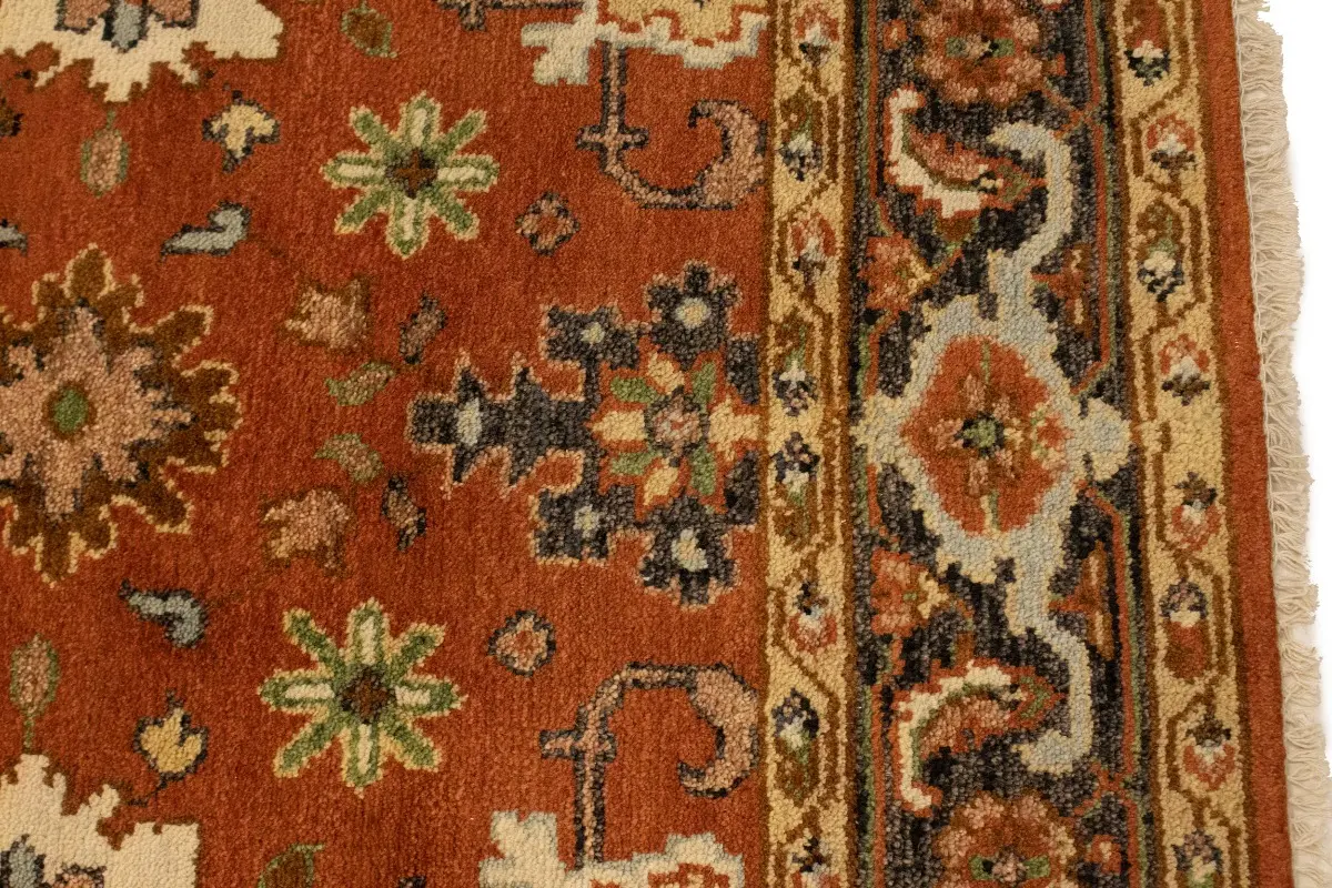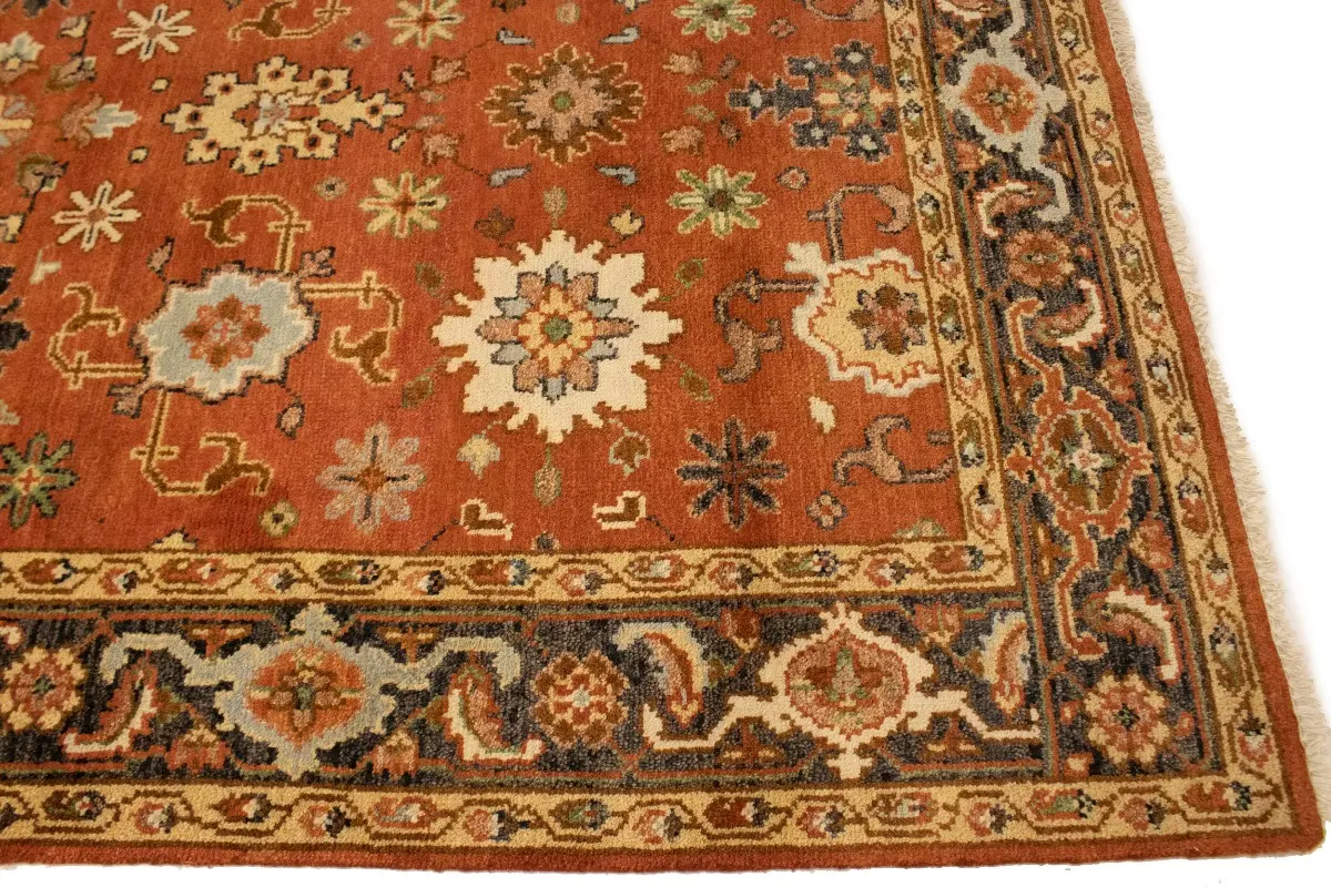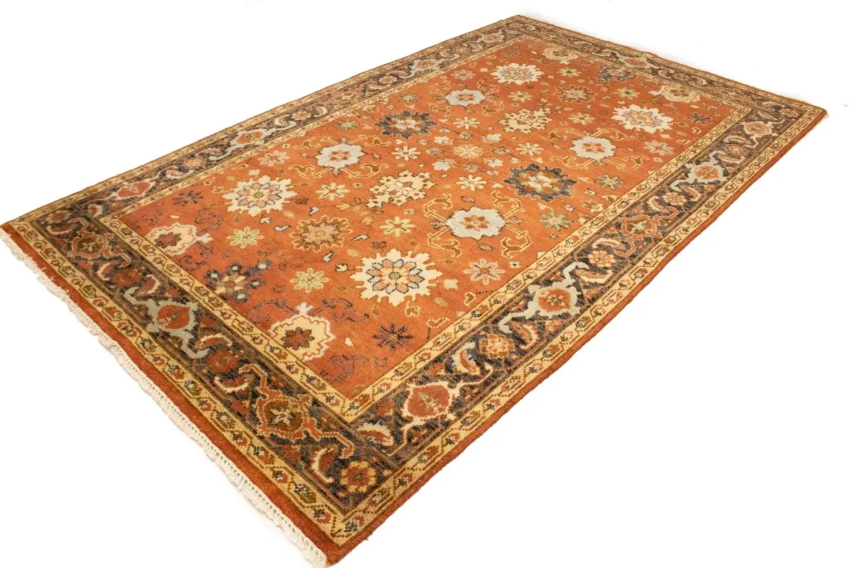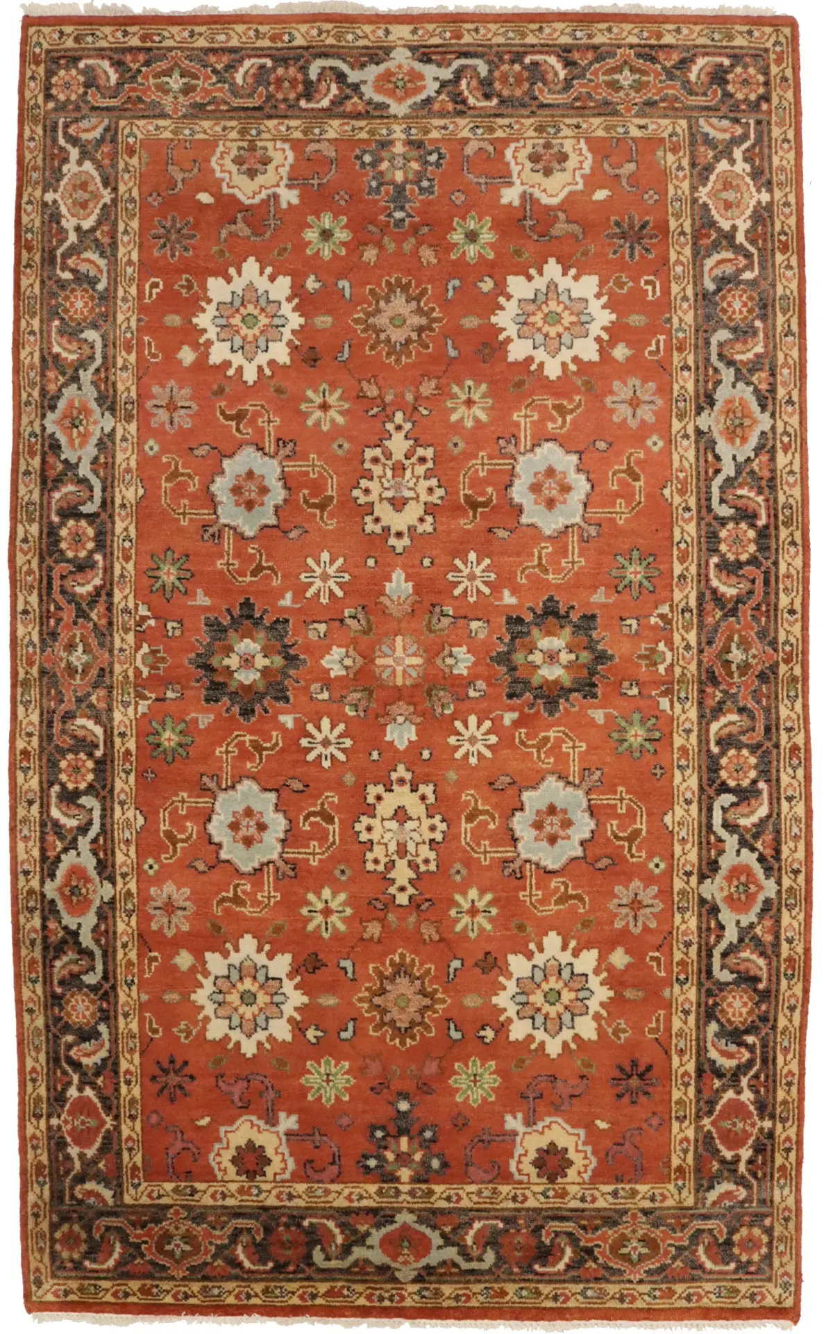 This original 6X10 orange new Oriental rug was finely knotted by the hands of weavers influenced by a variety of amazing artistic designs, to recreate the aged look of the exceptional piece with a richness of color and embellished background field. What set this vintage style Oriental area rug from the others are the material and dye used (wool pile and cotton foundation), knot count, antique designs, fantastic grades, and its regional historical connection: it has deep roots, from the story of the people who produced it to the meaning of the symbols and colors displayed across its canvas that have been praised for centuries. This Indian home décor carpet will be completely cozy and inviting that never will go out of style! Also, this Oriental rug would be among your most valuable treasures, it is a great investment that increase in value over time, and it will last a lifetime because was woven with high-quality, all-natural wool. Eco-friendly, opulent yet affordable; this rug will give you an extra pop of character to help define your home environment with luxury and warmth that will capture the eyes and attention of your audience (homeowners, designers, decorators, family and friends). OT-6022