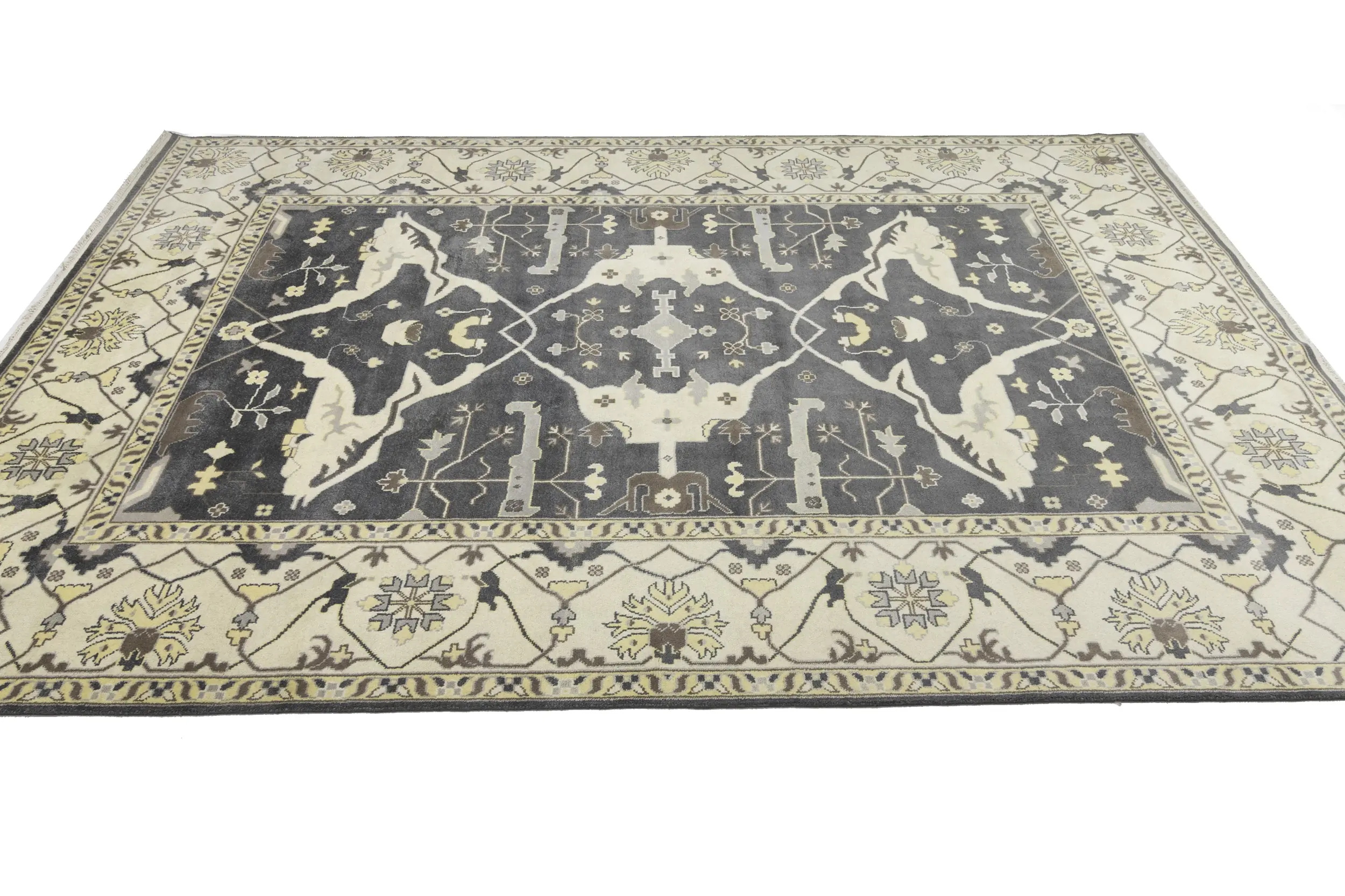 This original 10X14 gray new Oriental rug was finely knotted by the hands of weavers influenced by a variety of amazing artistic designs, to recreate the aged look of the exceptional piece with a richness of color and embellished background field. What set this vintage style Oriental area rug from the others are the material and dye used (wool pile and cotton foundation), knot count, antique designs, fantastic grades, and its regional historical connection: it has deep roots, from the story of the people who produced it to the meaning of the symbols and colors displayed across its canvas that have been praised for centuries. This Indian home décor carpet will be completely cozy and inviting that never will go out of style! Also, this Oriental rug would be among your most valuable treasures, it is a great investment that increase in value over time, and it will last a lifetime because was woven with high-quality, all-natural wool. Eco-friendly, opulent yet affordable; this rug will give you an extra pop of character to help define your home environment with luxury and warmth that will capture the eyes and attention of your audience (homeowners, designers, decorators, family and friends).