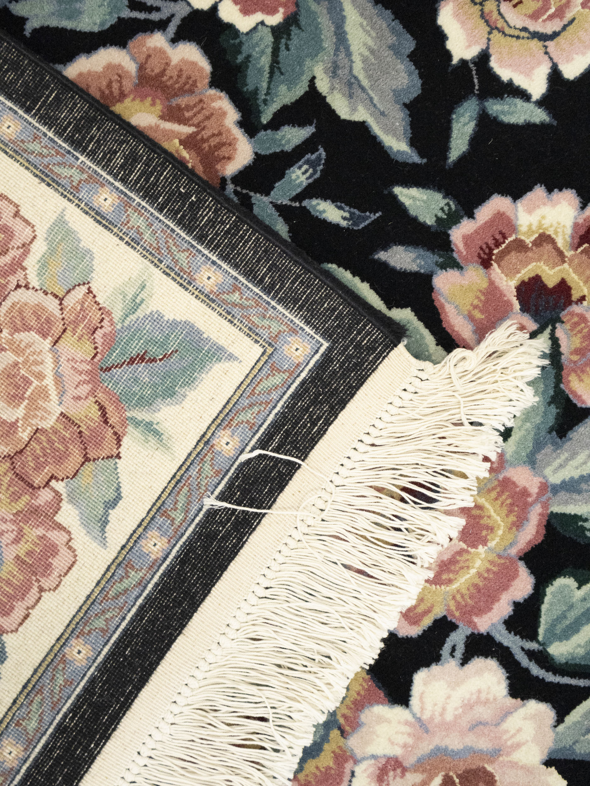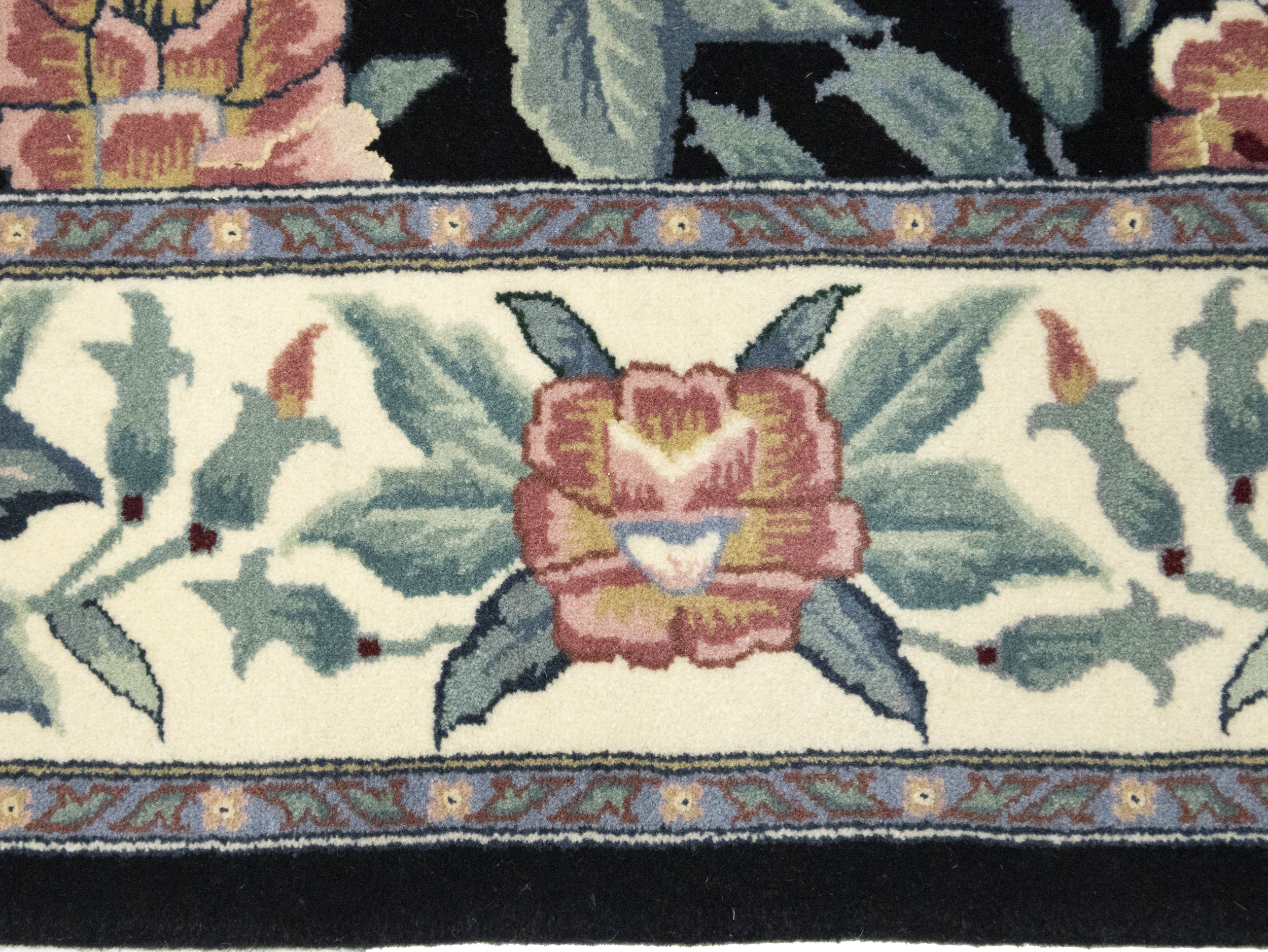 Handmade 6X9 black oriental rug made with vegetable dyes (fine wool pile and cotton foundation), exceptional knot count, and appealing ancient designs. This Oriental rug never will go out of style and would be among your most valuable treasures.