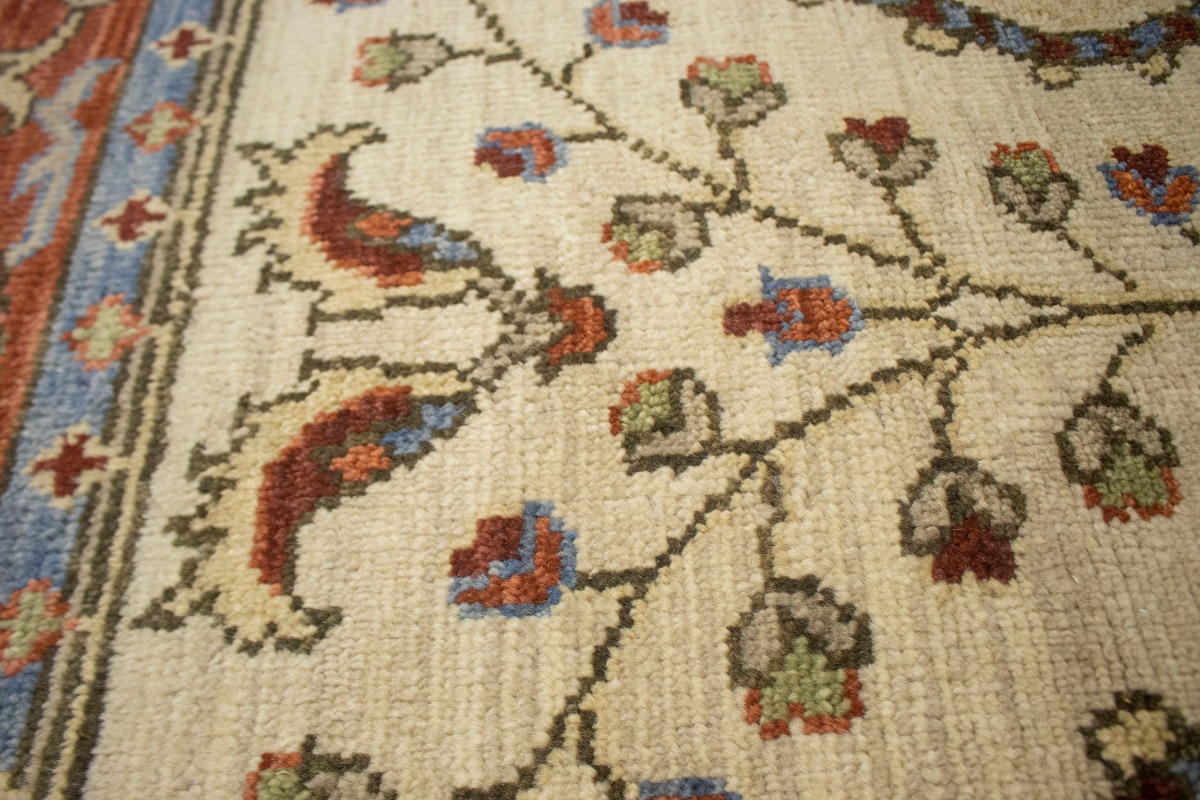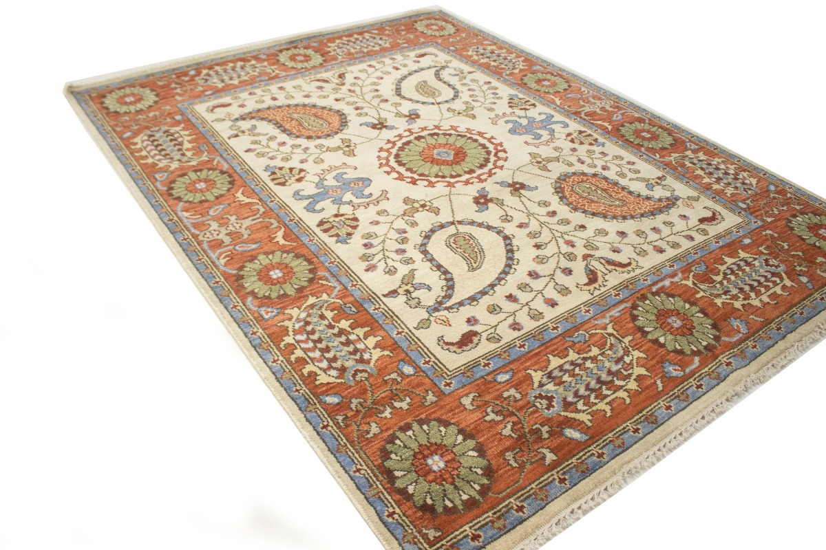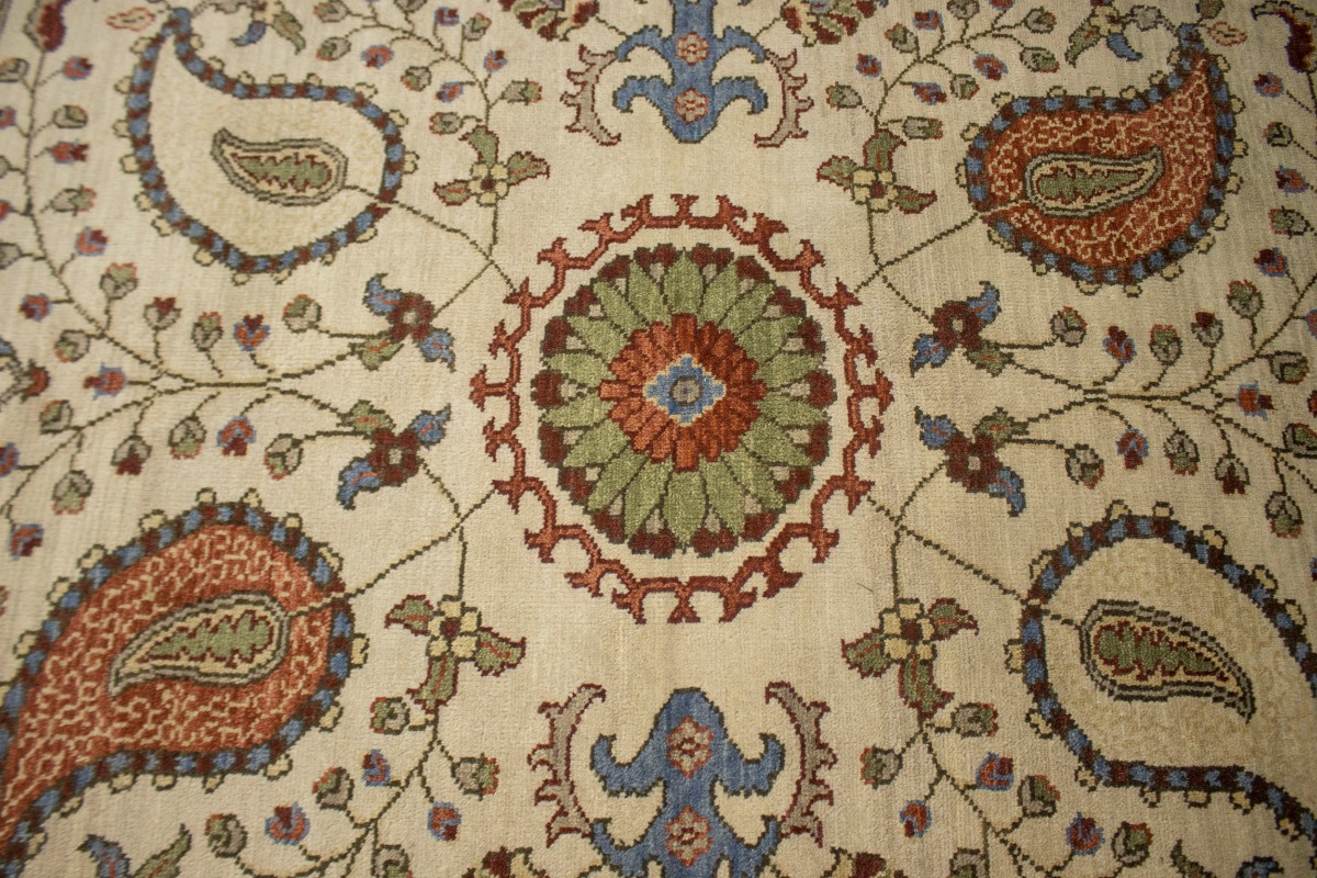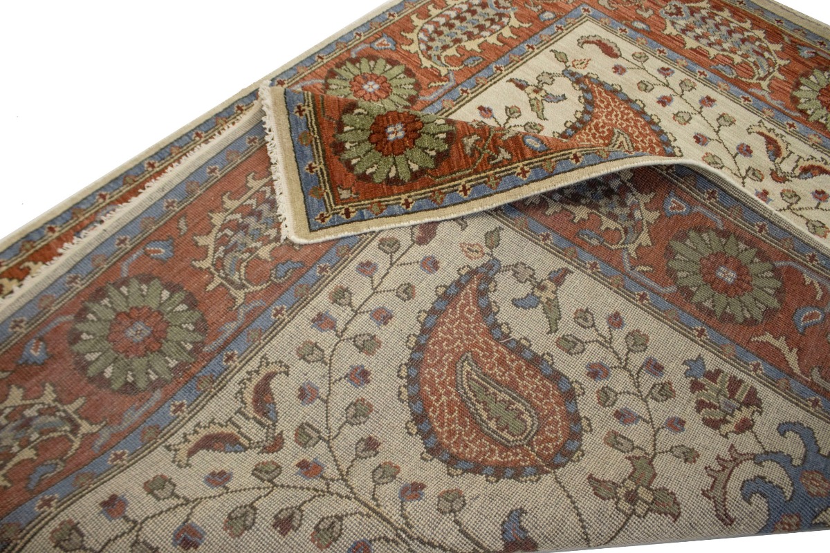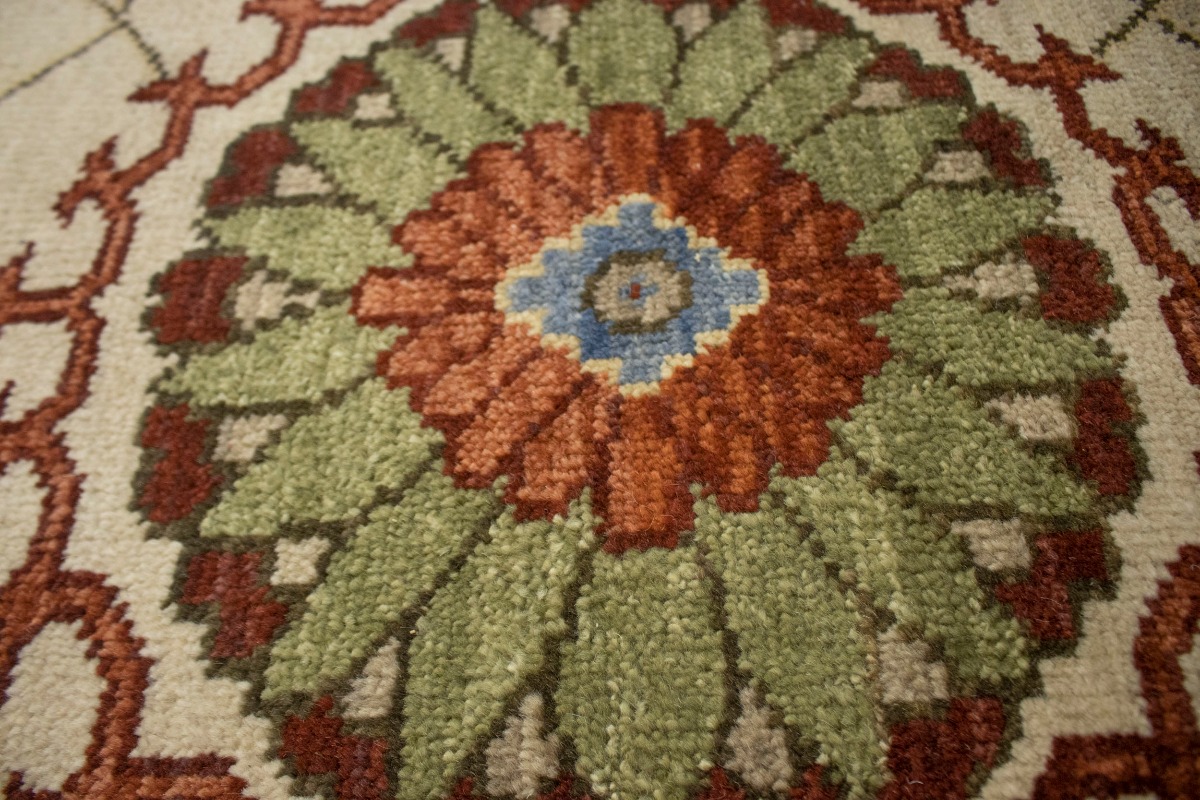 This authentic 8X10 cream new Oriental rug was crafted by the hands of skilled weavers enthused by a variety of lovely artistic designs, to recreate the aged look of the unique piece with a richness of color and beautifully elaborated background field. What set this vintage style Oriental area rug from the others are the material and dye used (wool pile and cotton foundation), knot count, ancient designs, fantastic grades, and its regional historical connection: it has deep roots, from the story of the people who produced it to the meaning of the symbols and colors displayed across its canvas that have been praised for centuries. This Indian home décor carpet will be completely cozy and inviting that never will go out of style! Also, this Oriental rug would be among your most valuable treasures, it is a great investment that increase in value over time, and it will last for generations because was woven with high-quality, all-natural wool. Environmentally friendly, opulent yet affordable; this rug will give you a thorough amount of character to help define your living space with sophistication and warmth that will capture the eyes and attention of your audience (homeowners, designers, decorators, family and friends). OT-3717