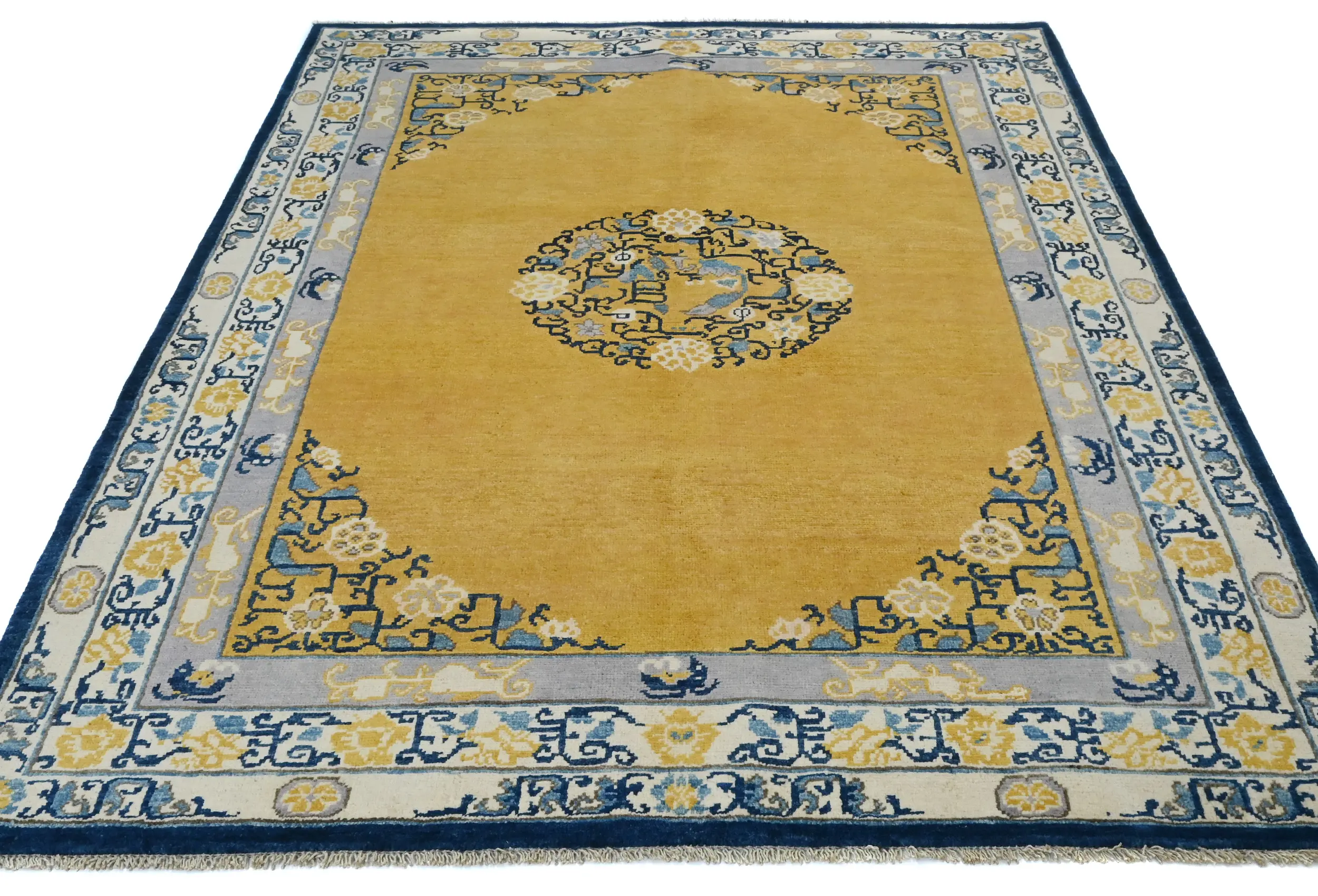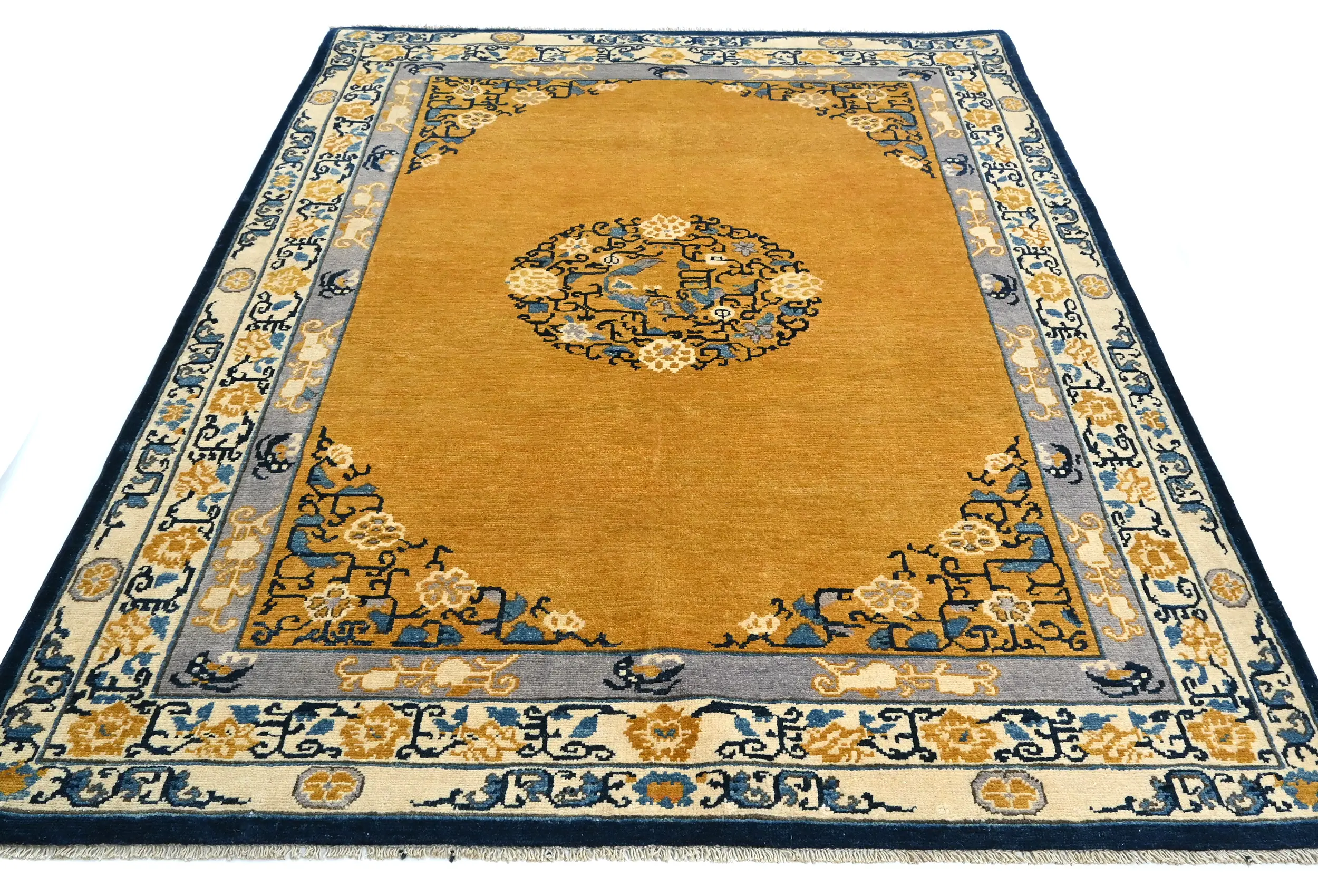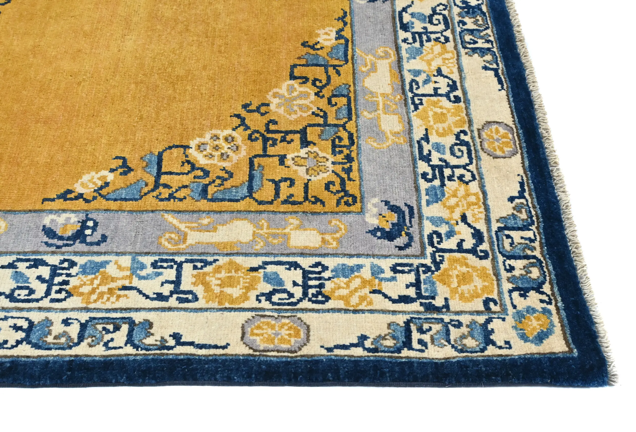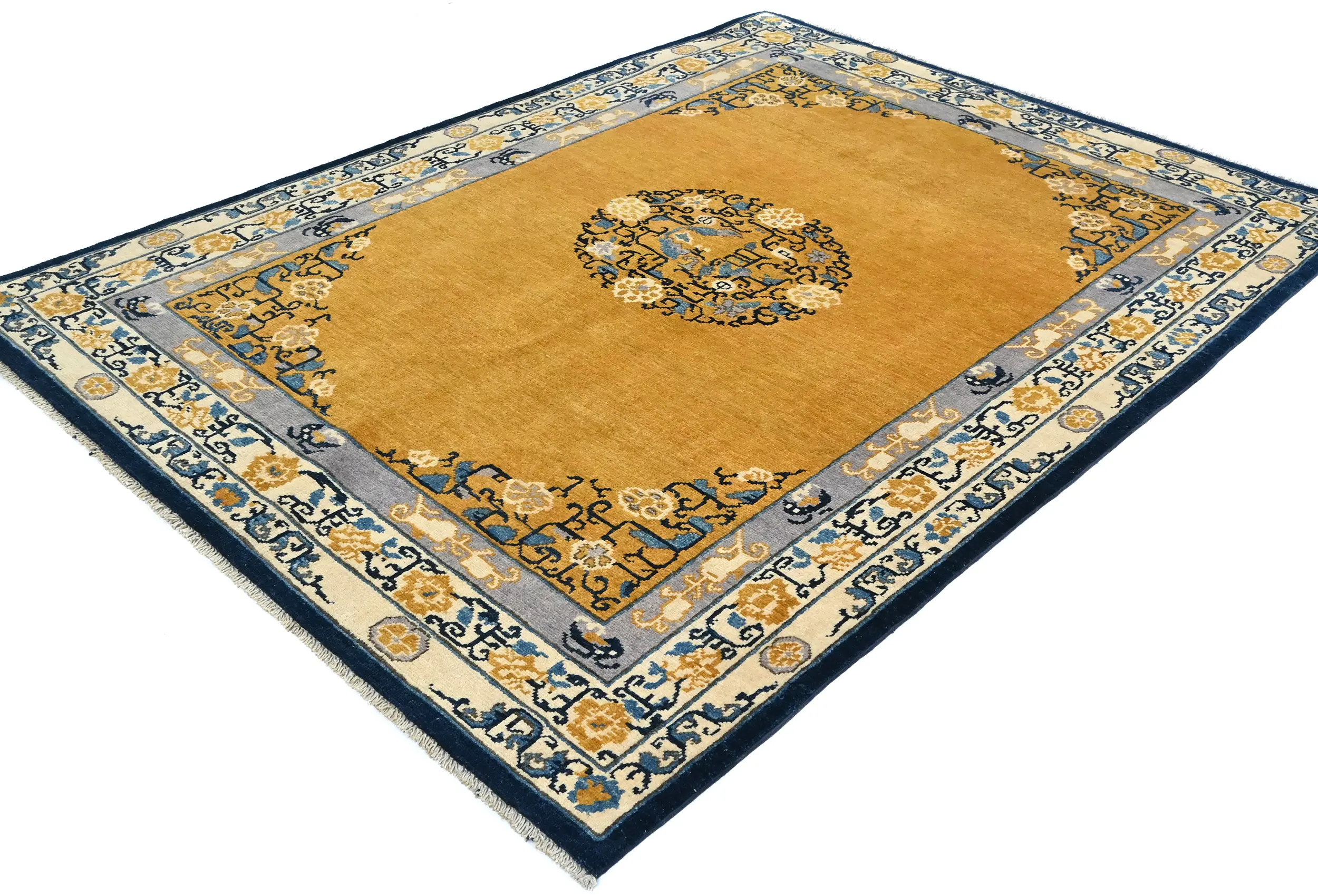 Hand Knotted 5X7 gold Oriental rug made with vegetable dyes (fine wool pile and cotton foundation), exceptional knot count, and appealing ancient designs. This Oriental rug never will go out of style and would be among your most valuable treasures.