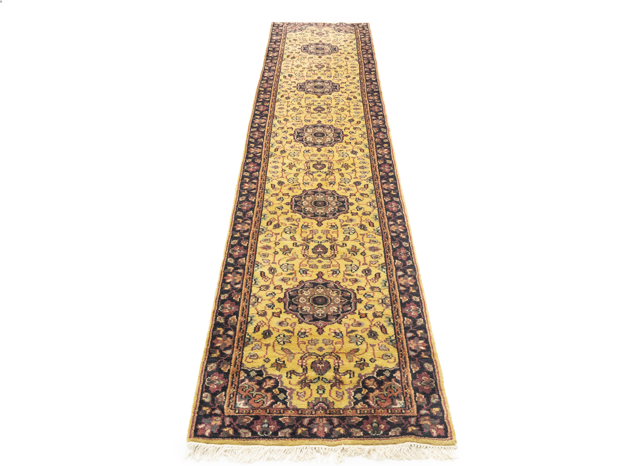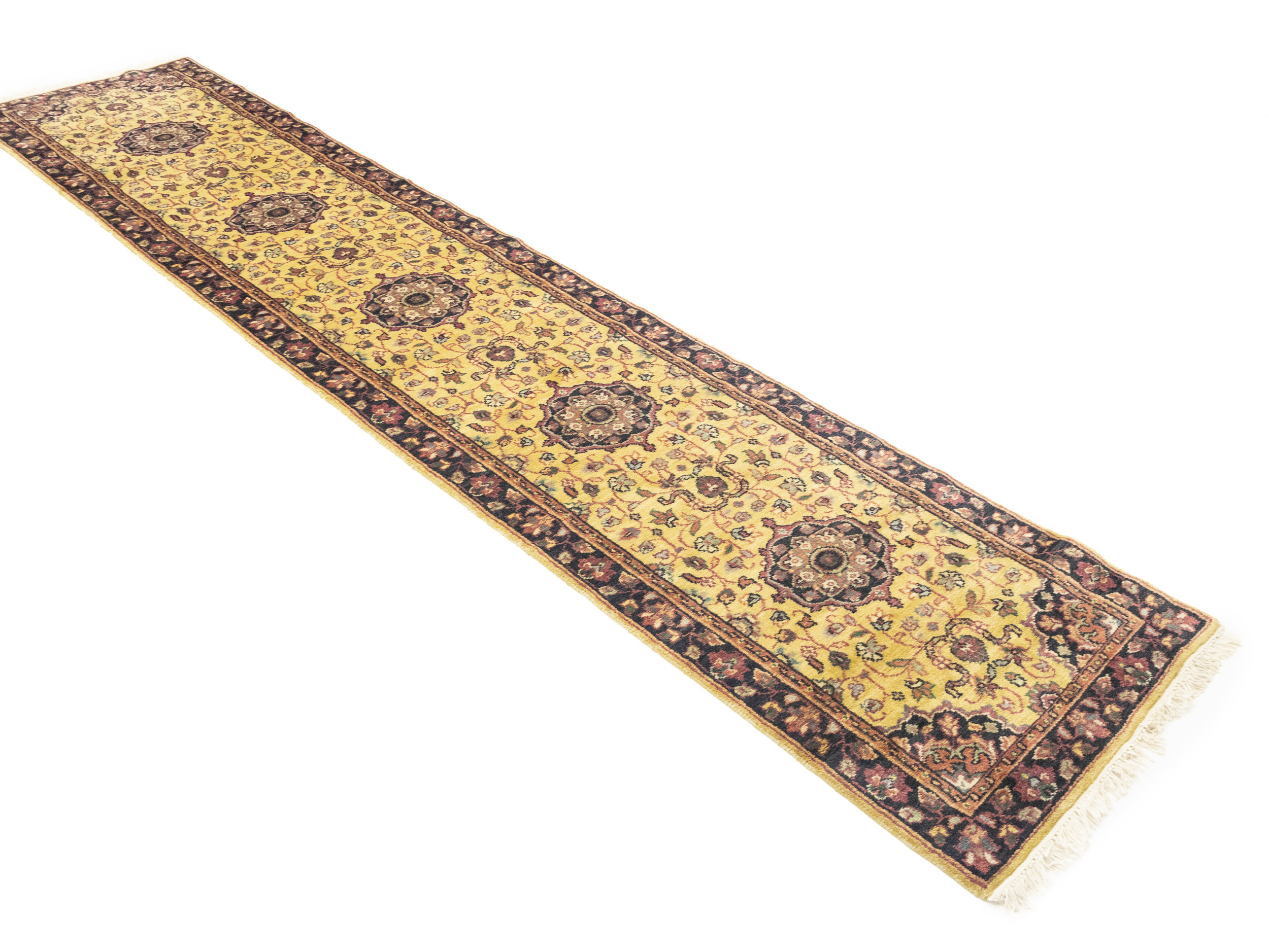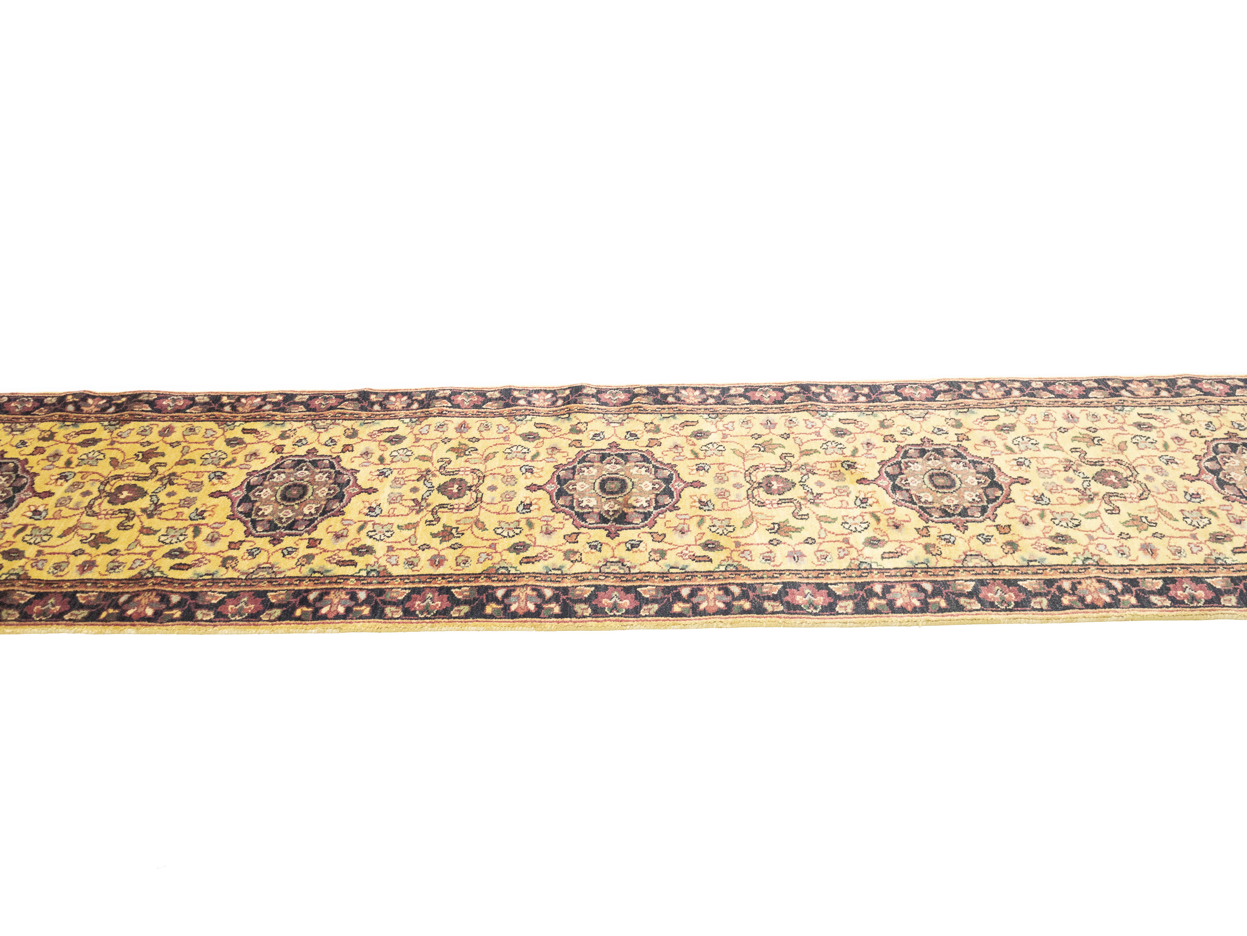 Handmade 2'6X12 Golden Beige oriental runner made with natural dyes (fine wool pile and cotton foundation), superior knot count, and appealing ancient designs. This Oriental runner never will go out of style and would be among your most valuable treasures.
