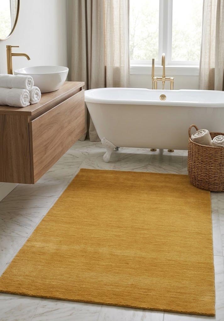 This hand-loomed 4X6 Golden Peach Oriental rug from India features a modern, Solid design that seamlessly integrates traditional craftsmanship with contemporary style, showcasing a striking Golden Peach primary color. It provides a luxuriant softness and durability underfoot, as it is constructed from premium wool with a cotton foundation. The rug is optimized for high-traffic areas due to its medium pile height and knot density of 100 knots per square inch, which ensures durability and comfort. This rug, which is in exceptional condition and was recently manufactured, is an ideal complement to any contemporary setting, providing both versatility and timeless elegance.