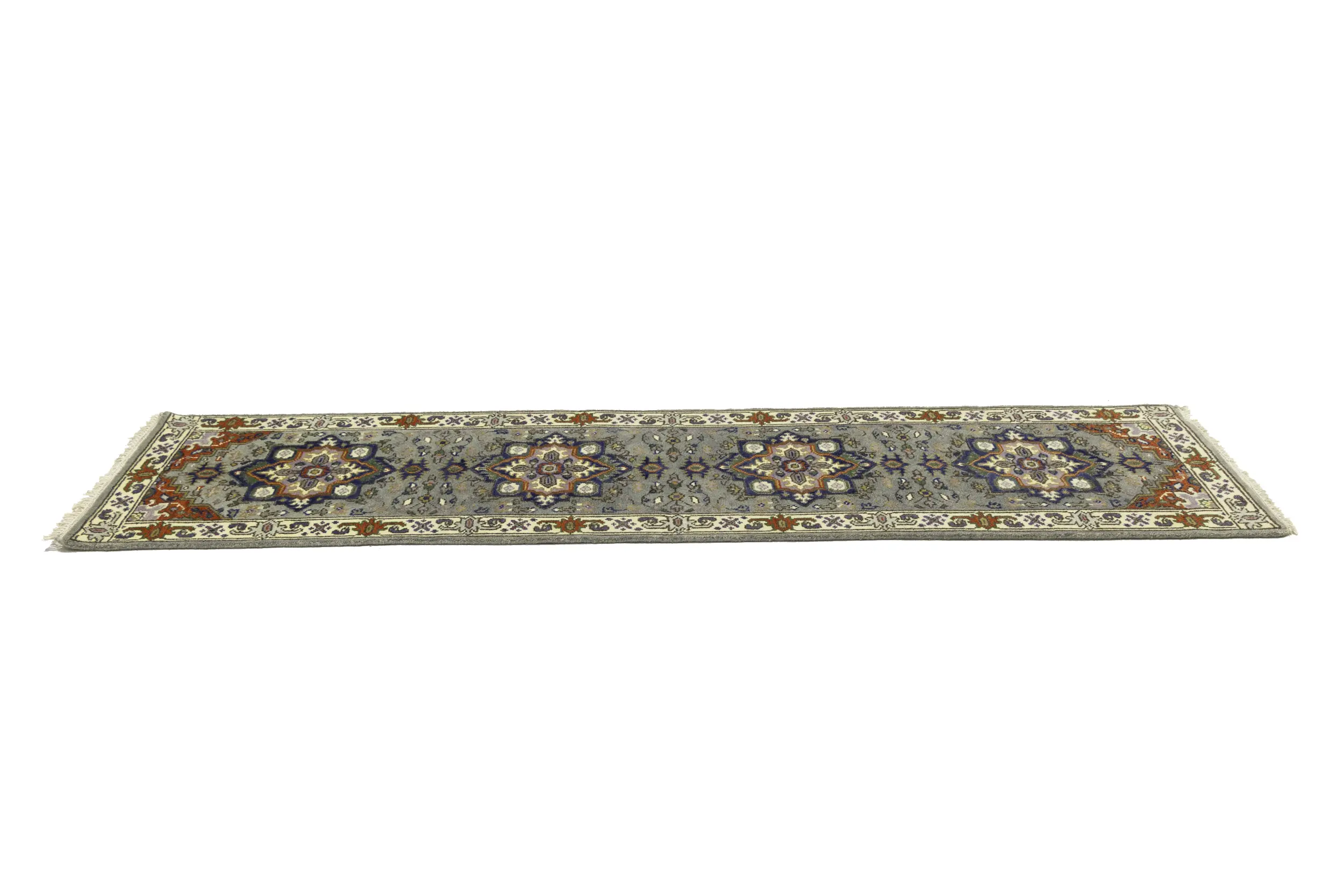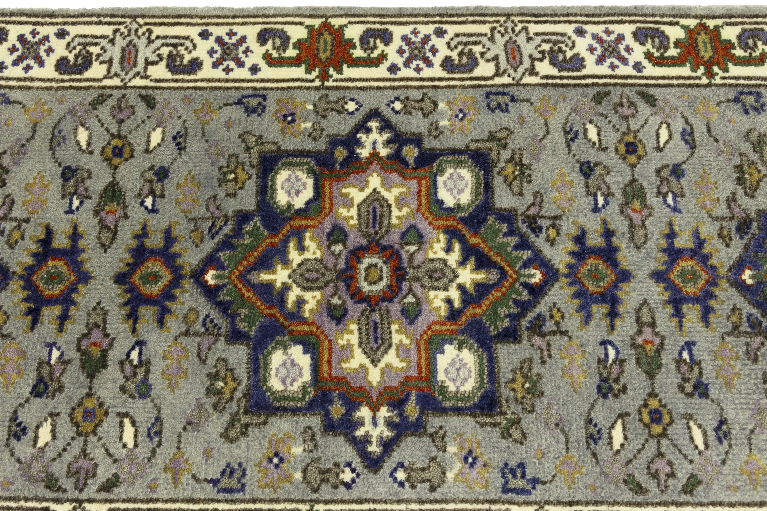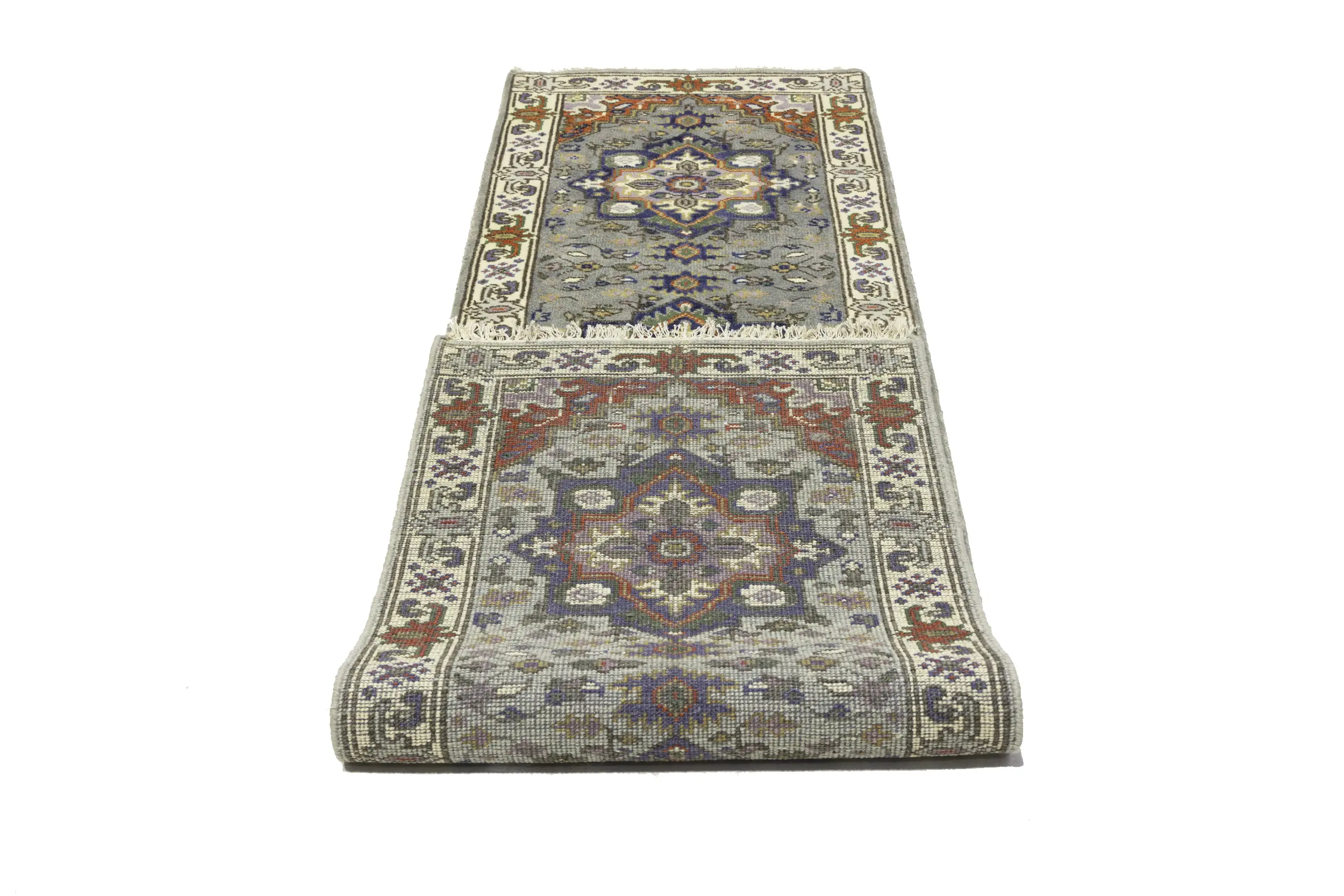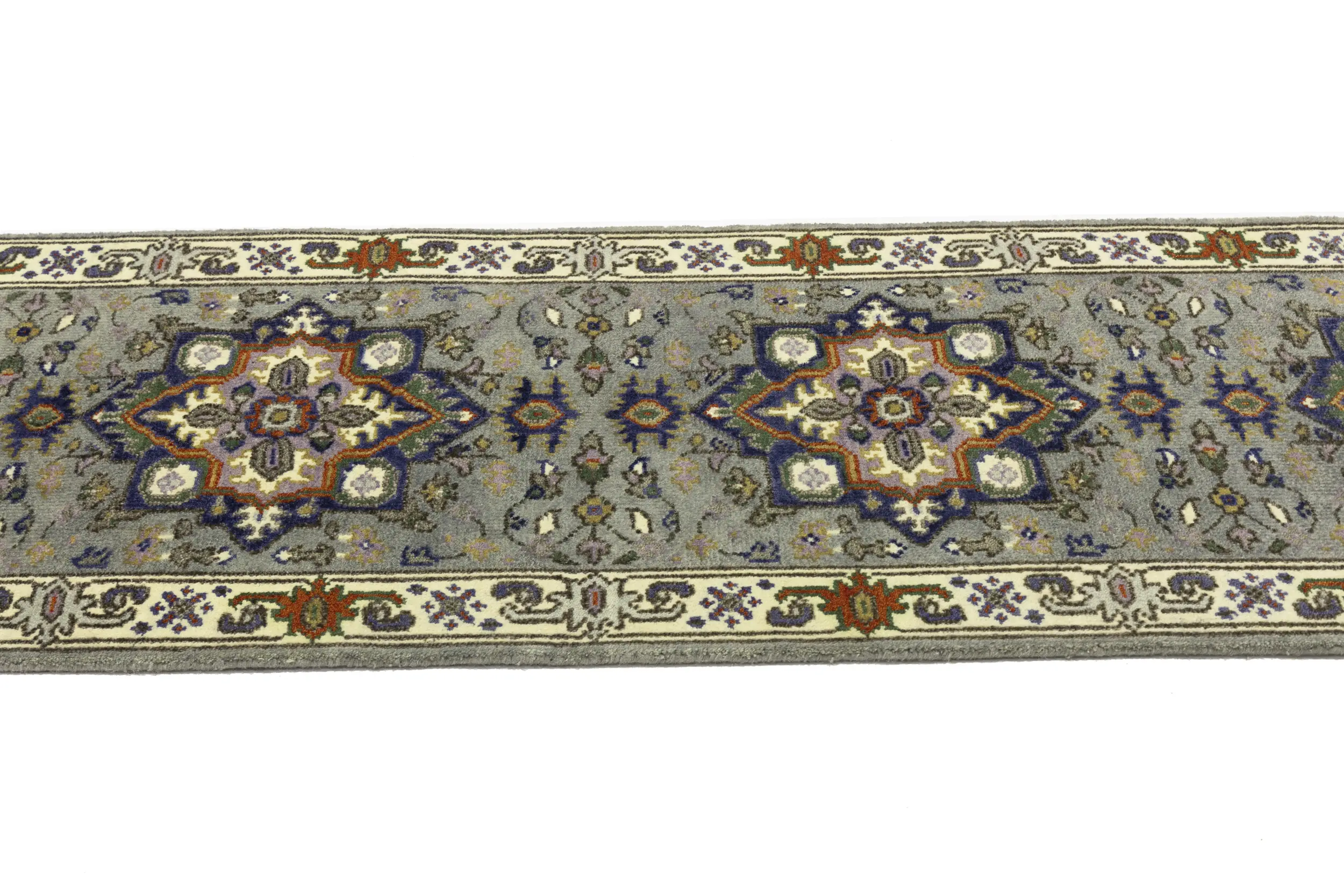 This original 2'7X10'2 gray new Oriental runner was finely knotted by the hands of weavers influenced by a variety of amazing artistic designs, to recreate the aged look of the exceptional piece with a richness of color and embellished background field. What set this vintage style Oriental area runner from the others are the material and dye used (wool pile and cotton foundation), knot count, antique designs, fantastic grades, and its regional historical connection: it has deep roots, from the story of the people who produced it to the meaning of the symbols and colors displayed across its canvas that have been praised for centuries. This Indian home décor carpet will be completely cozy and inviting that never will go out of style!