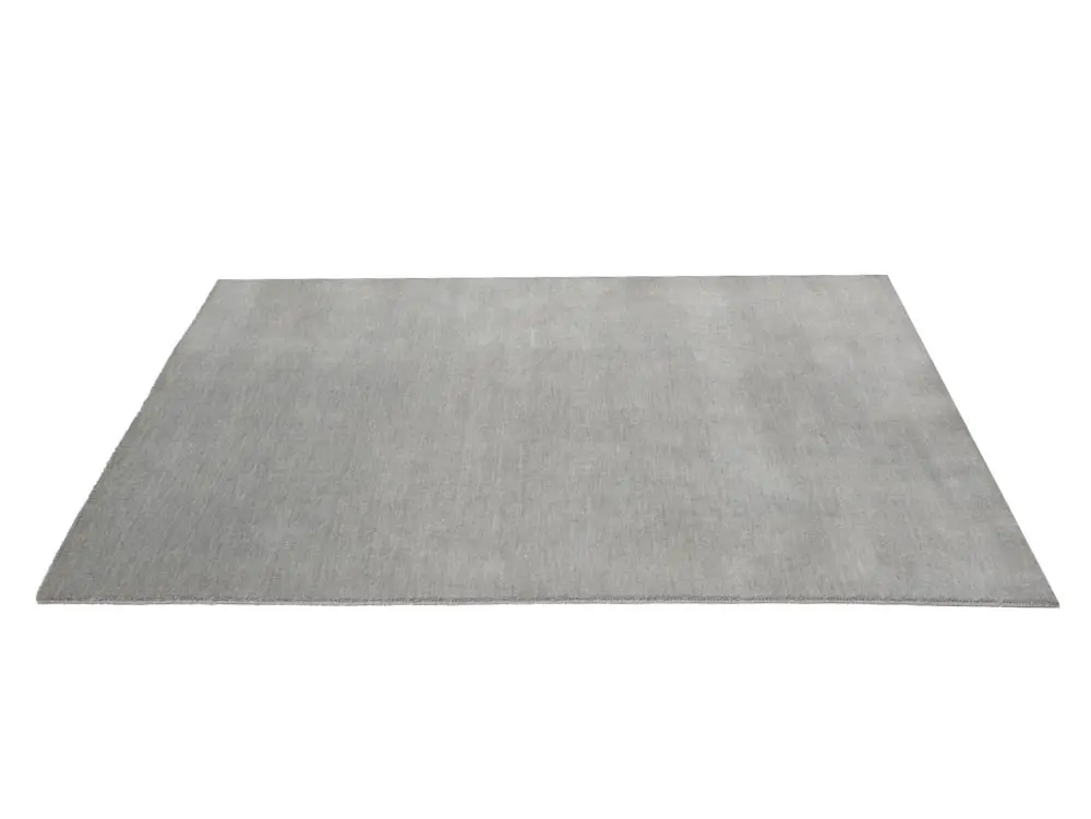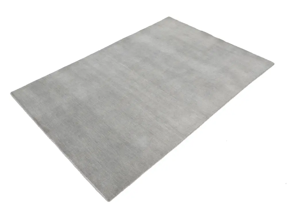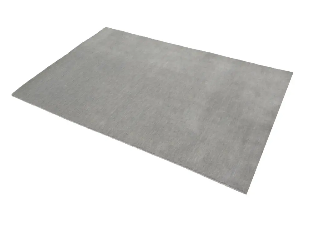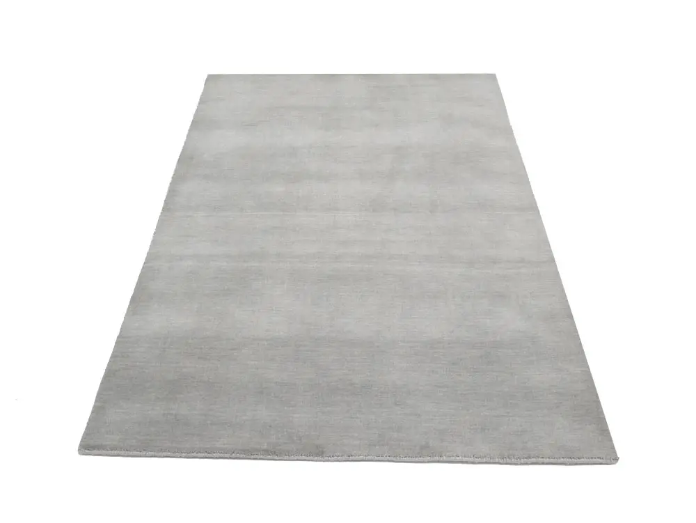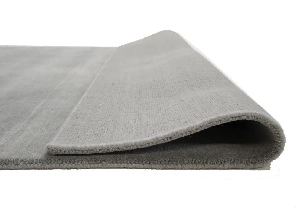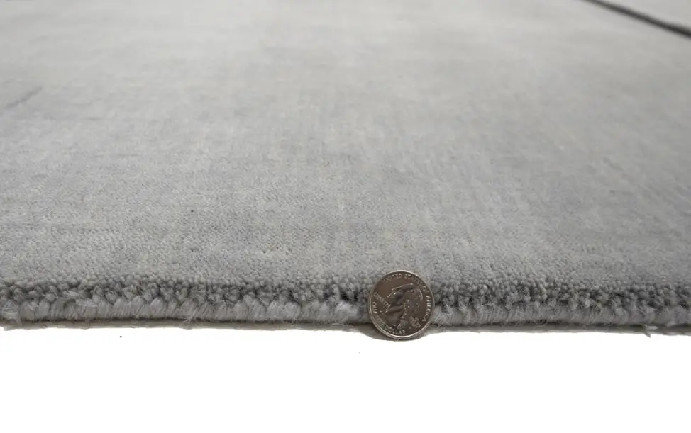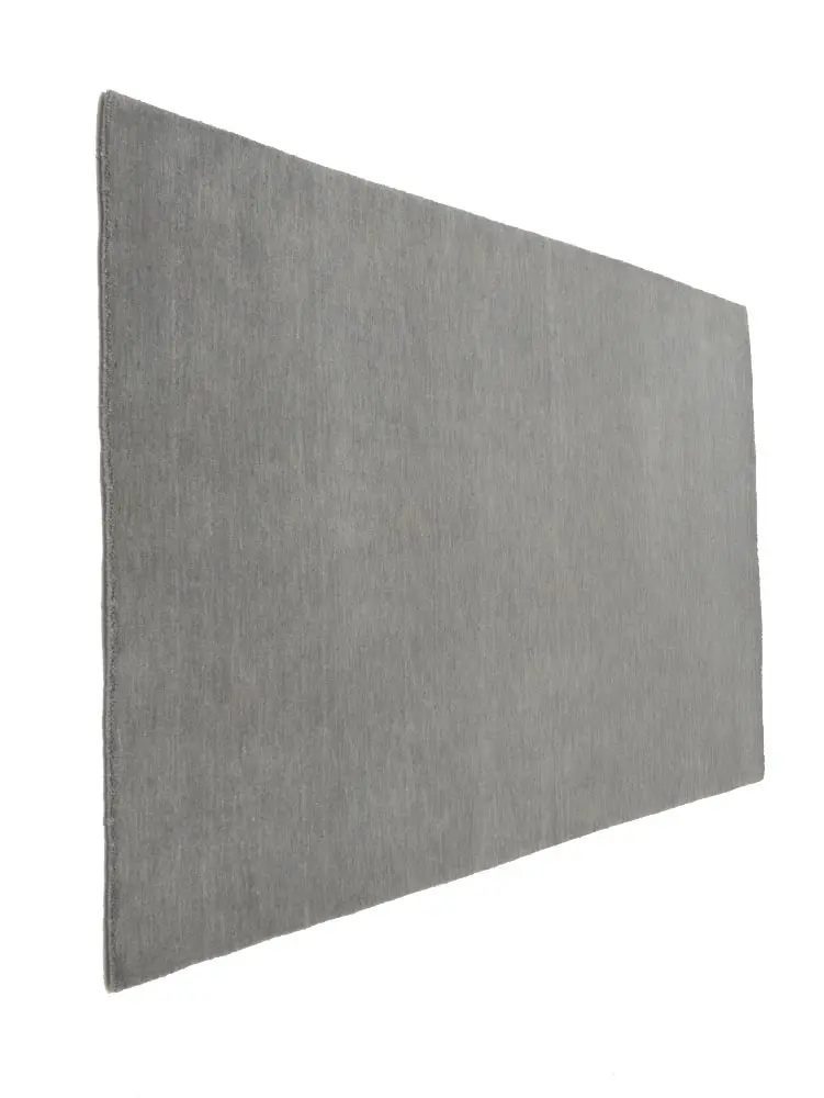 This hand-loomed 4X6 Gray Oriental rug from India features a modern, Solid design that seamlessly integrates traditional craftsmanship with contemporary style, showcasing a striking Gray primary color. It provides a luxuriant softness and durability underfoot, as it is constructed from premium wool with a cotton foundation. The rug is optimized for high-traffic areas due to its medium pile height and knot density of 100 knots per square inch, which ensures durability and comfort. This rug, which is in exceptional condition and was recently manufactured, is an ideal complement to any contemporary setting, providing both versatility and timeless elegance.
