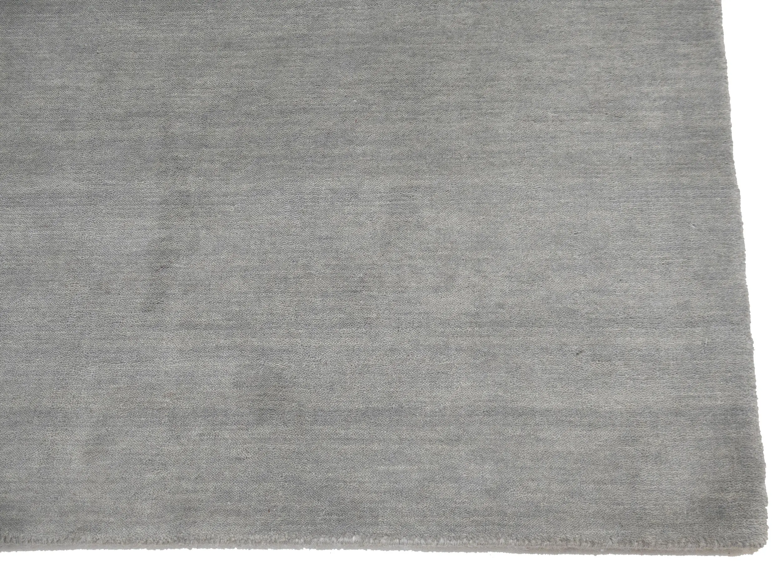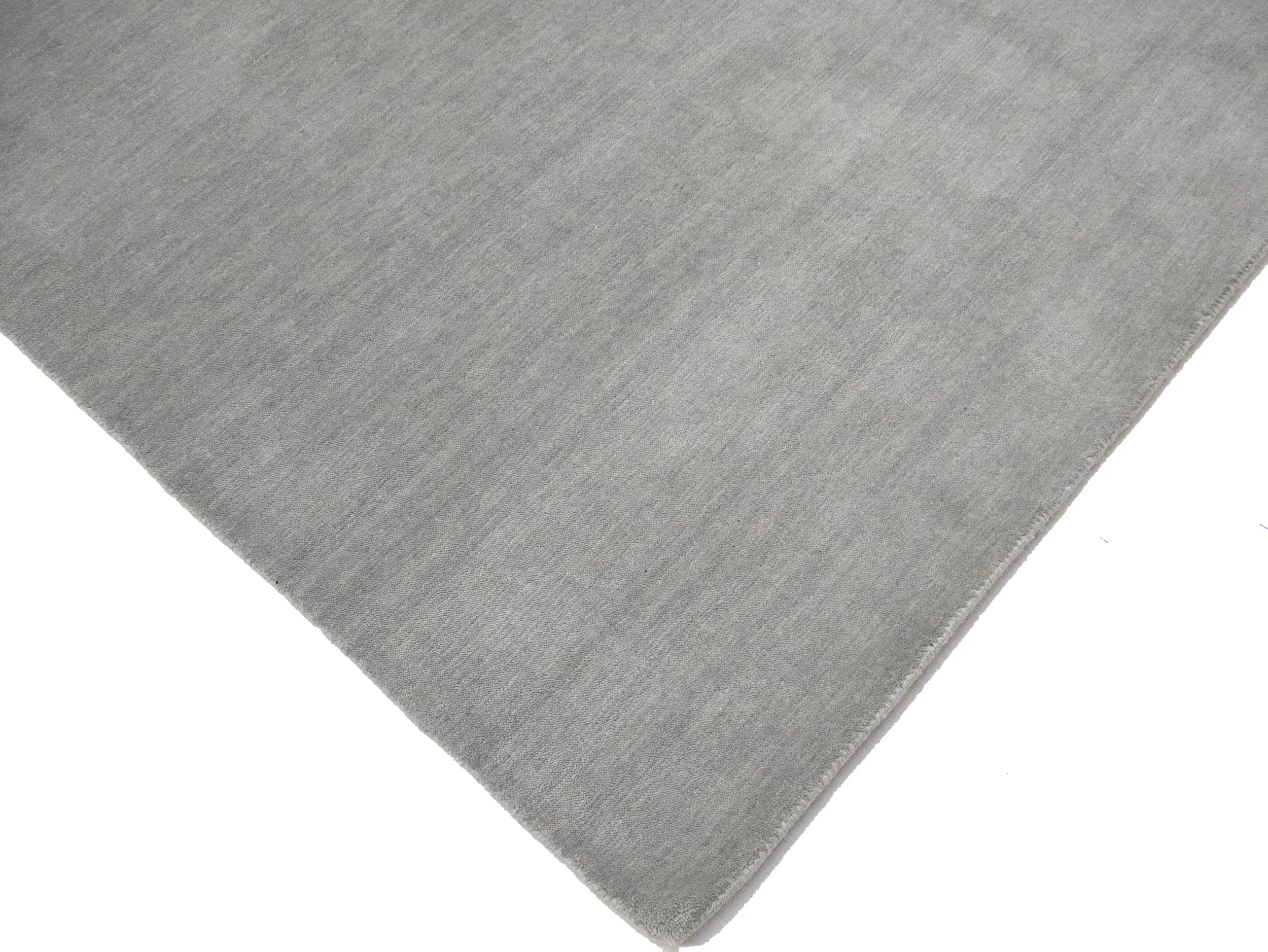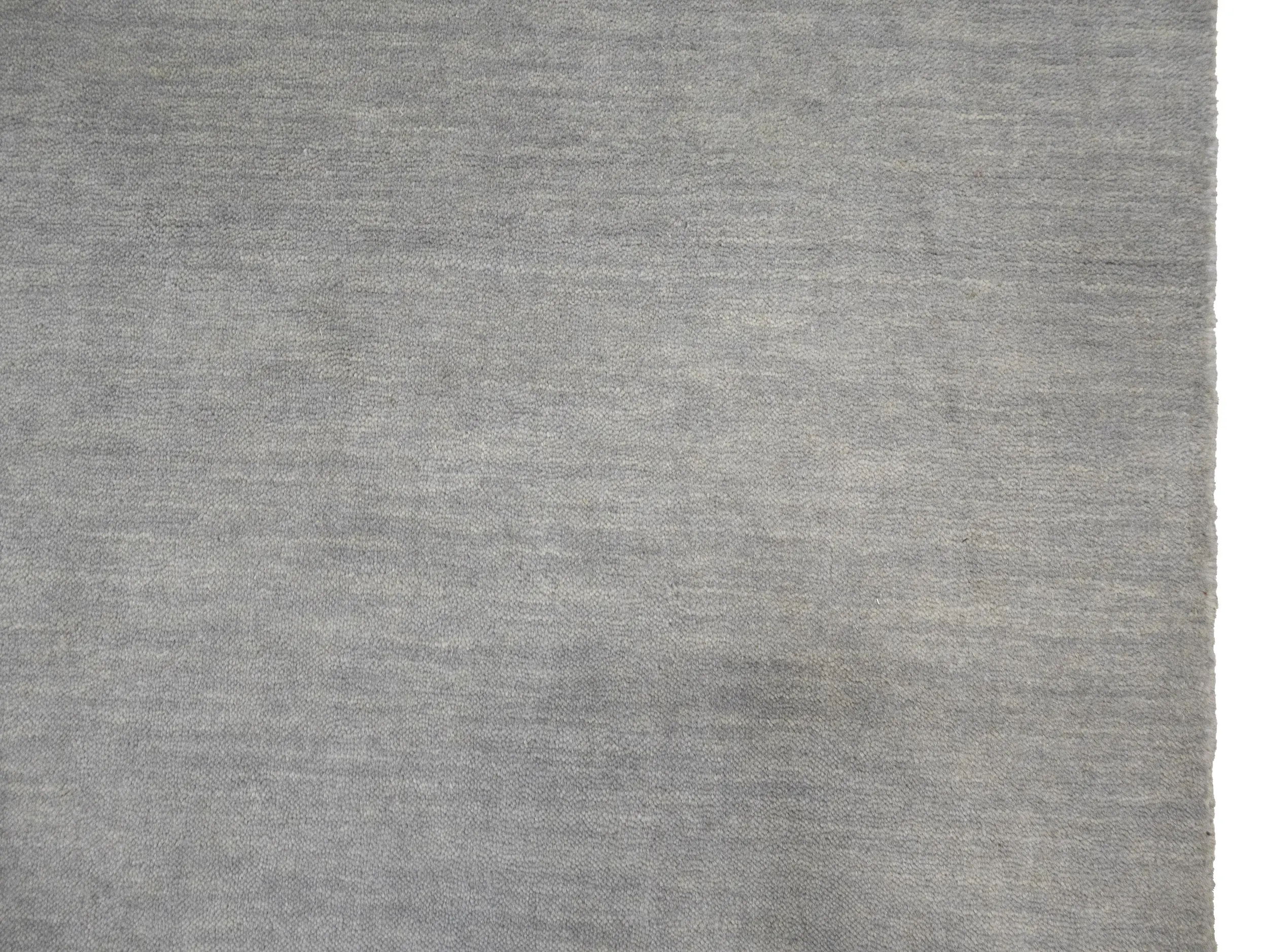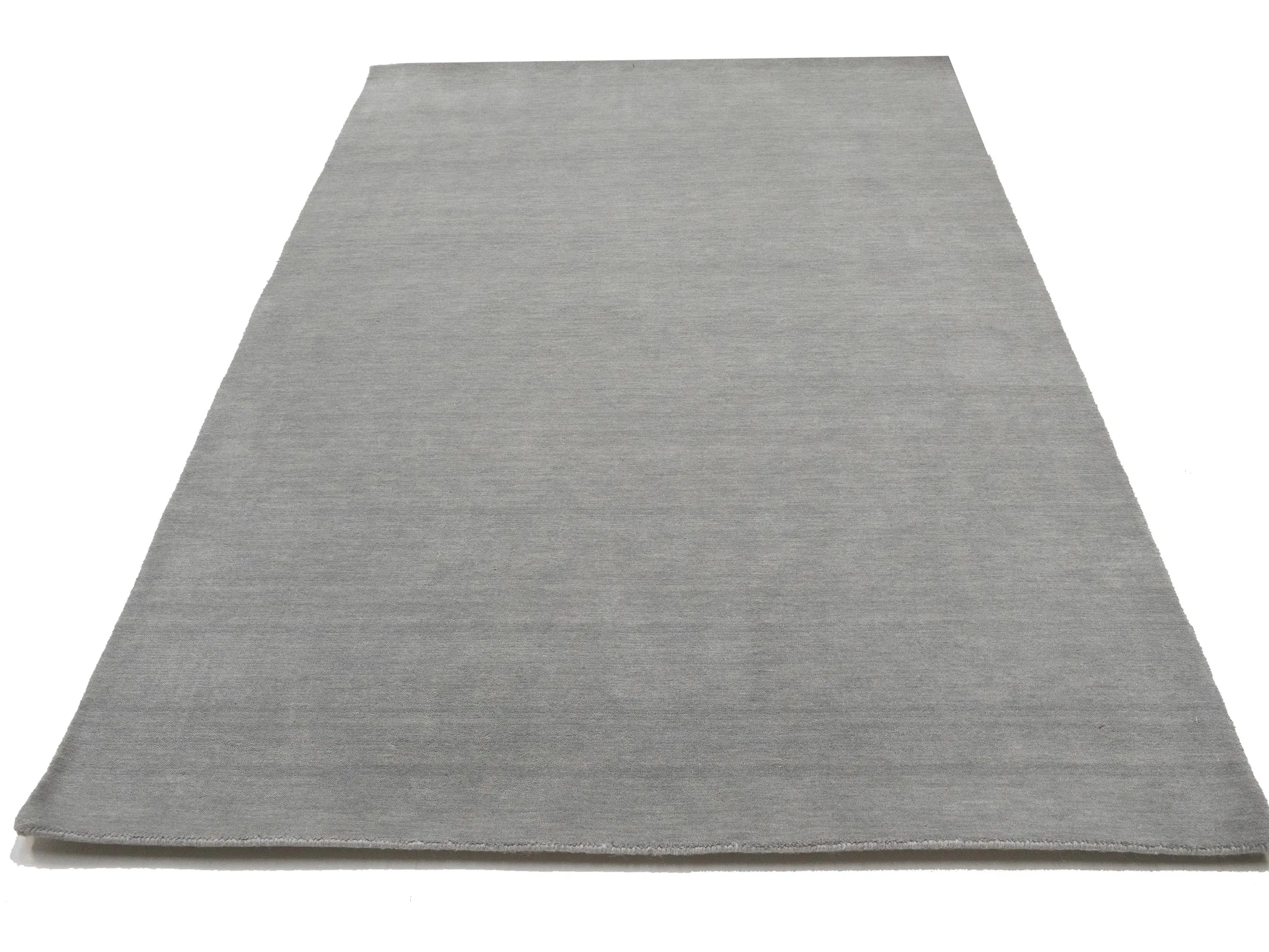 This hand-loomed 5X8 Gray Oriental rug from India features a modern, Solid design that seamlessly integrates traditional craftsmanship with contemporary style, showcasing a striking Gray primary color. It provides a luxuriant softness and durability underfoot, as it is constructed from premium wool with a cotton foundation. The rug is optimized for high-traffic areas due to its medium pile height and knot density of 100 knots per square inch, which ensures durability and comfort. This rug, which is in exceptional condition and was recently manufactured, is an ideal complement to any contemporary setting, providing both versatility and timeless elegance.