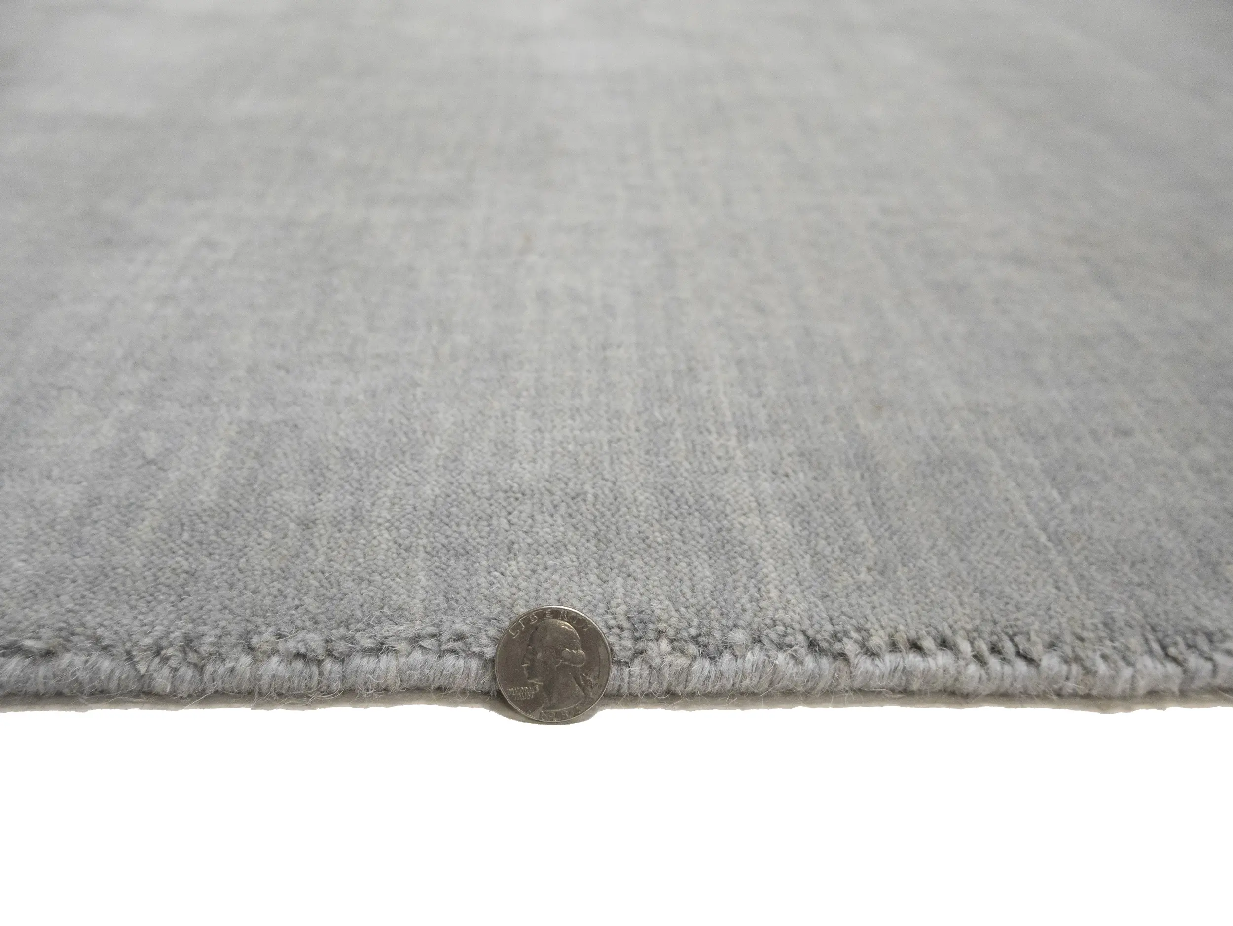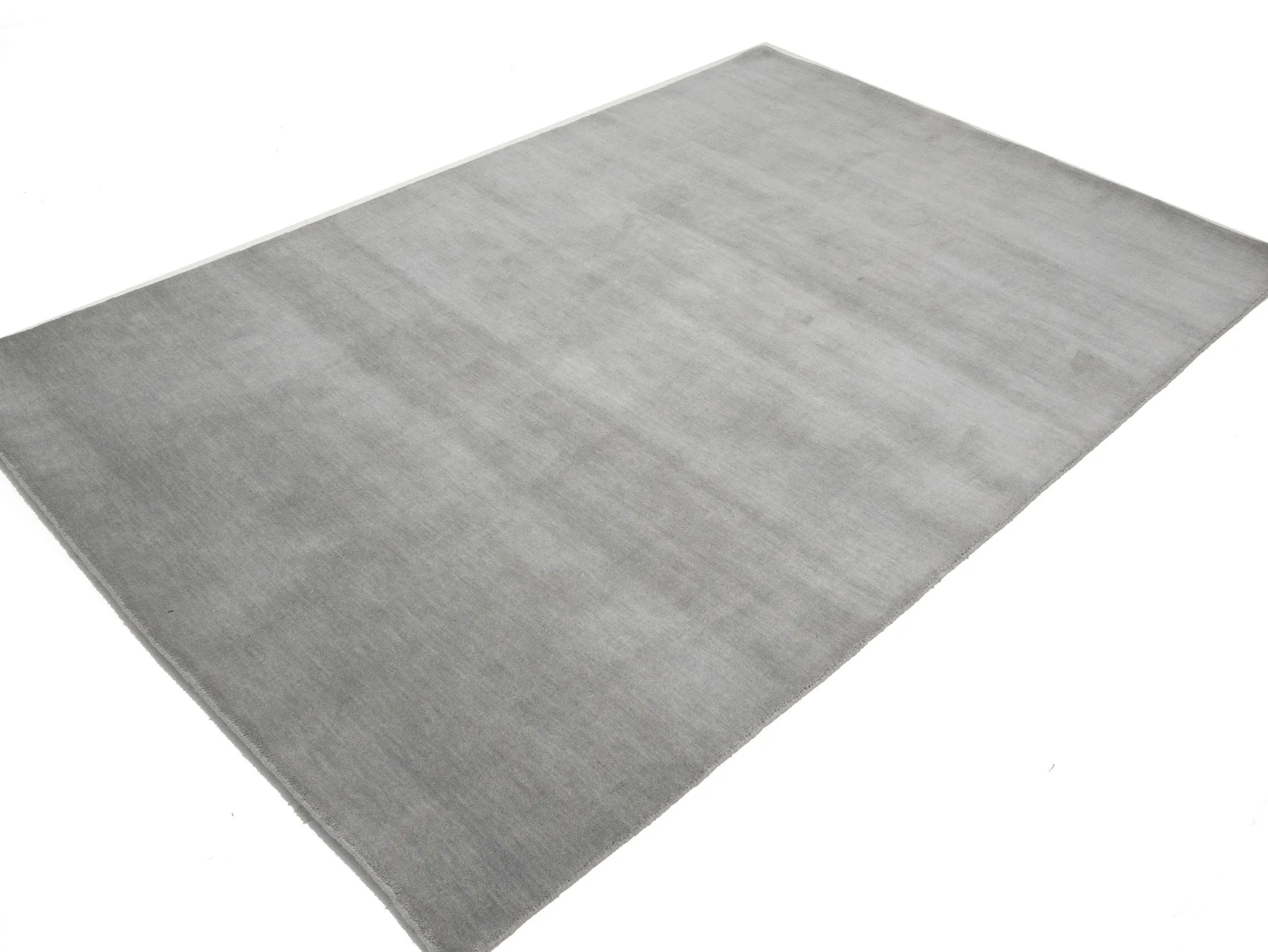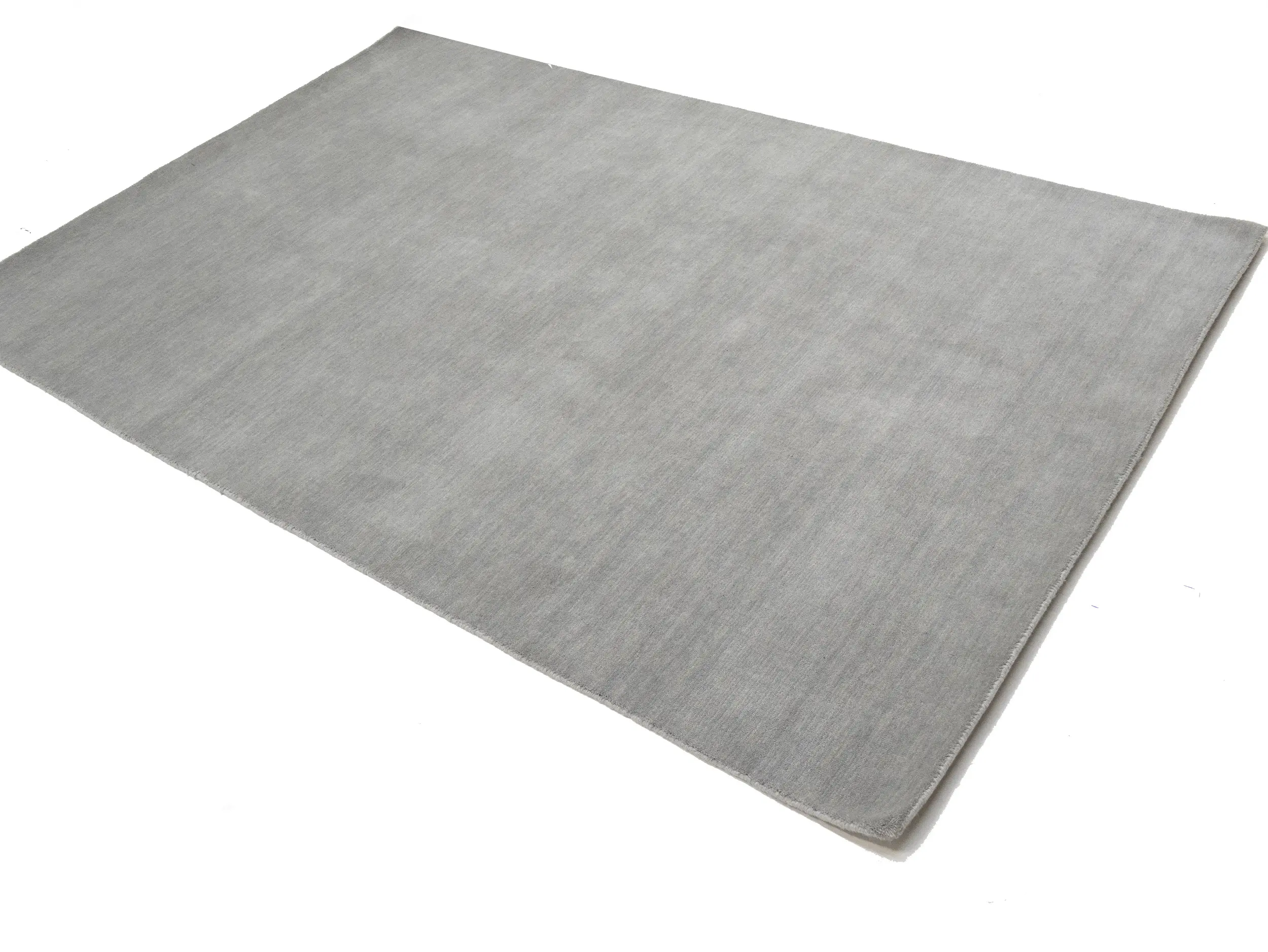 This hand-loomed 5X8 Gray Oriental rug from India features a modern, Solid design that seamlessly integrates traditional craftsmanship with contemporary style, showcasing a striking Gray primary color. It provides a luxuriant softness and durability underfoot, as it is constructed from premium wool with a cotton foundation. The rug is optimized for high-traffic areas due to its medium pile height and knot density of 100 knots per square inch, which ensures durability and comfort. This rug, which is in exceptional condition and was recently manufactured, is an ideal complement to any contemporary setting, providing both versatility and timeless elegance.