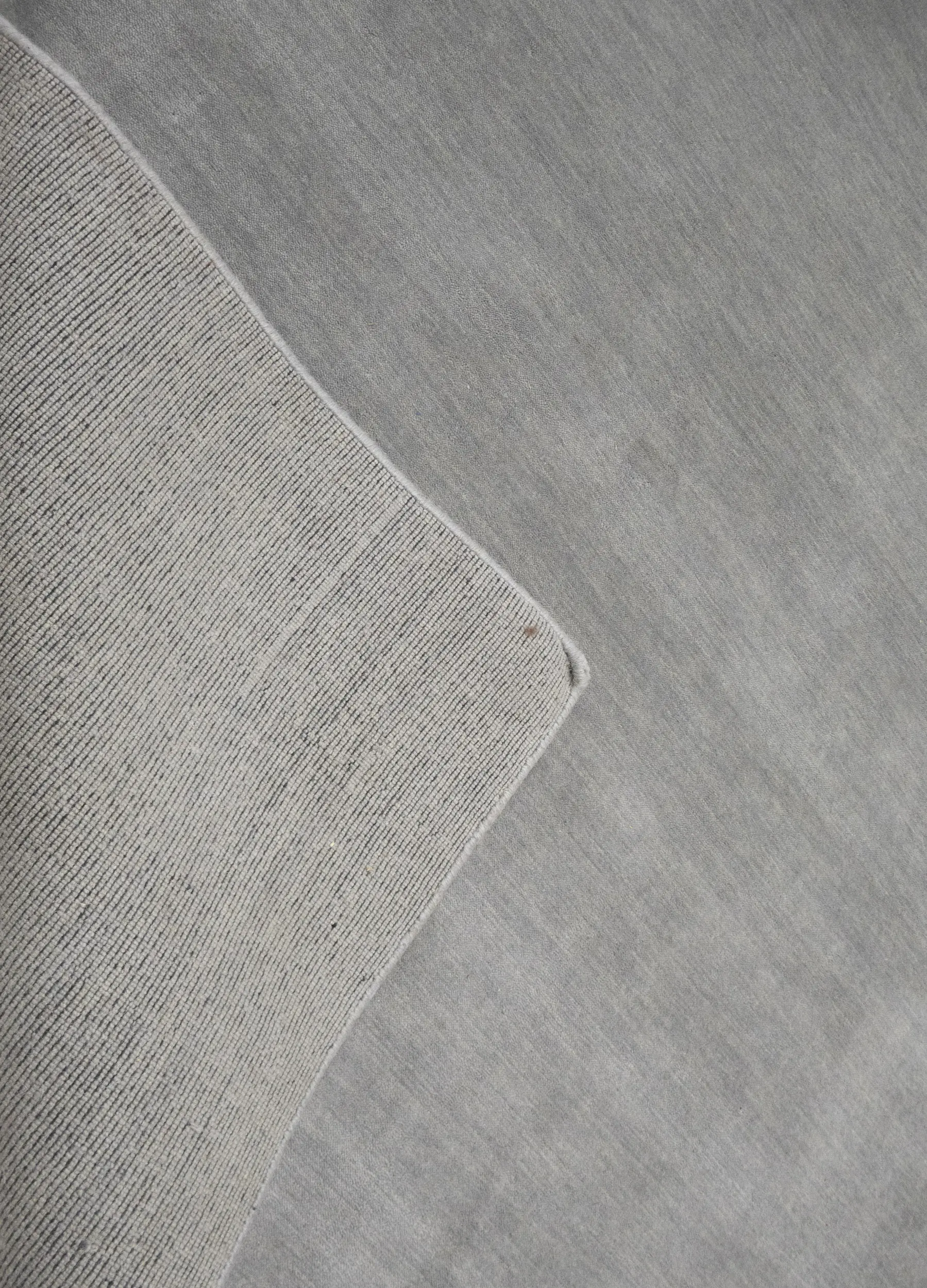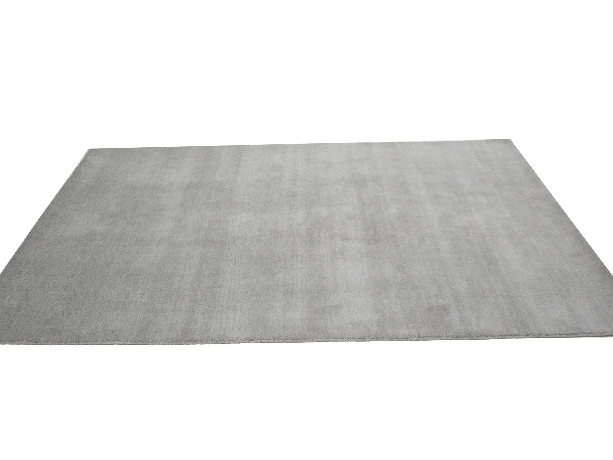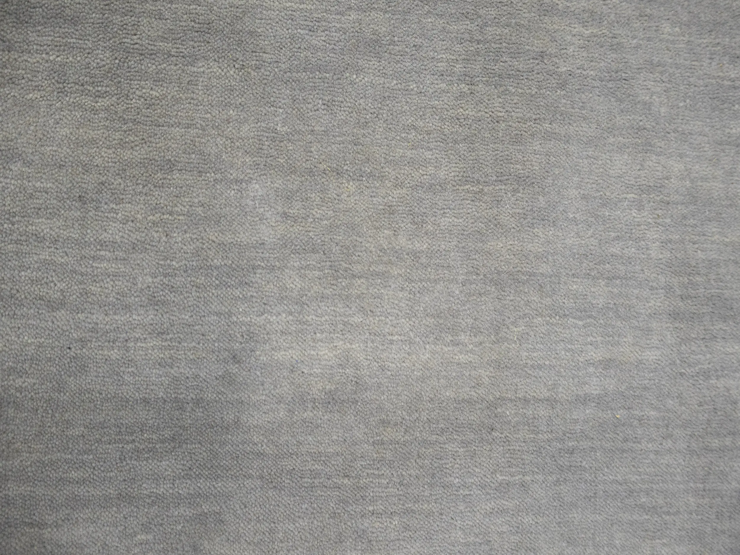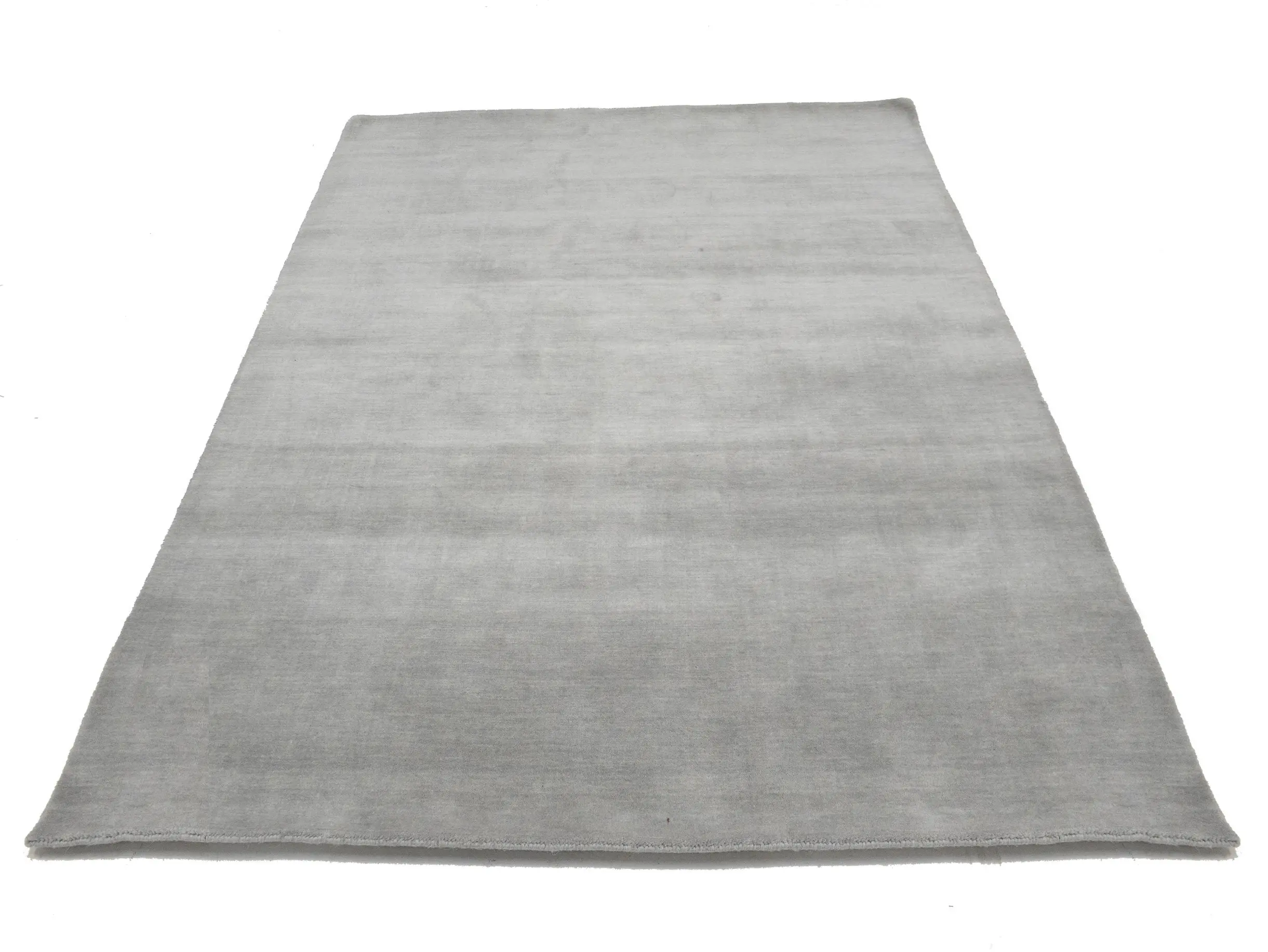 This hand-loomed 5X8 Gray Oriental rug from India features a modern, Solid design that seamlessly integrates traditional craftsmanship with contemporary style, showcasing a striking Gray primary color. It provides a luxuriant softness and durability underfoot, as it is constructed from premium wool with a cotton foundation. The rug is optimized for high-traffic areas due to its medium pile height and knot density of 100 knots per square inch, which ensures durability and comfort. This rug, which is in exceptional condition and was recently manufactured, is an ideal complement to any contemporary setting, providing both versatility and timeless elegance.