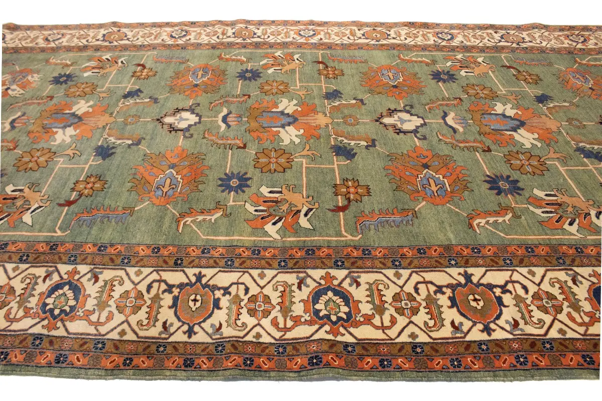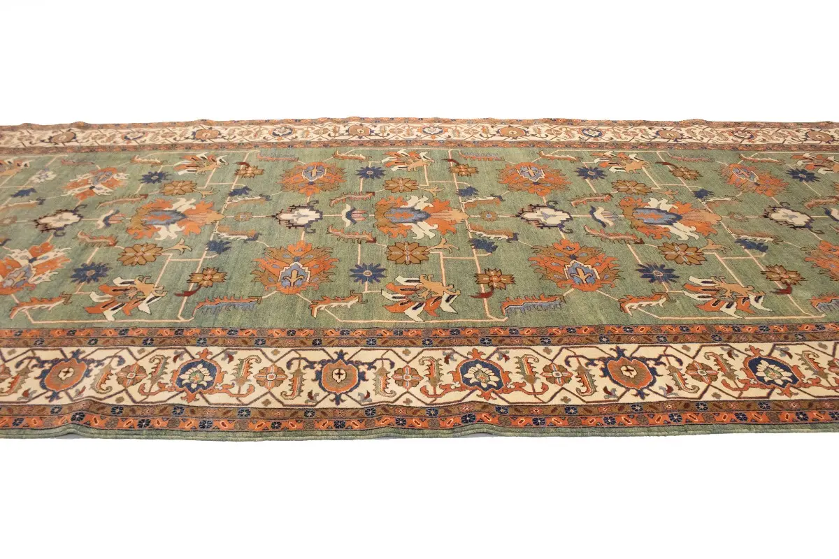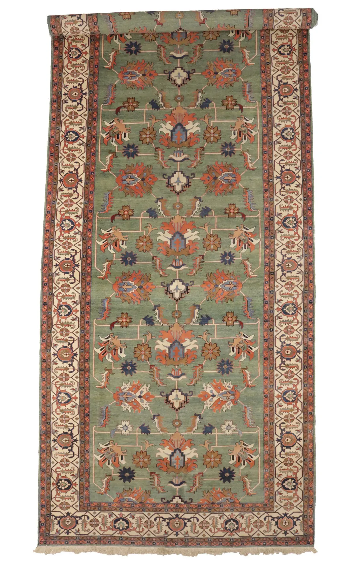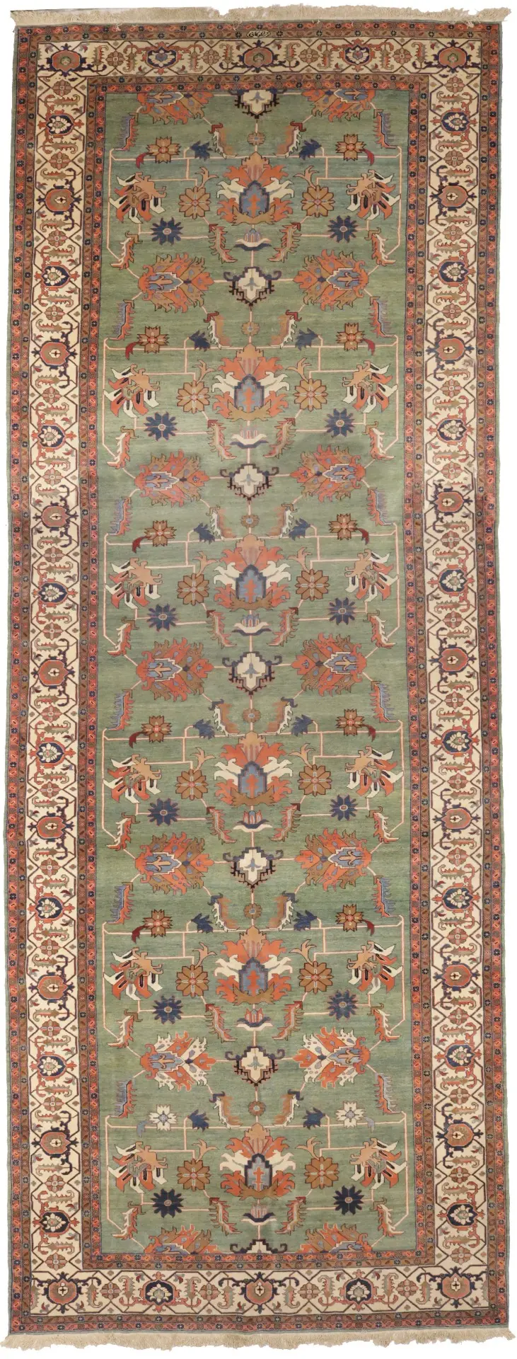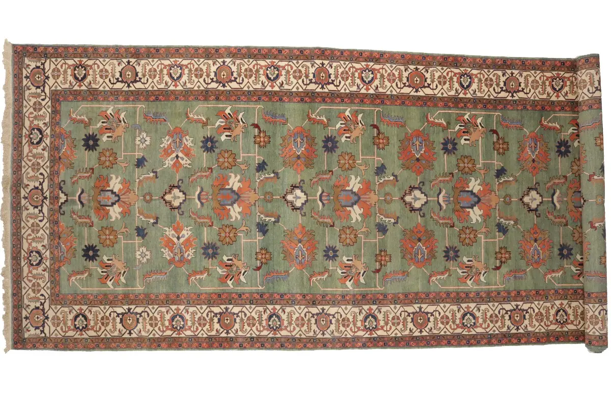 Hand Knotted 10X27 green Persian rug made with natural dyes (fine wool pile and cotton foundation), superior knot count, and appealing ancient designs. This Oriental rug never will go out of style and would be among your most valuable treasures.