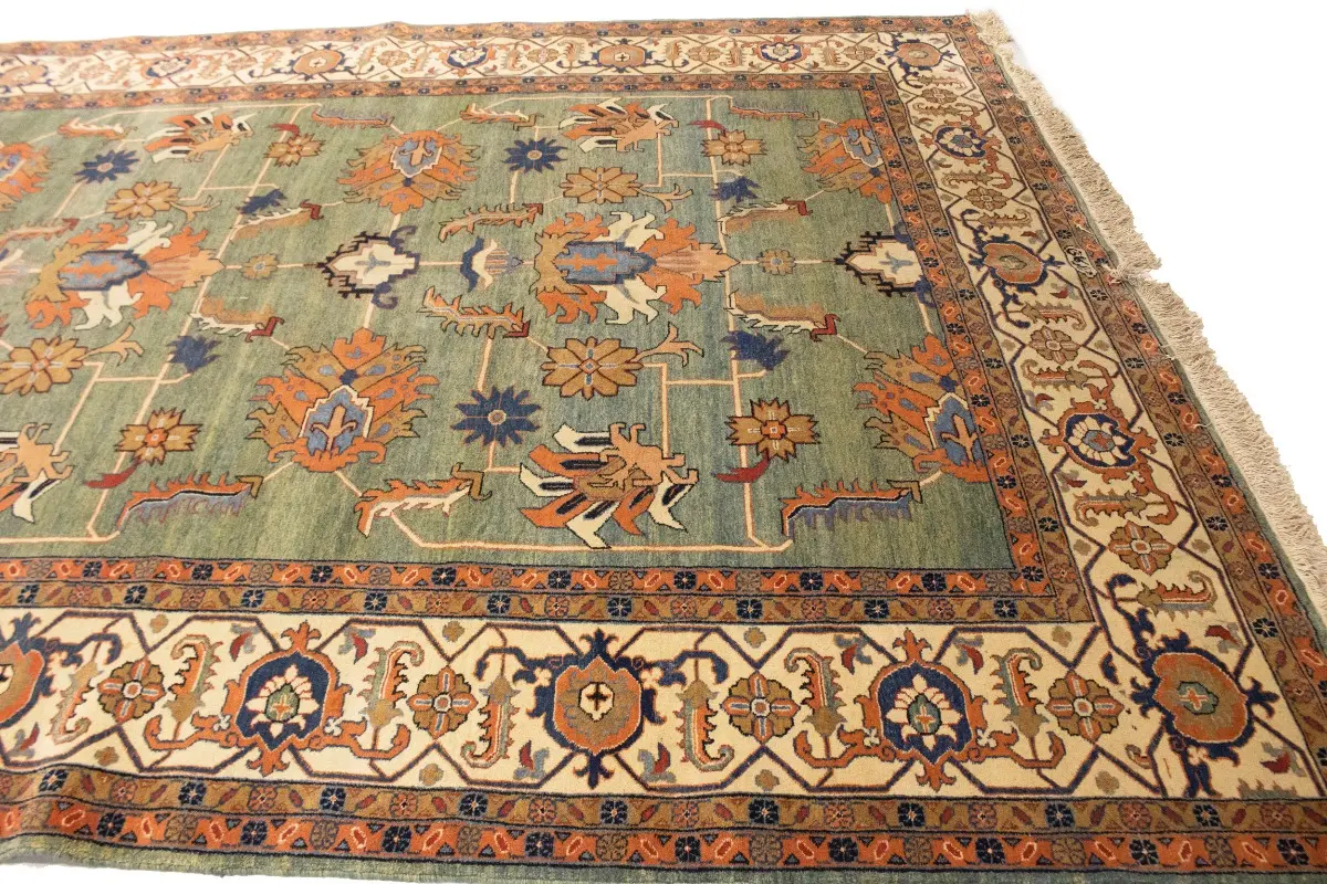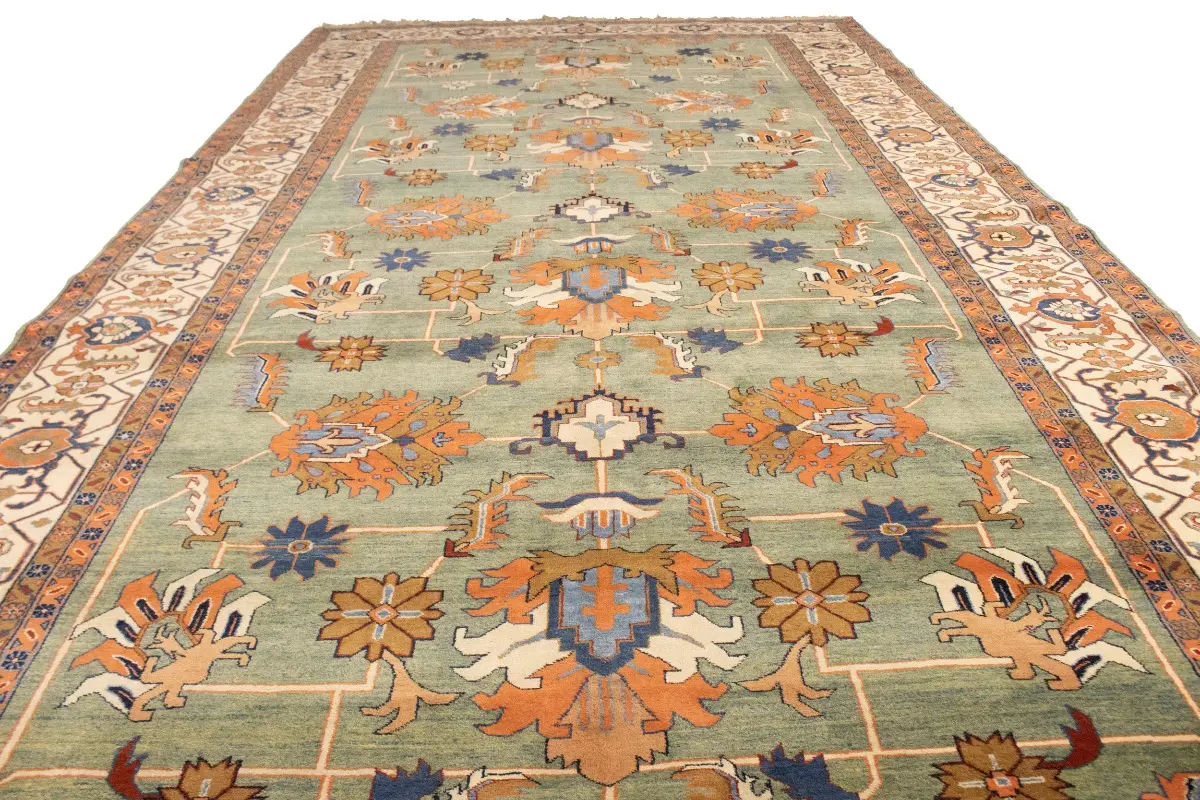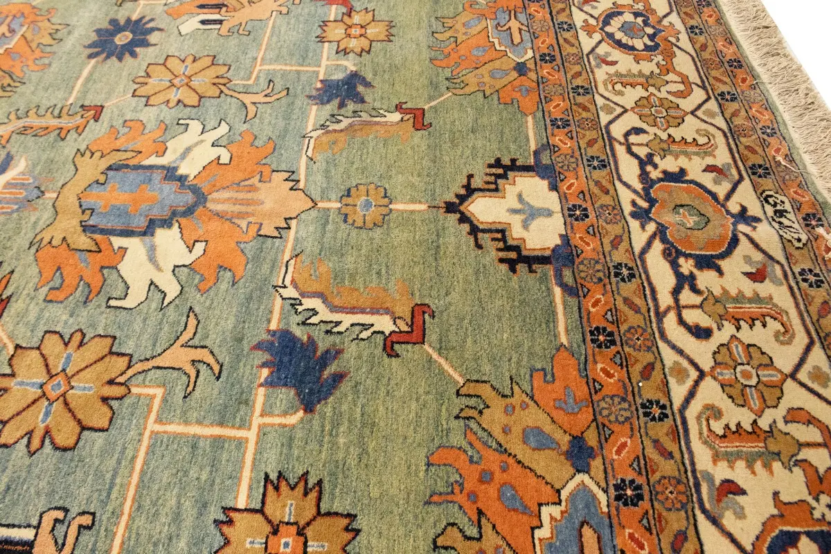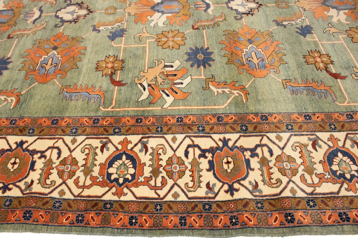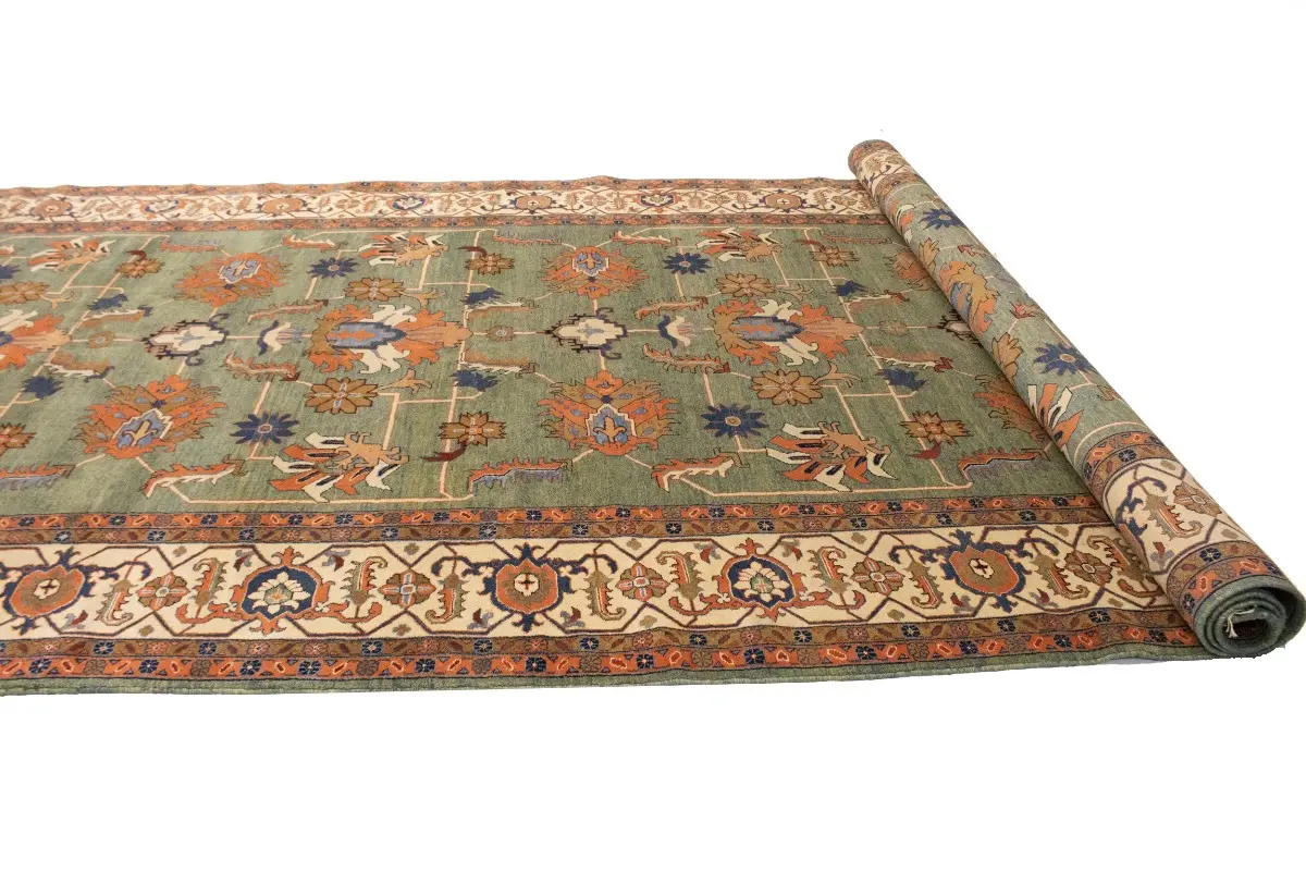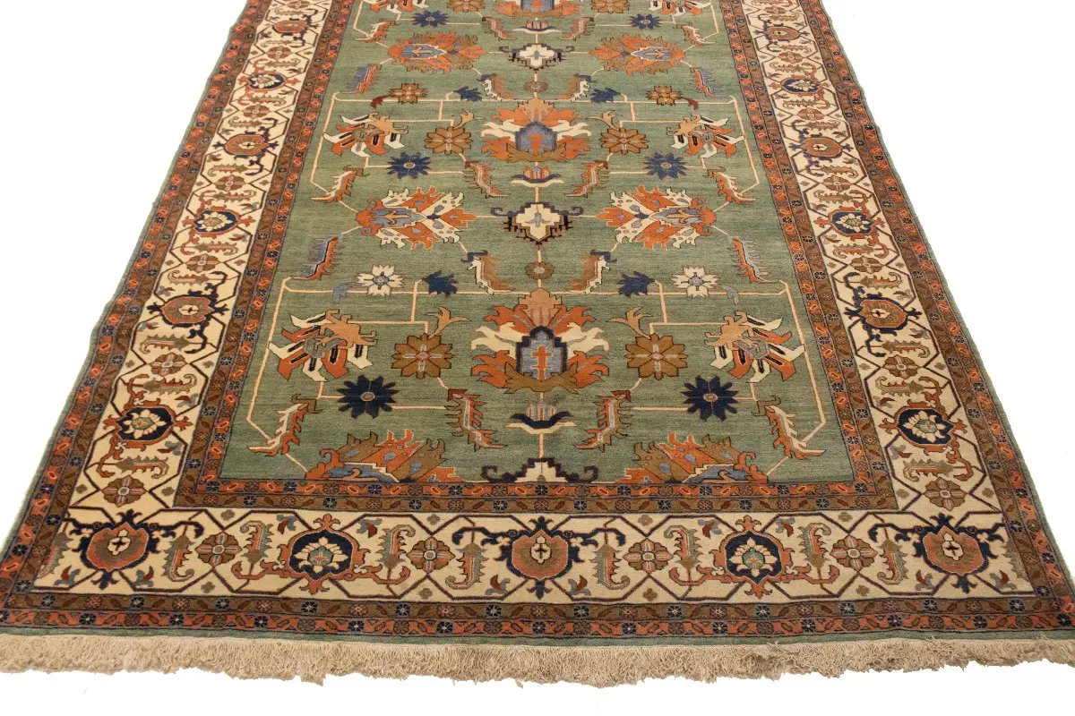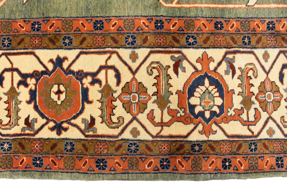 Hand Knotted 10X27 green Persian rug made with natural dyes (fine wool pile and cotton foundation), superior knot count, and appealing ancient designs. This Oriental rug never will go out of style and would be among your most valuable treasures.
