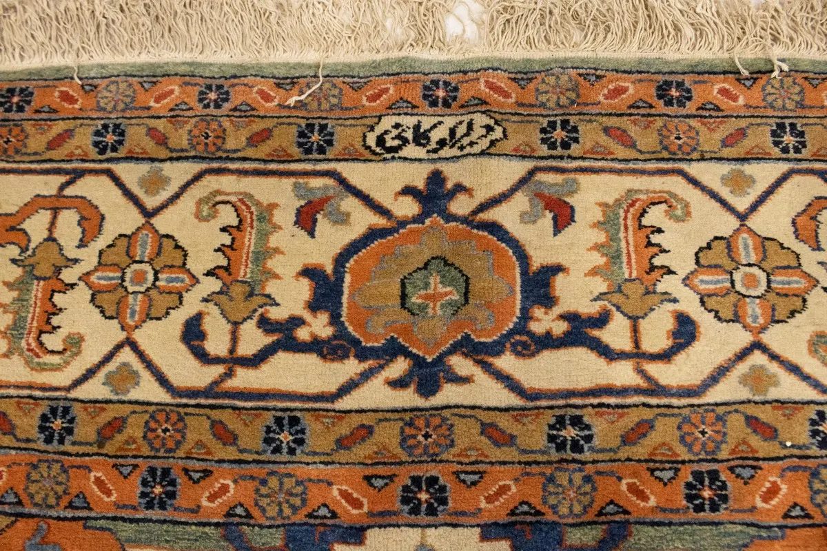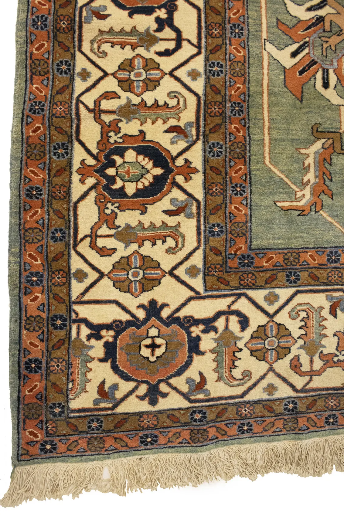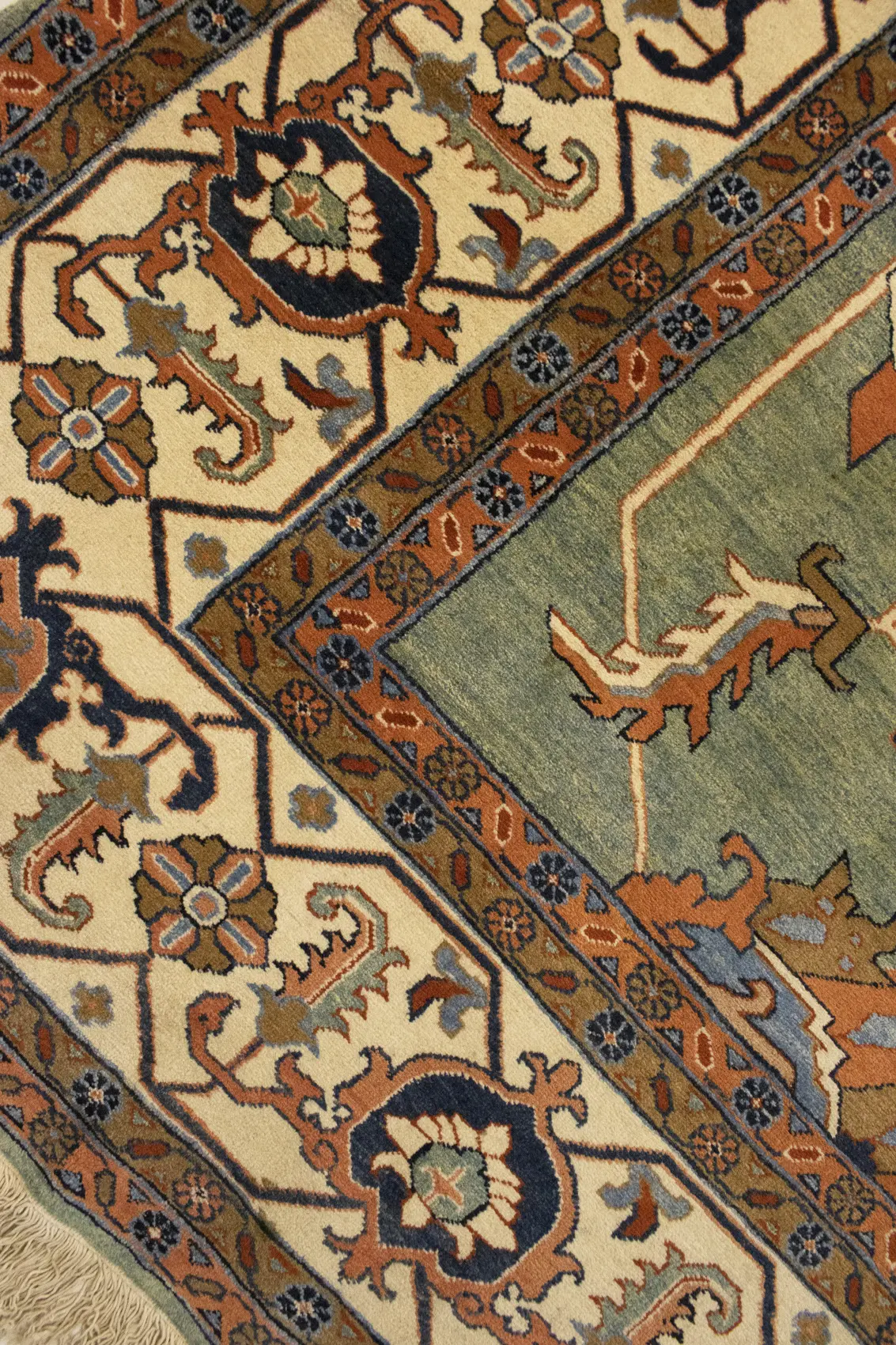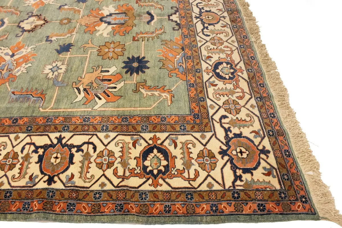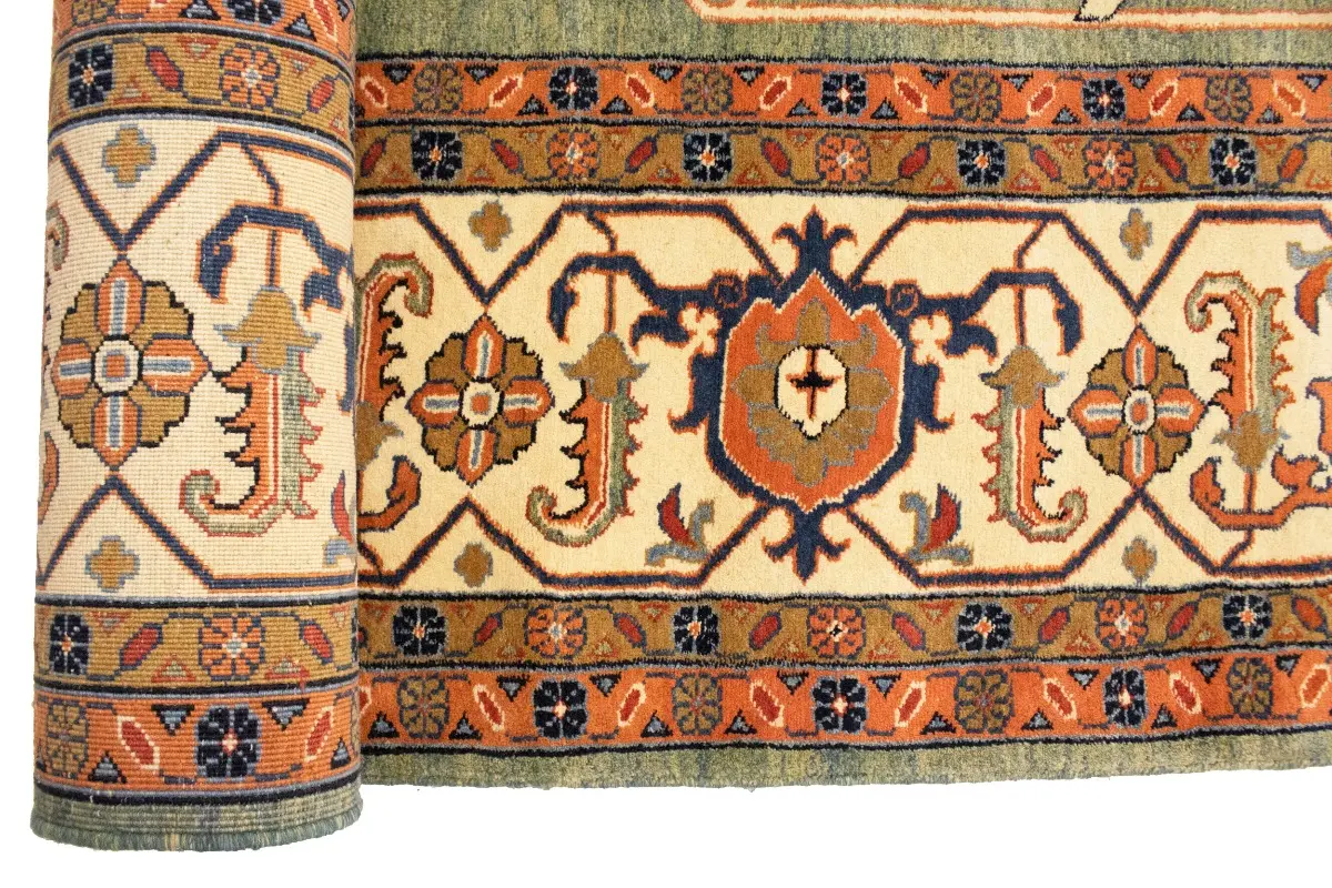 Hand Knotted 10X27 green Persian rug made with natural dyes (fine wool pile and cotton foundation), superior knot count, and appealing ancient designs. This Oriental rug never will go out of style and would be among your most valuable treasures.