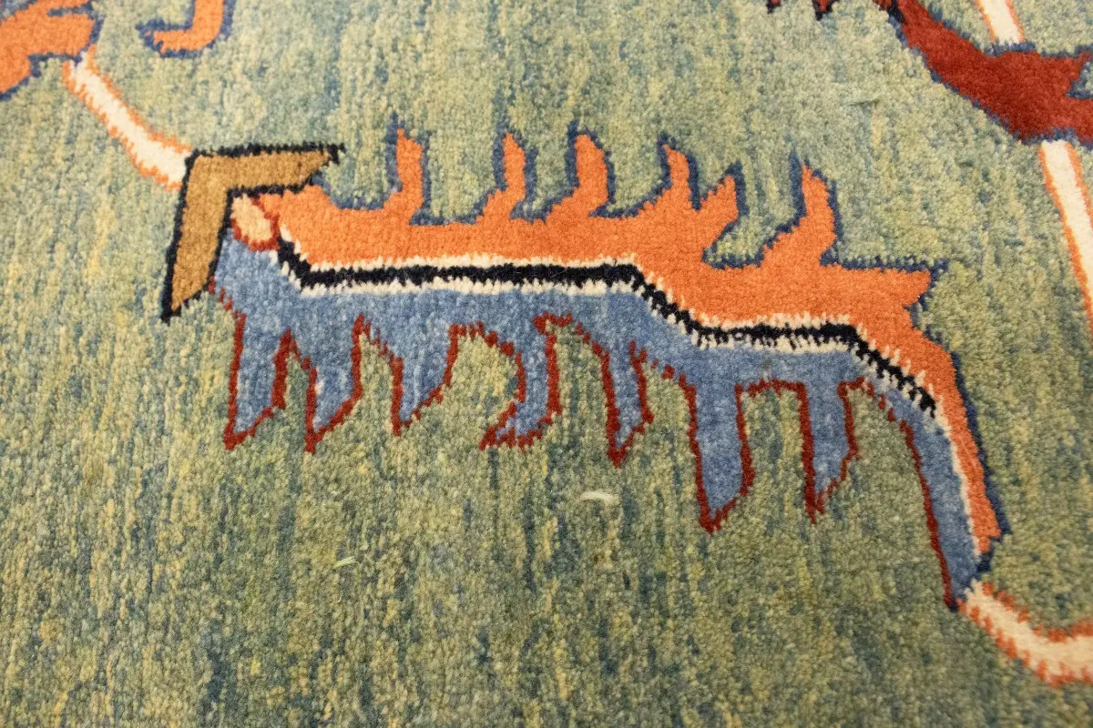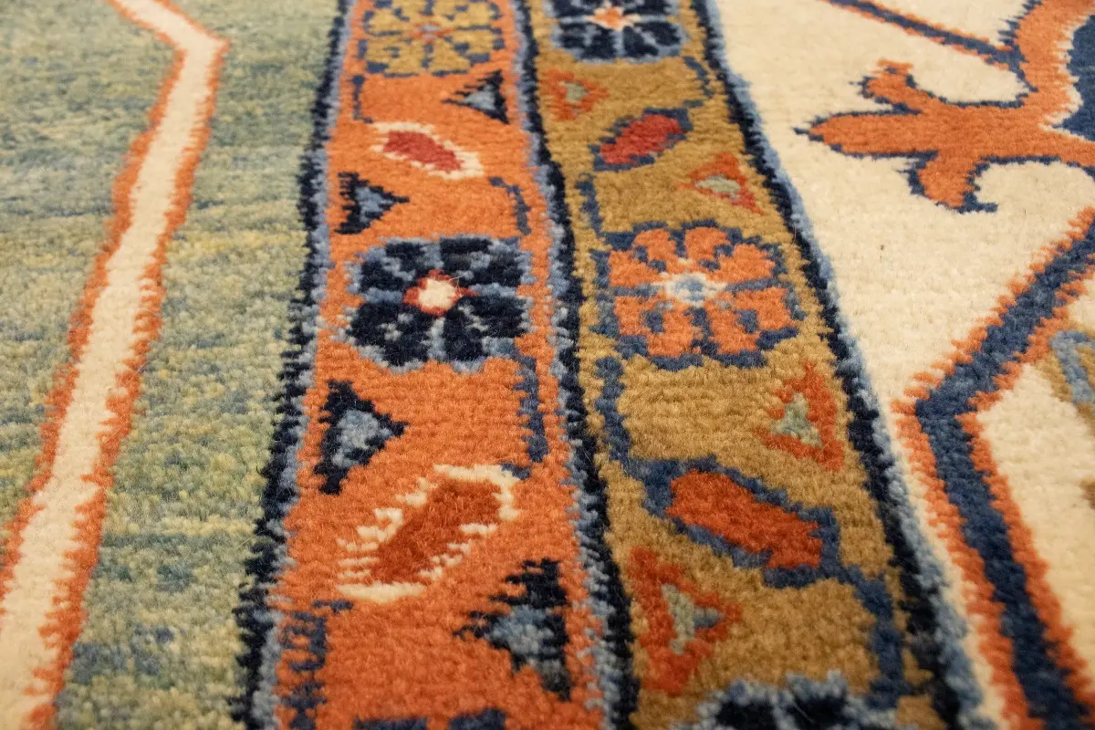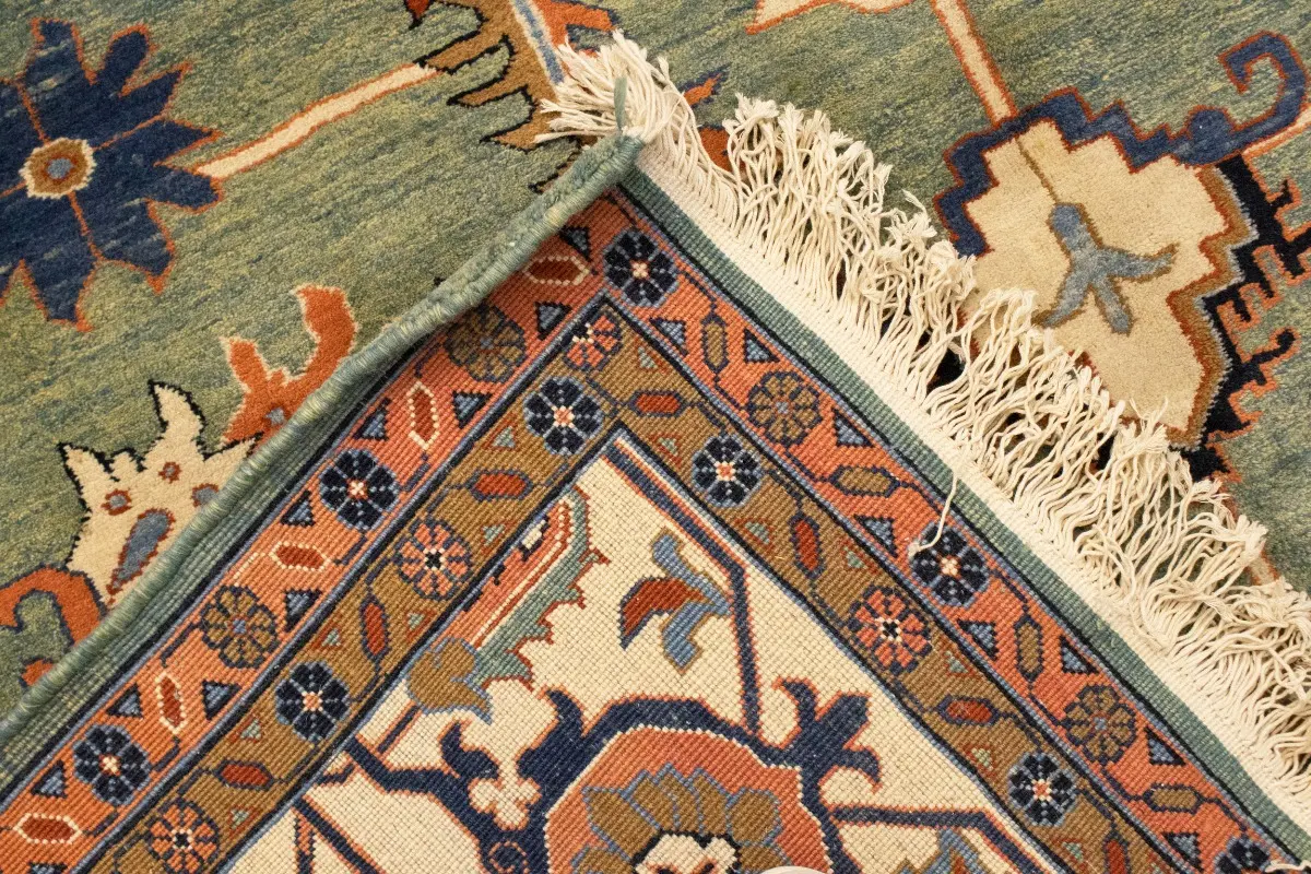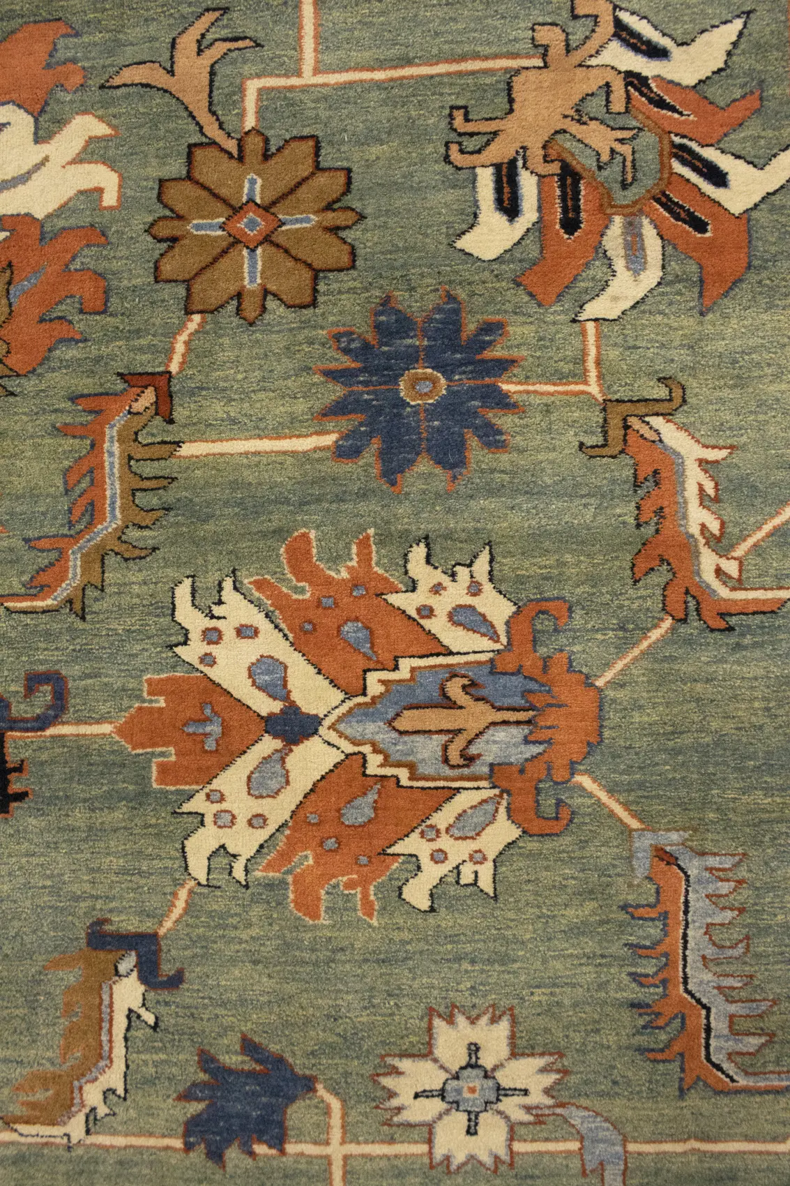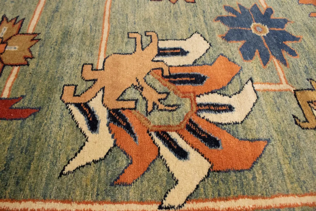 This original 10X27 green vintage Persian rug was crafted by the hands of skilled weavers enthused by a variety of lovely artistic designs, to recreate the aged look of the unique piece with a richness of color and beautifully elaborated floral background field. What set this traditional Oriental area rug from the others are the material and dye used (wool pile and cotton foundation), knot count, ancient designs, fantastic grades, and its regional historical connection: it has deep roots, from the story of the people who produced it to the meaning of the symbols and colors displayed across its canvas that have been praised for centuries. This classic home décor carpet will be completely cozy and inviting that never will go out of style! Also, this Oriental rug would be among your most valuable treasures, it is a great investment that increase in value over time, and it will last for generations because was woven with high-quality, all-natural wool; it won’t rip, tear, or shed. Environmentally friendly, opulent yet affordable; this Persian rug will give you a thorough amount of character to help define your living space with sophistication and warmth that will capture the eyes and attention of your audience (homeowners, designers, decorators, family and friends). RT-2089