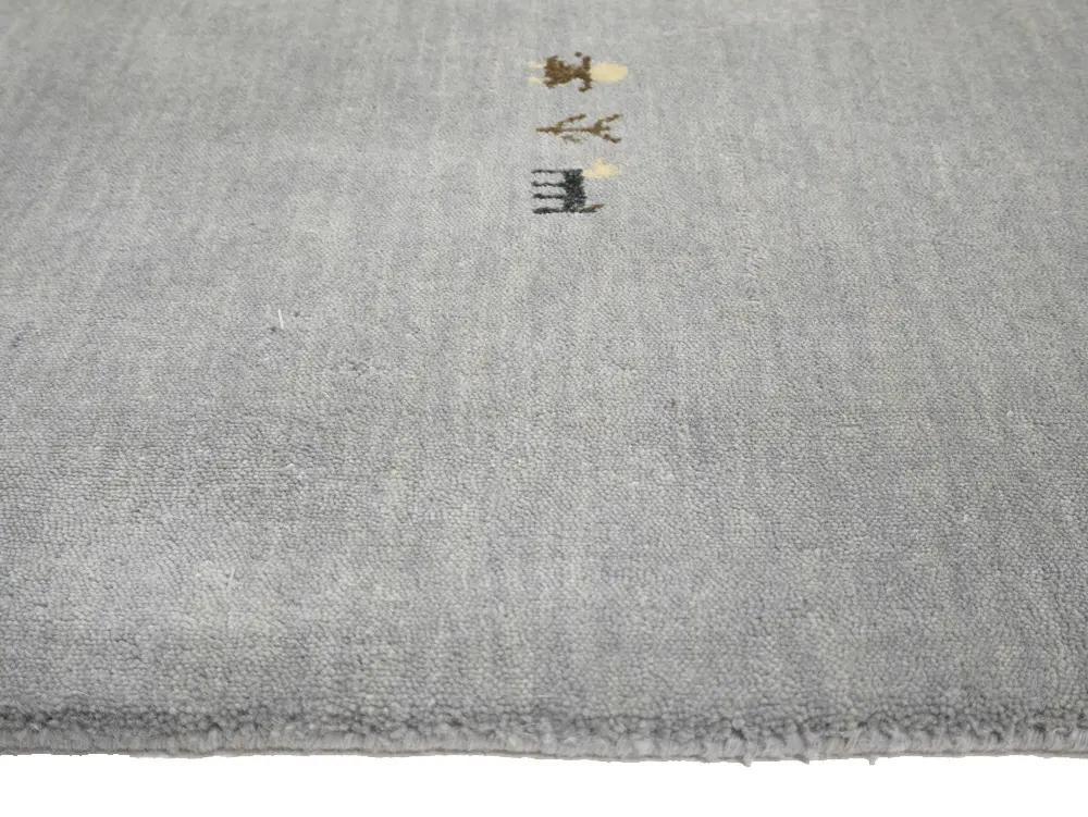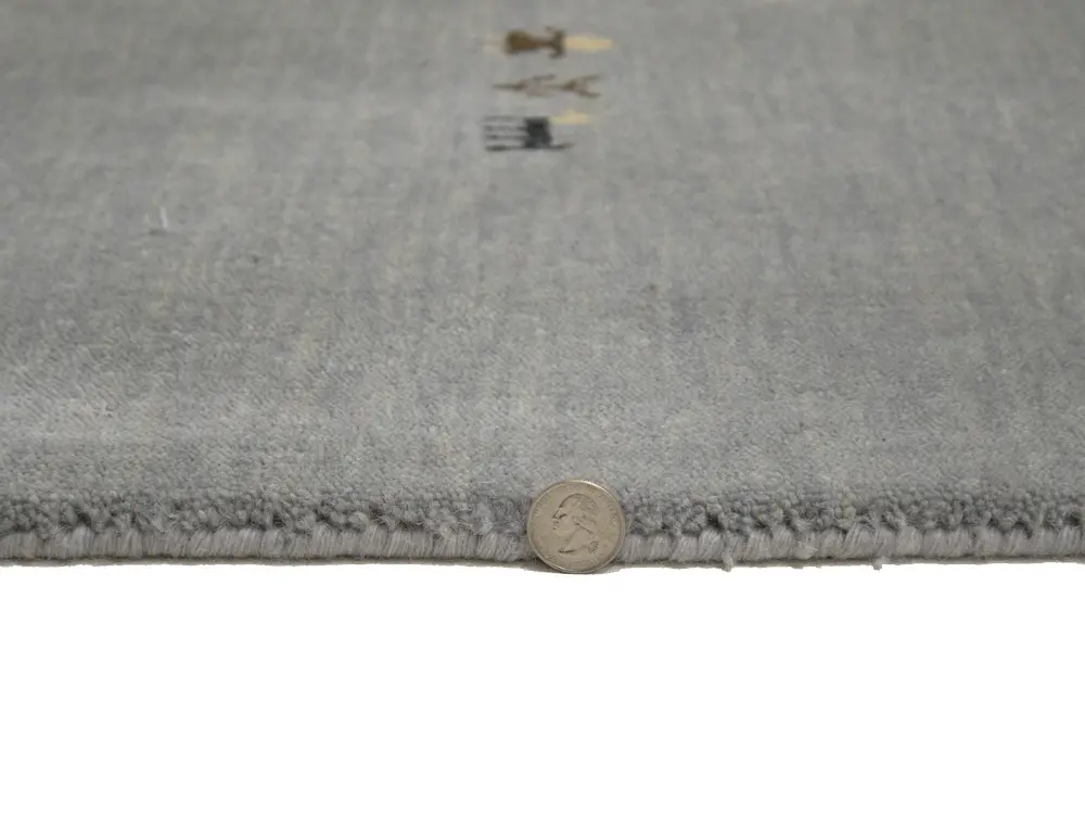 This hand-loomed Oriental rug from India features a modern, Pictorial design that seamlessly integrates traditional craftsmanship with contemporary style, showcasing a striking blue primary color. It provides a luxuriant softness and durability underfoot, as it is constructed from premium wool with a cotton foundation. The rug is optimized for high-traffic areas due to its medium pile height and knot density of 100 knots per square inch, which ensures durability and comfort. This rug, which is in exceptional condition and was recently manufactured, is an ideal complement to any contemporary setting, providing both versatility and timeless elegance.