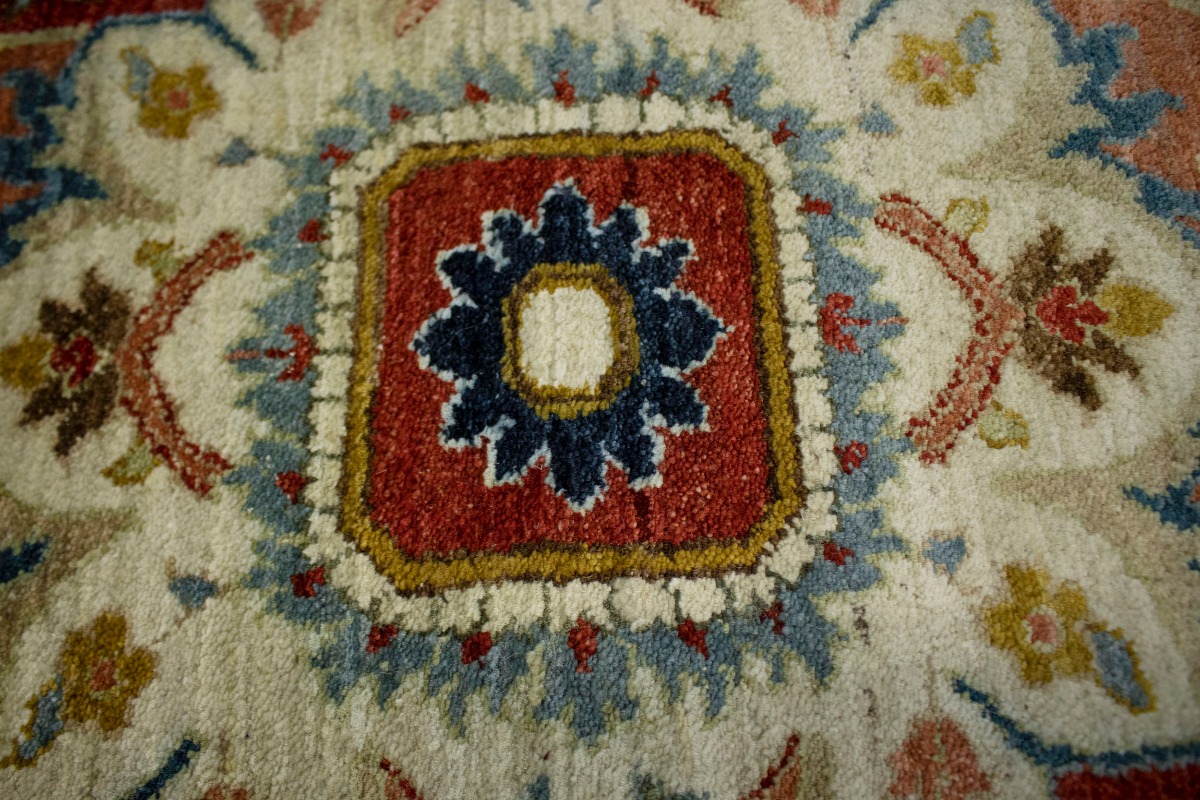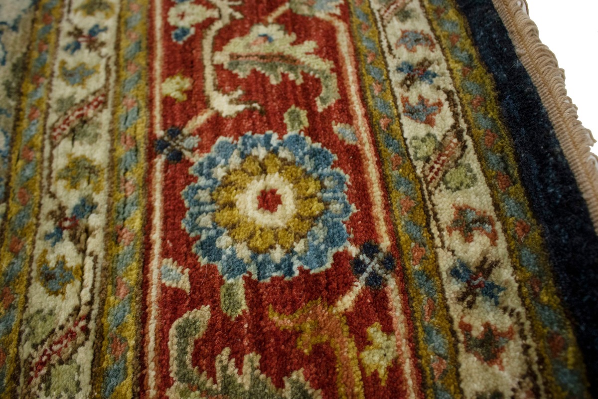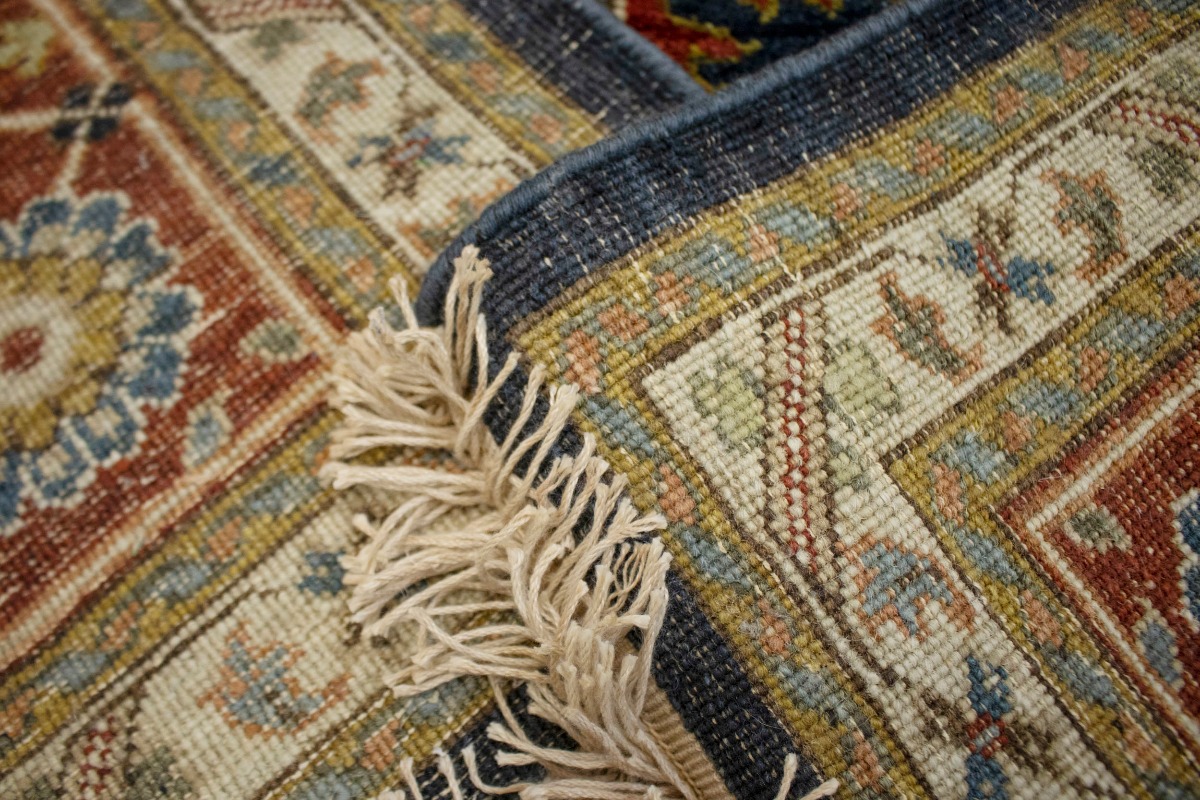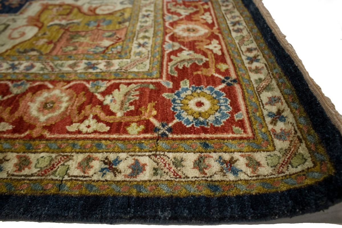 This original 6X9 blue new Oriental rug was finely knotted by the hands of weavers influenced by a variety of amazing artistic designs, to recreate the aged look of the exceptional piece with a richness of color and embellished background field. What set this vintage style Oriental area rug from the others are the material and dye used (wool pile and cotton foundation), knot count, antique designs, fantastic grades, and its regional historical connection: it has deep roots, from the story of the people who produced it to the meaning of the symbols and colors displayed across its canvas that have been praised for centuries. This Indian home décor carpet will be completely cozy and inviting that never will go out of style! Also, this Oriental rug would be among your most valuable treasures, it is a great investment that increase in value over time, and it will last a lifetime because was woven with high-quality, all-natural wool. Eco-friendly, opulent yet affordable; this rug will give you an extra pop of character to help define your home environment with luxury and warmth that will capture the eyes and attention of your audience (homeowners, designers, decorators, family and friends). OT-4828