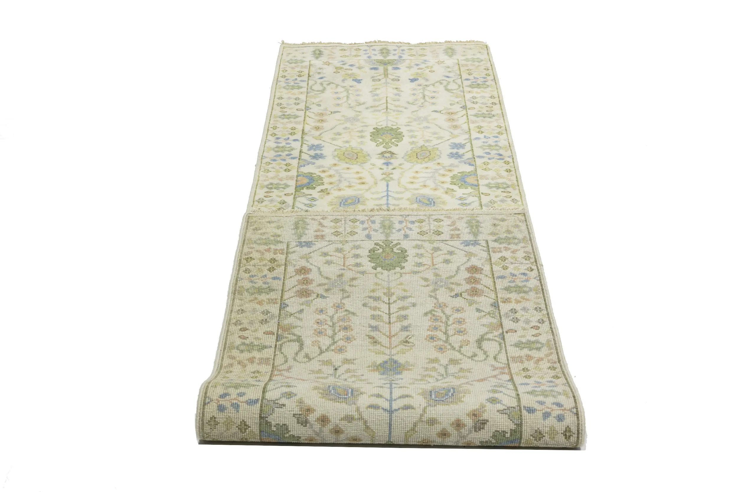 This genuine 2'6X10 ivory new Oriental runner was made by the hands of gifted weavers inspired by a variety of spectacular artistic designs, to recreate the aged look of the original piece with a richness of color and ornately patterned background field. What set this vintage style Oriental area runner from the others are the material and dye used (wool pile and cotton foundation), knot count, ancient designs, fantastic grades, and its regional historical connection: it has deep roots, from the story of the people who produced it to the meaning of the symbols and colors displayed across its canvas that have been praised for centuries. This Indian home décor carpet will be completely cozy and inviting that never will go out of style! Also, this Oriental runner would be among your most valuable treasures, it is a great investment that accrues value over time, and it will last for generations because was woven with high-quality, all-natural wool. Environmentally friendly, opulent yet affordable; this rug will give you a thorough amount of character to help define your living space with elegance and warmth that will capture the eyes and attention of your audience (homeowners, designers, decorators, family and friends).