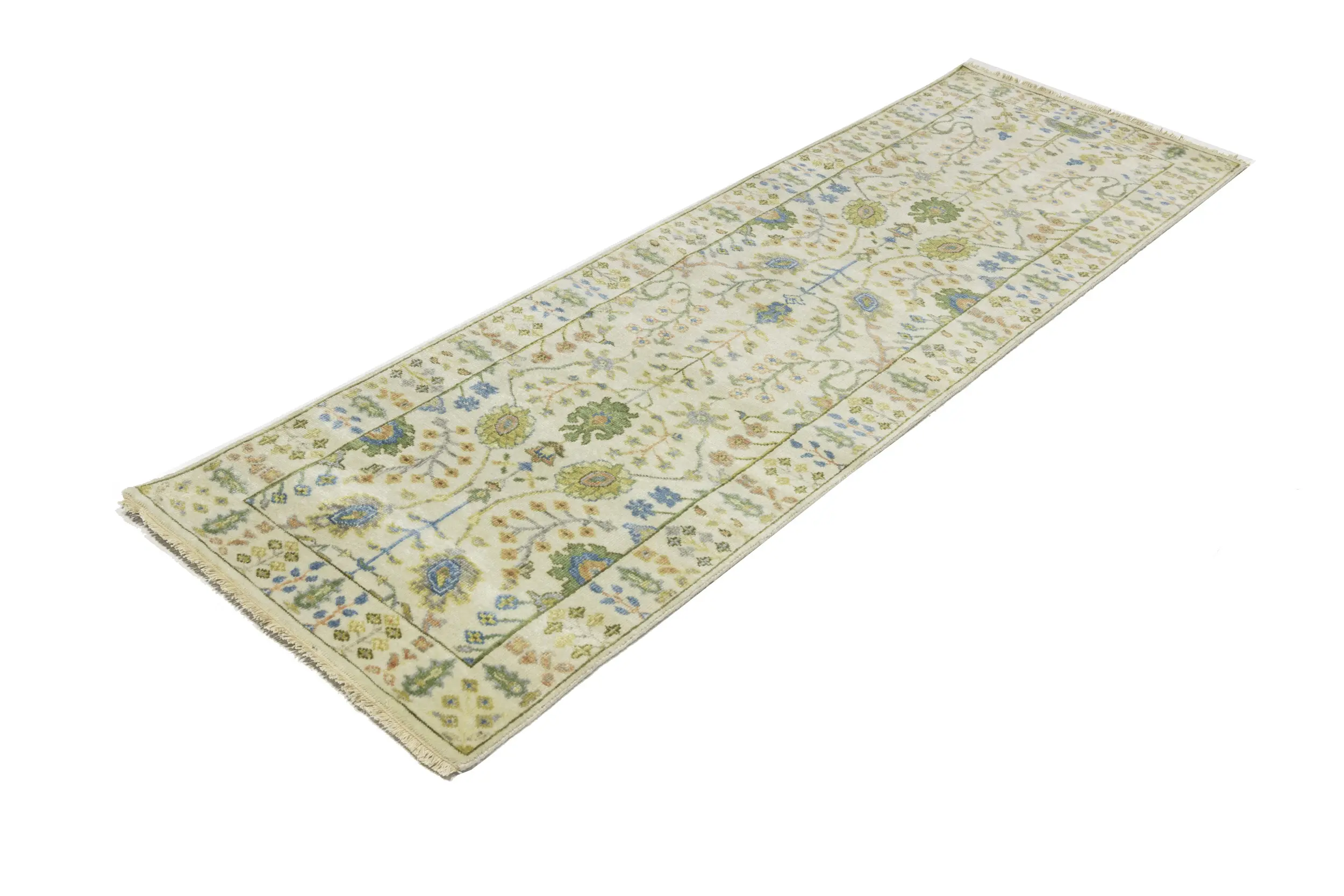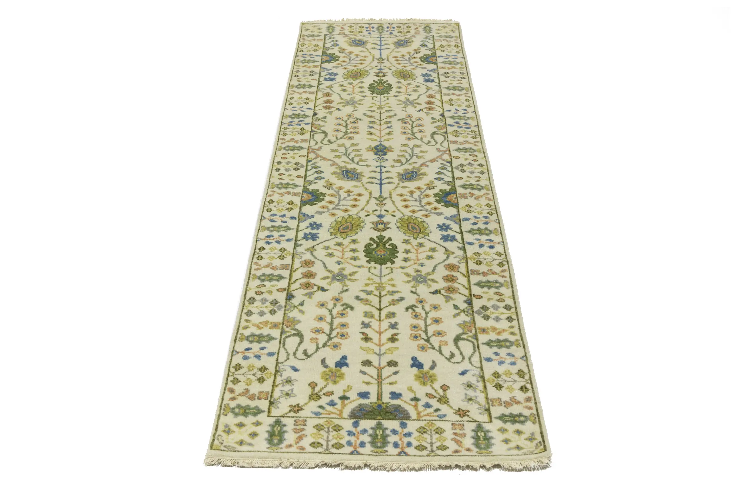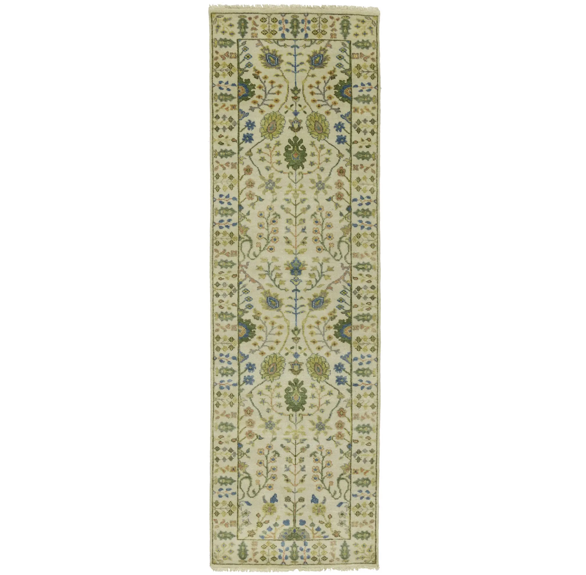 Handmade 2'5X8 ivory oriental runner made with vegetable dyes (fine wool pile and cotton foundation), superior knot count, and appealing ancient designs. This Oriental runner never will go out of style and would be among your most valuable treasures.