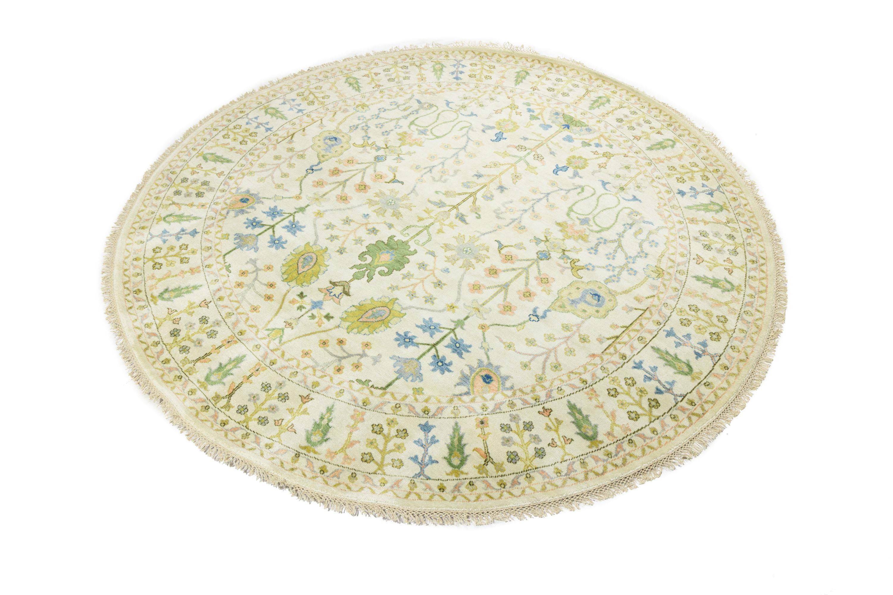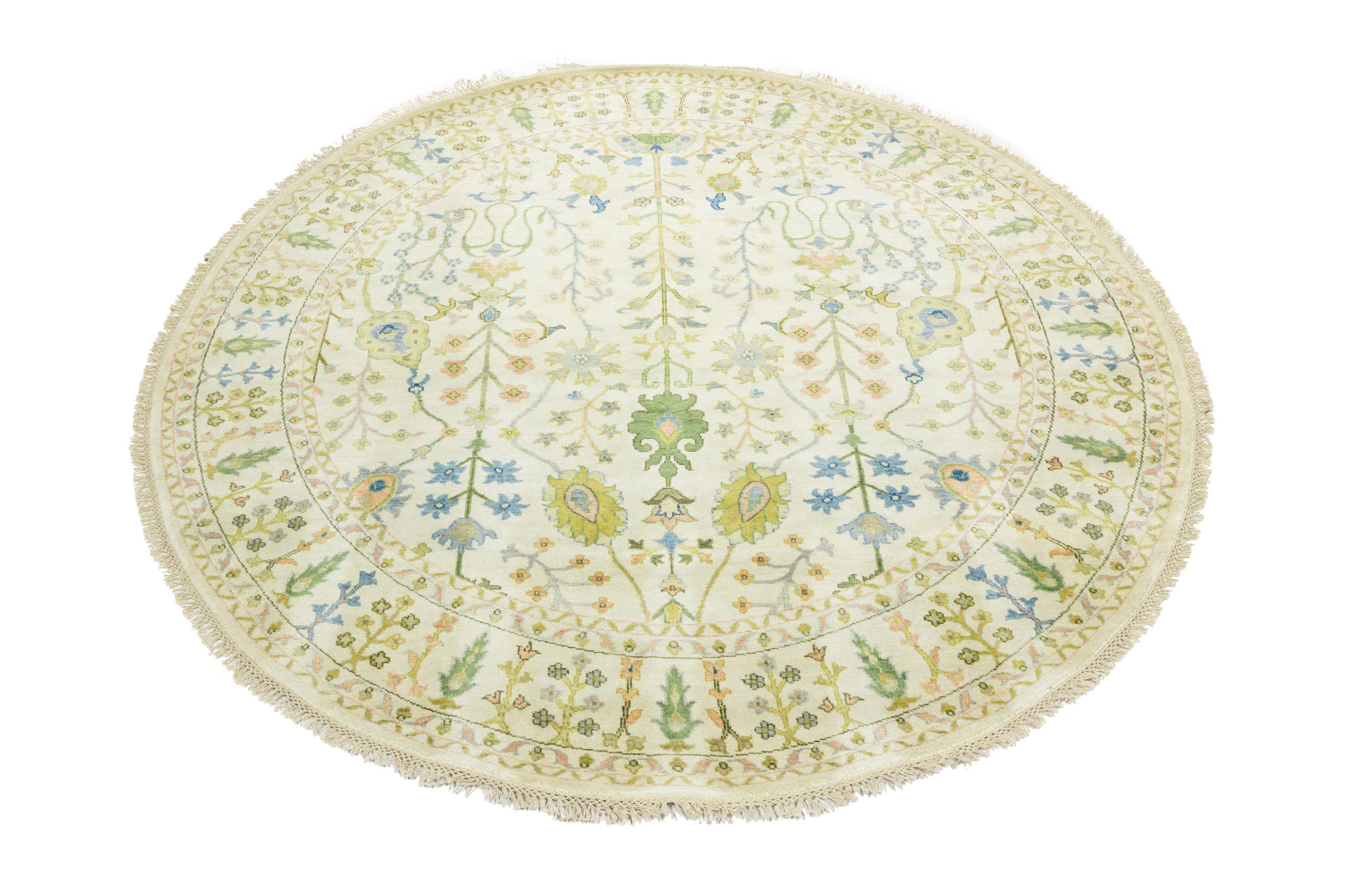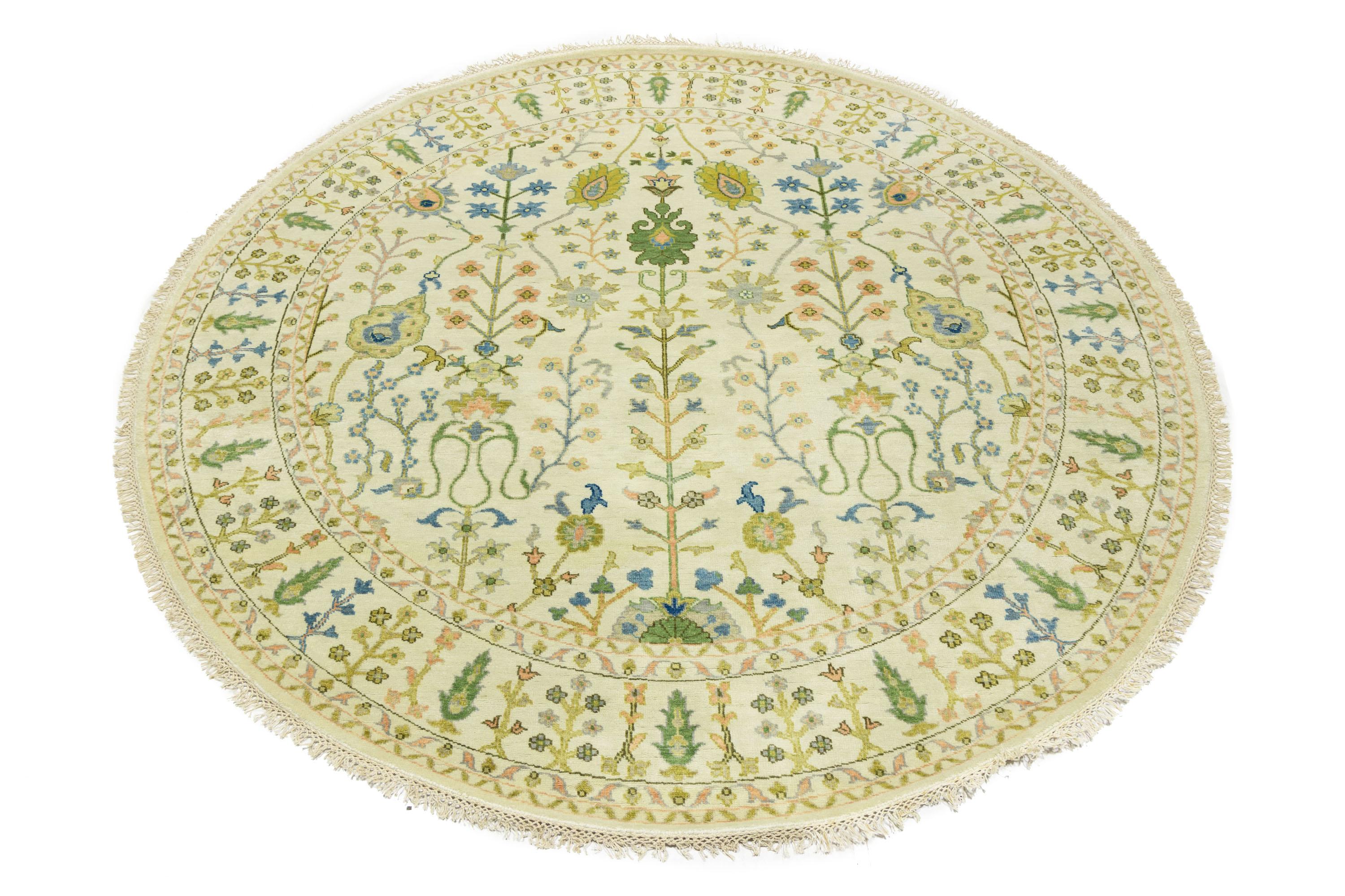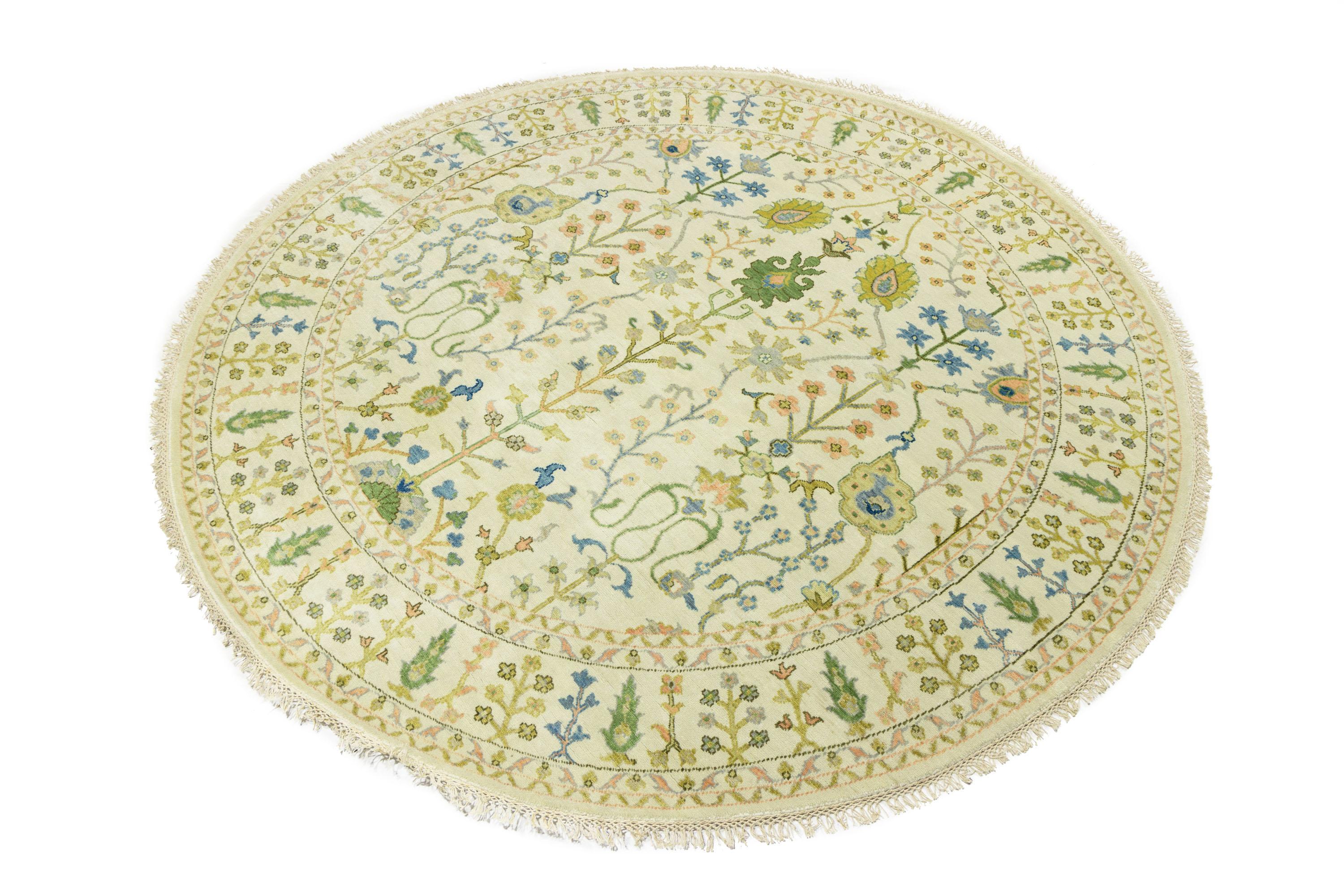 This original 8x8 Ivory new Oriental Round rug was finely knotted by the hands of weavers influenced by a variety of amazing artistic designs, to recreate the aged look of the exceptional piece with a richness of color and embellished background field. What set this vintage style Oriental area rug from the others are the material and dye used (wool pile and cotton foundation), knot count, antique designs, fantastic grades, and its regional historical connection: it has deep roots, from the story of the people who produced it to the meaning of the symbols and colors displayed across its canvas that have been praised for centuries. This Indian home décor carpet will be completely cozy and inviting that never will go out of style! Also, this Oriental rug would be among your most valuable treasures, it is a great investment that increase in value over time, and it will last a lifetime because was woven with high-quality, all-natural wool. Eco-friendly, opulent yet affordable; this rug will give you an extra pop of character to help define your home environment with luxury and warmth that will capture the eyes and attention of your audience (homeowners, designers, decorators, family and friends). OT-11955
