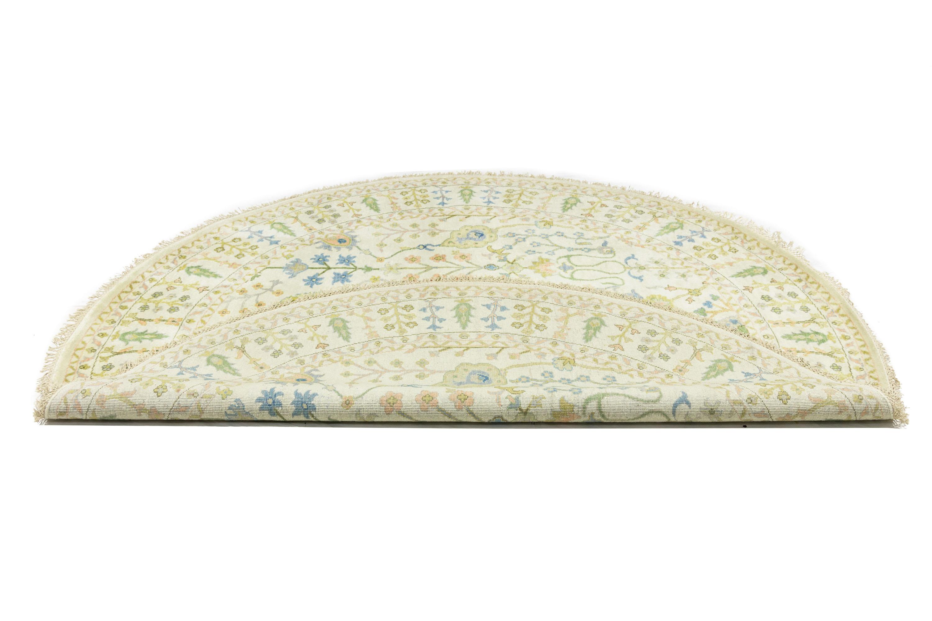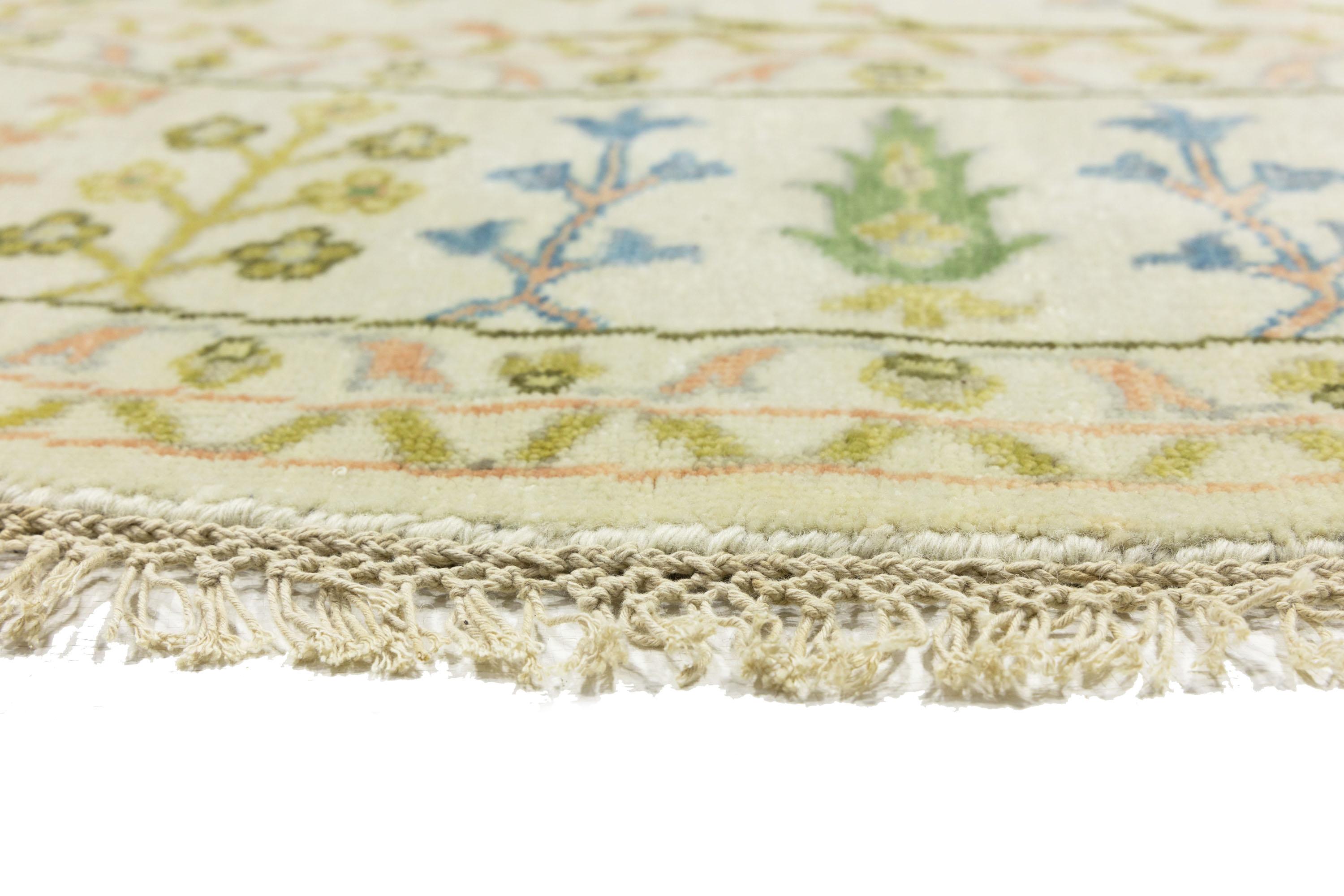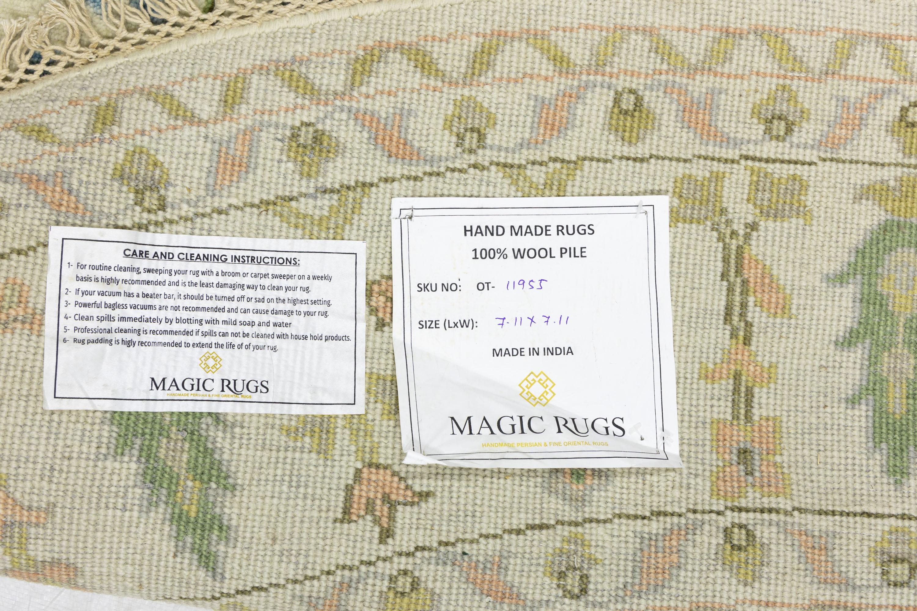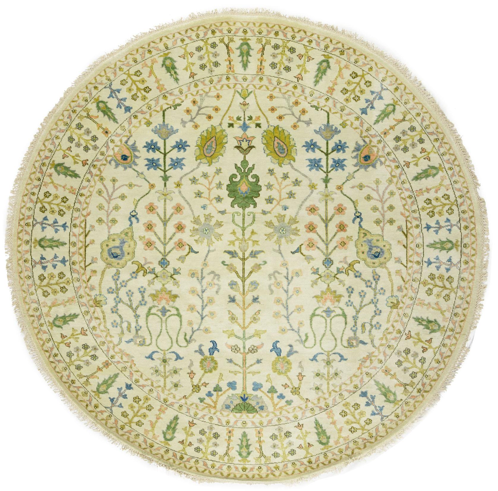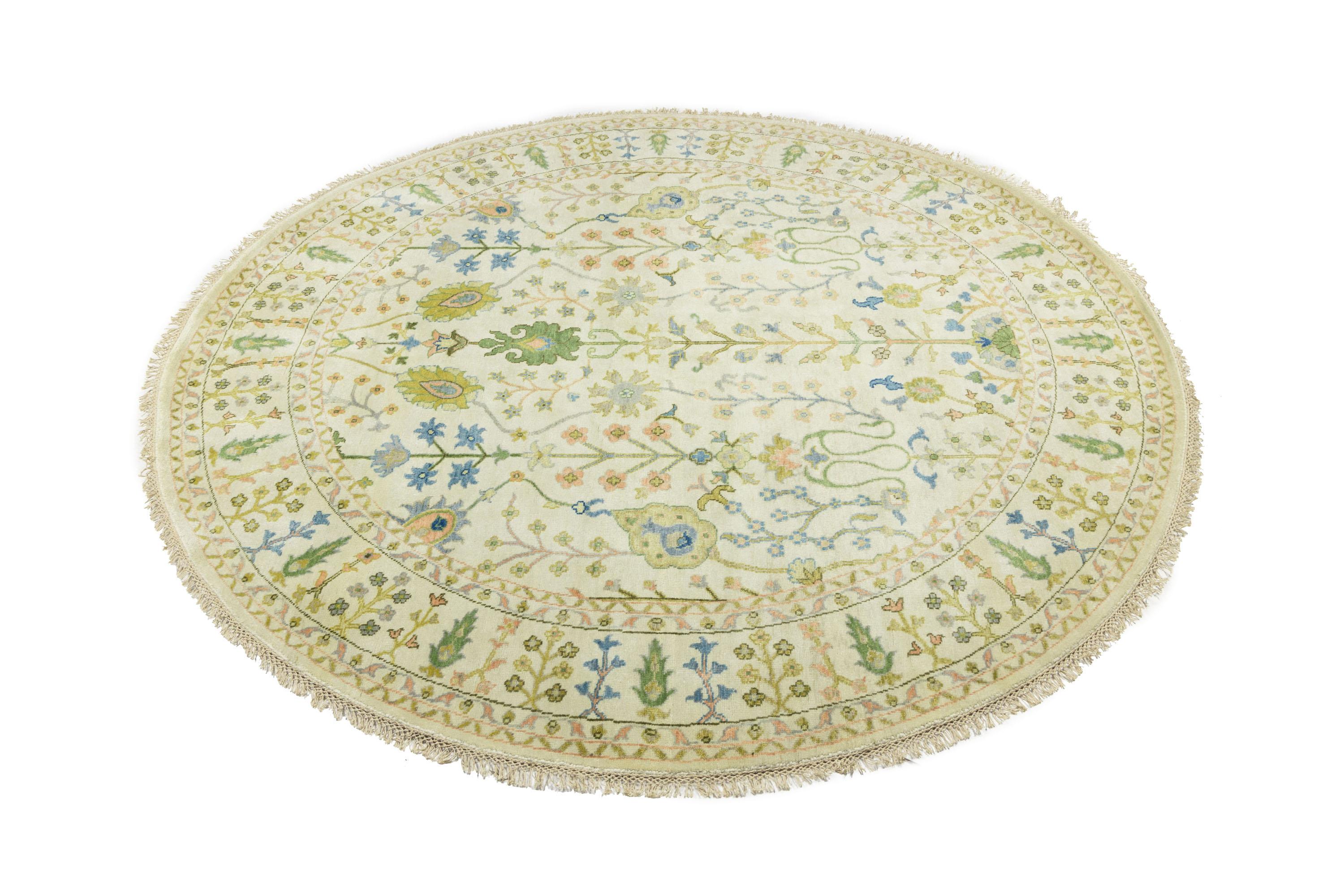 This original 8x8 Ivory new Oriental Round rug was finely knotted by the hands of weavers influenced by a variety of amazing artistic designs, to recreate the aged look of the exceptional piece with a richness of color and embellished background field. What set this vintage style Oriental area rug from the others are the material and dye used (wool pile and cotton foundation), knot count, antique designs, fantastic grades, and its regional historical connection: it has deep roots, from the story of the people who produced it to the meaning of the symbols and colors displayed across its canvas that have been praised for centuries. This Indian home décor carpet will be completely cozy and inviting that never will go out of style! Also, this Oriental rug would be among your most valuable treasures, it is a great investment that increase in value over time, and it will last a lifetime because was woven with high-quality, all-natural wool. Eco-friendly, opulent yet affordable; this rug will give you an extra pop of character to help define your home environment with luxury and warmth that will capture the eyes and attention of your audience (homeowners, designers, decorators, family and friends). OT-11955