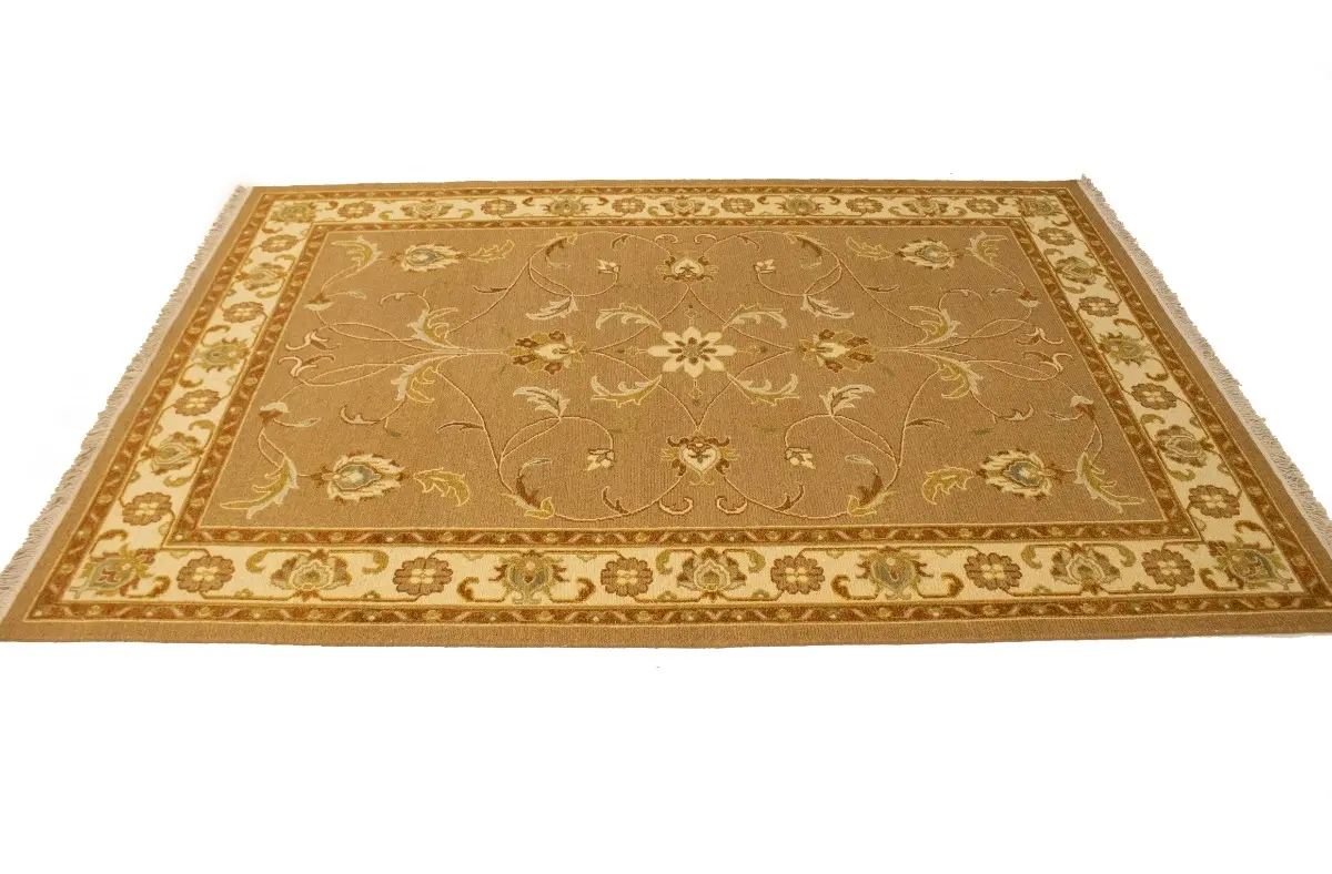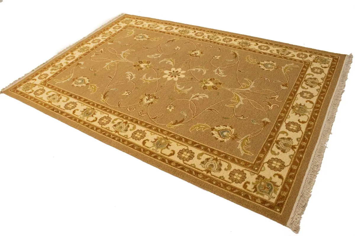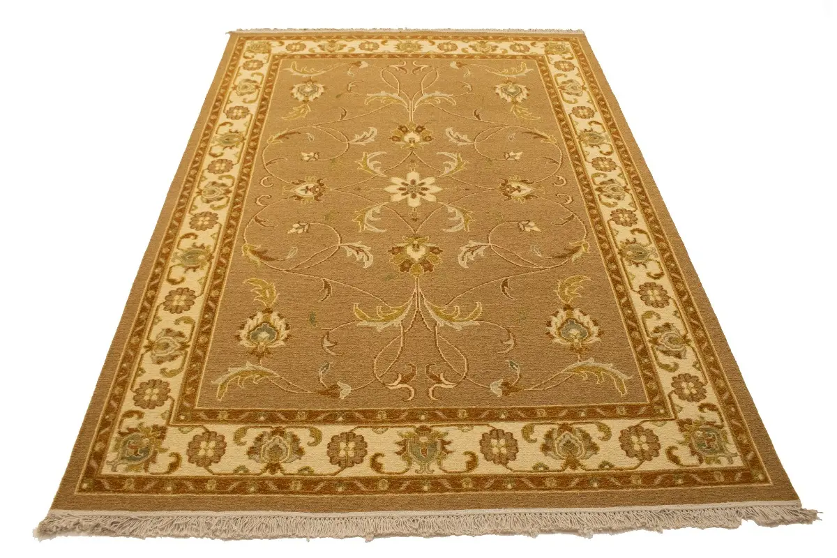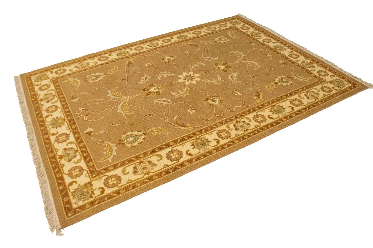 Handmade 6X8 khaki Oriental rug made with vegetable dyes (fine wool pile and cotton foundation), superior knot count, and appealing ancient designs. This Oriental rug never will go out of style and would be among your most valuable treasures.