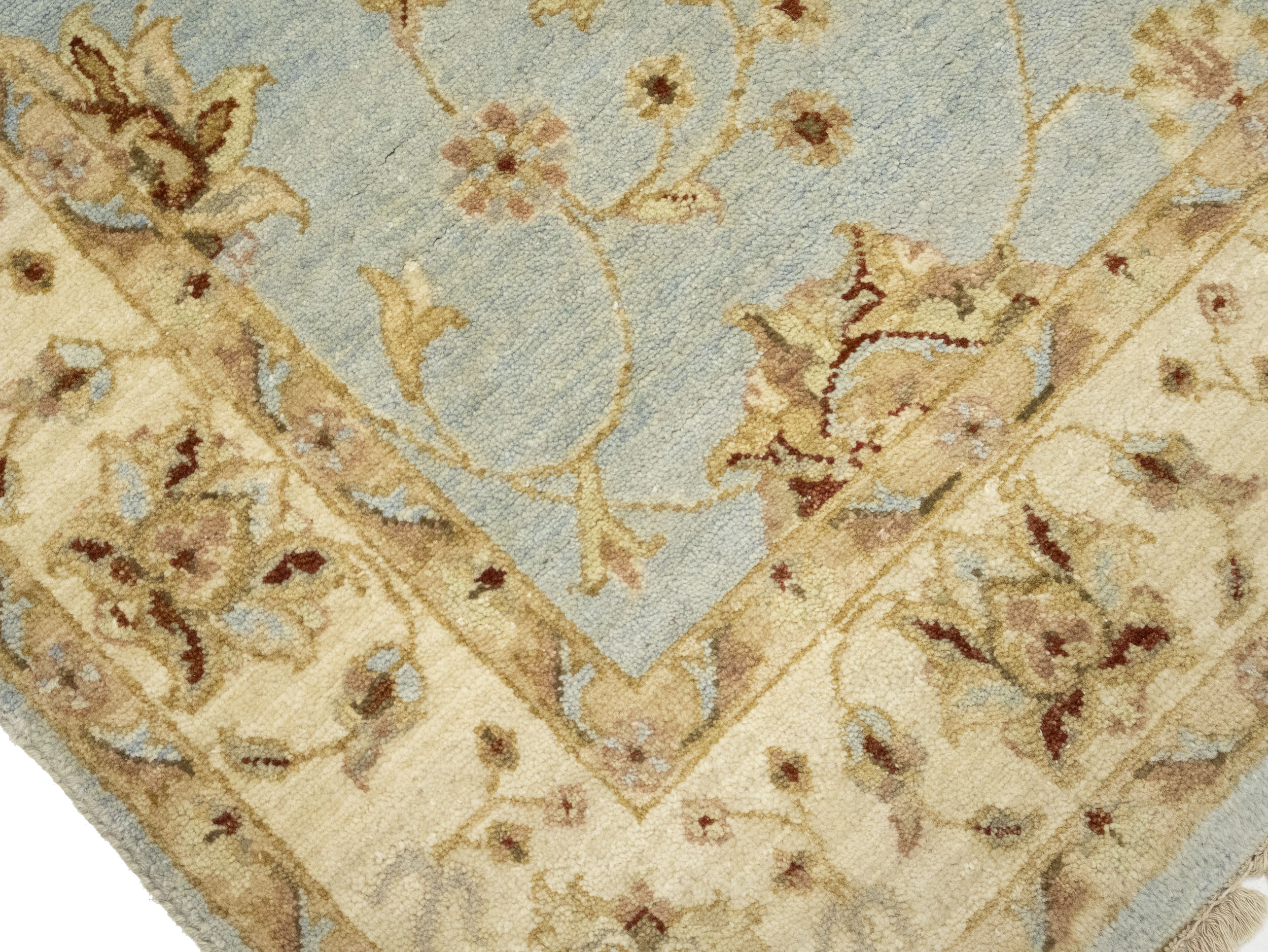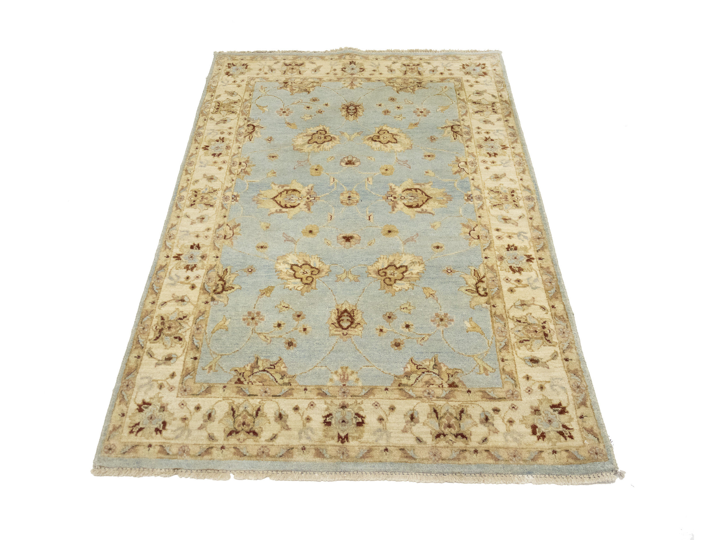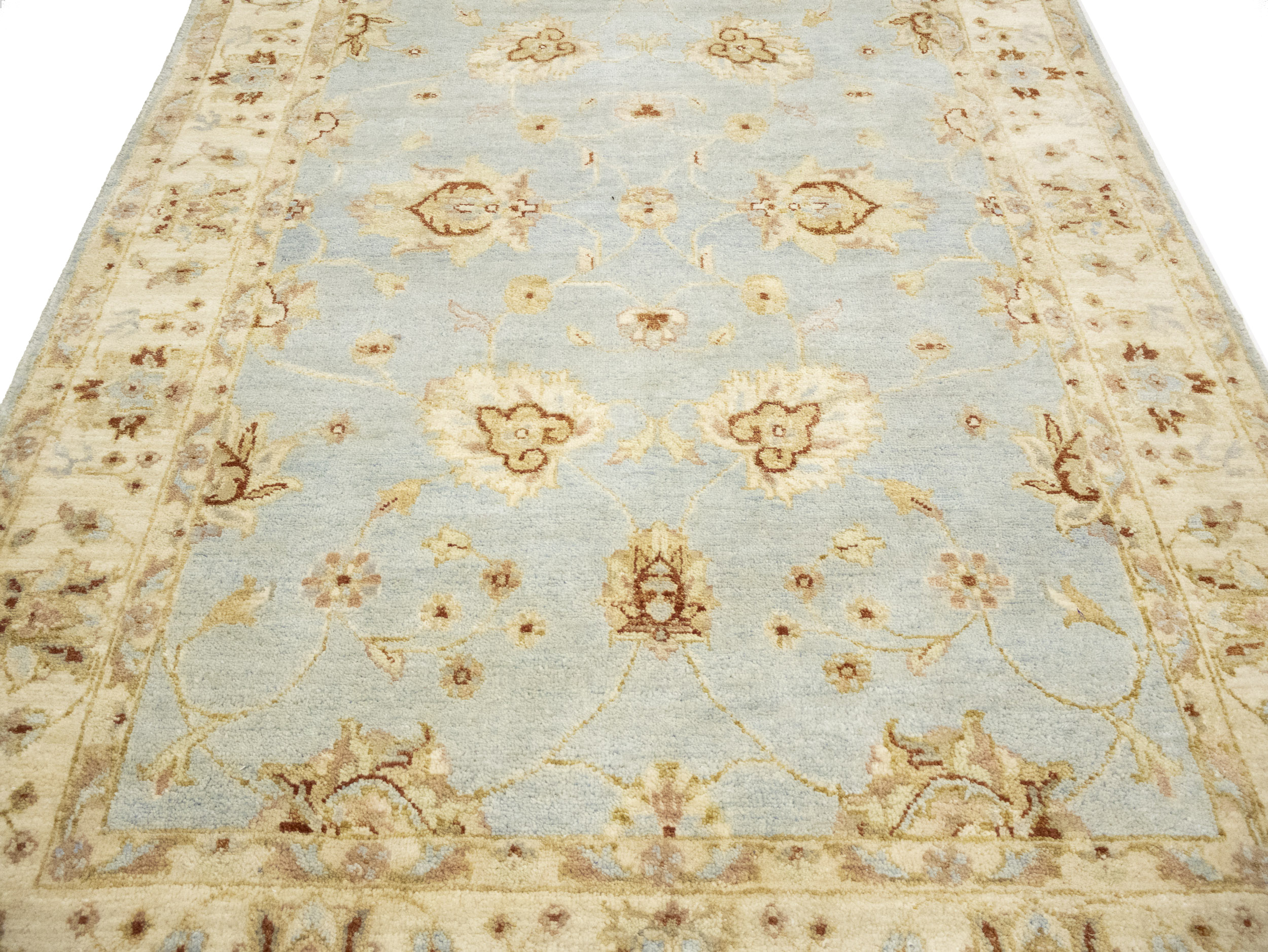 Handmade 4X6 light blue oriental rug made with vegetable dyes (fine wool pile and cotton foundation), exceptional knot count, and appealing ancient designs. This Oriental rug never will go out of style and would be among your most valuable treasures.